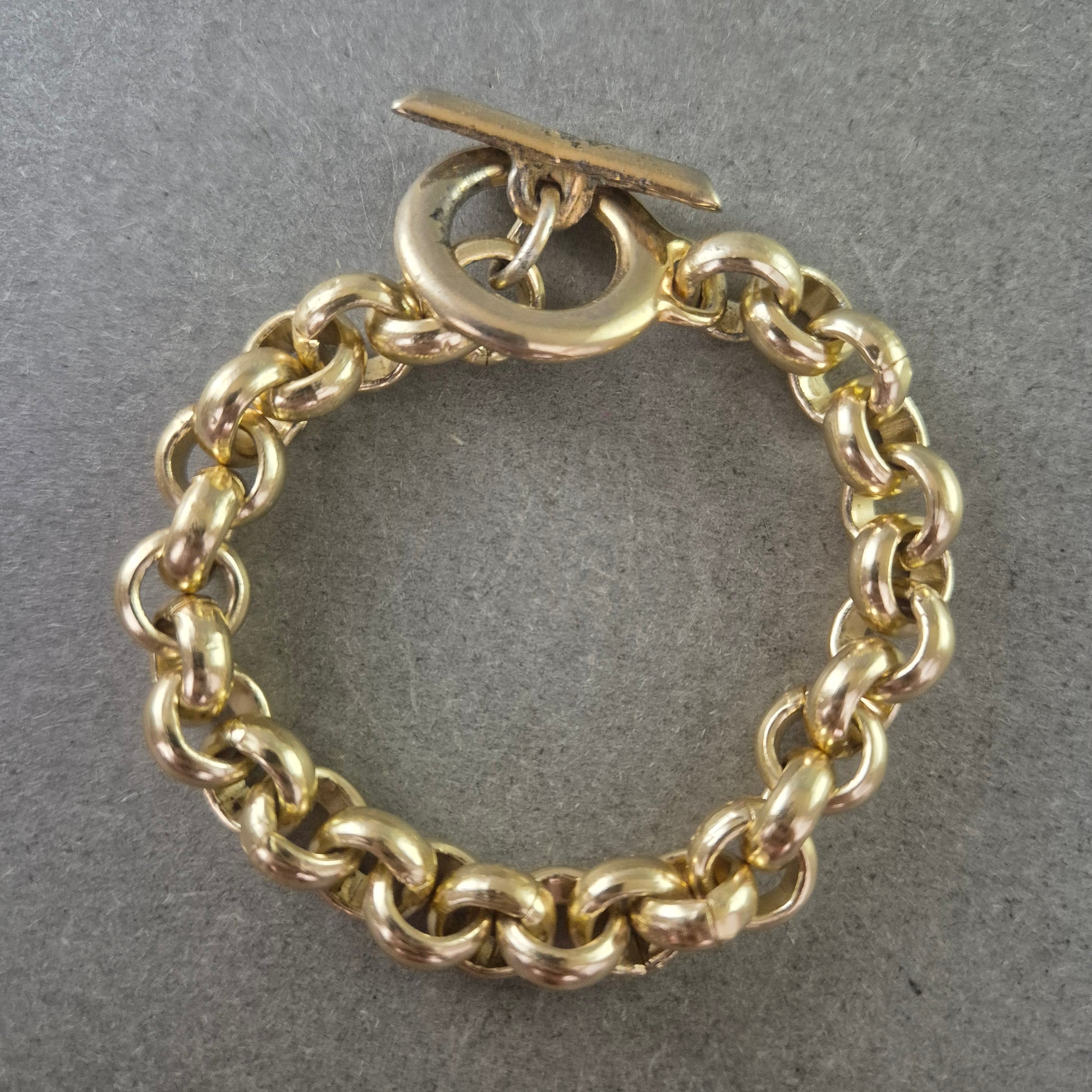 Dieses Damen Armband präsentiert sich in einer auffälligen Gliederkette mit glänzender Vergoldung. Der massive Look verleiht dem Schmuckstück eine besondere Ausdruckskraft, während der praktische Knebelverschluss für sicheren Halt sorgt und gleichzeitig als Design-Element dient. Ein markantes Accessoire, das sich perfekt zu eleganten und modernen Outfits kombinieren lässt.
