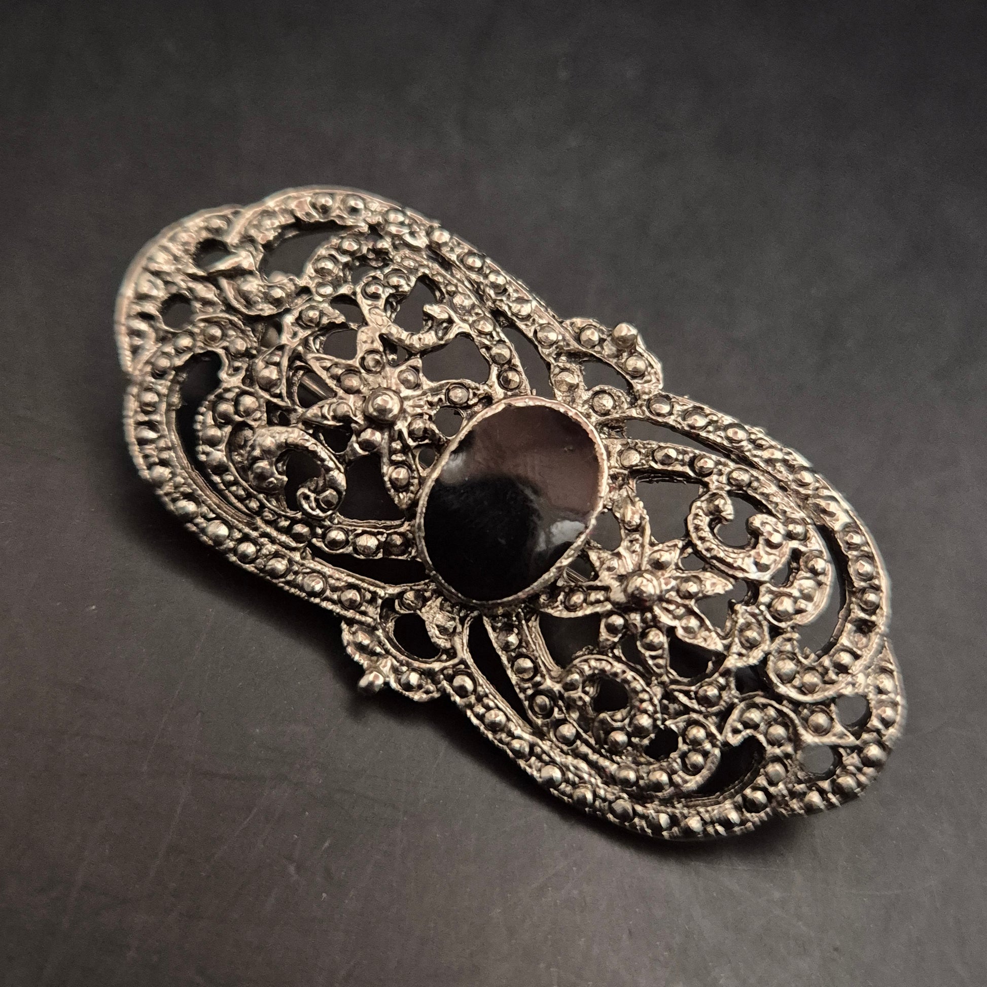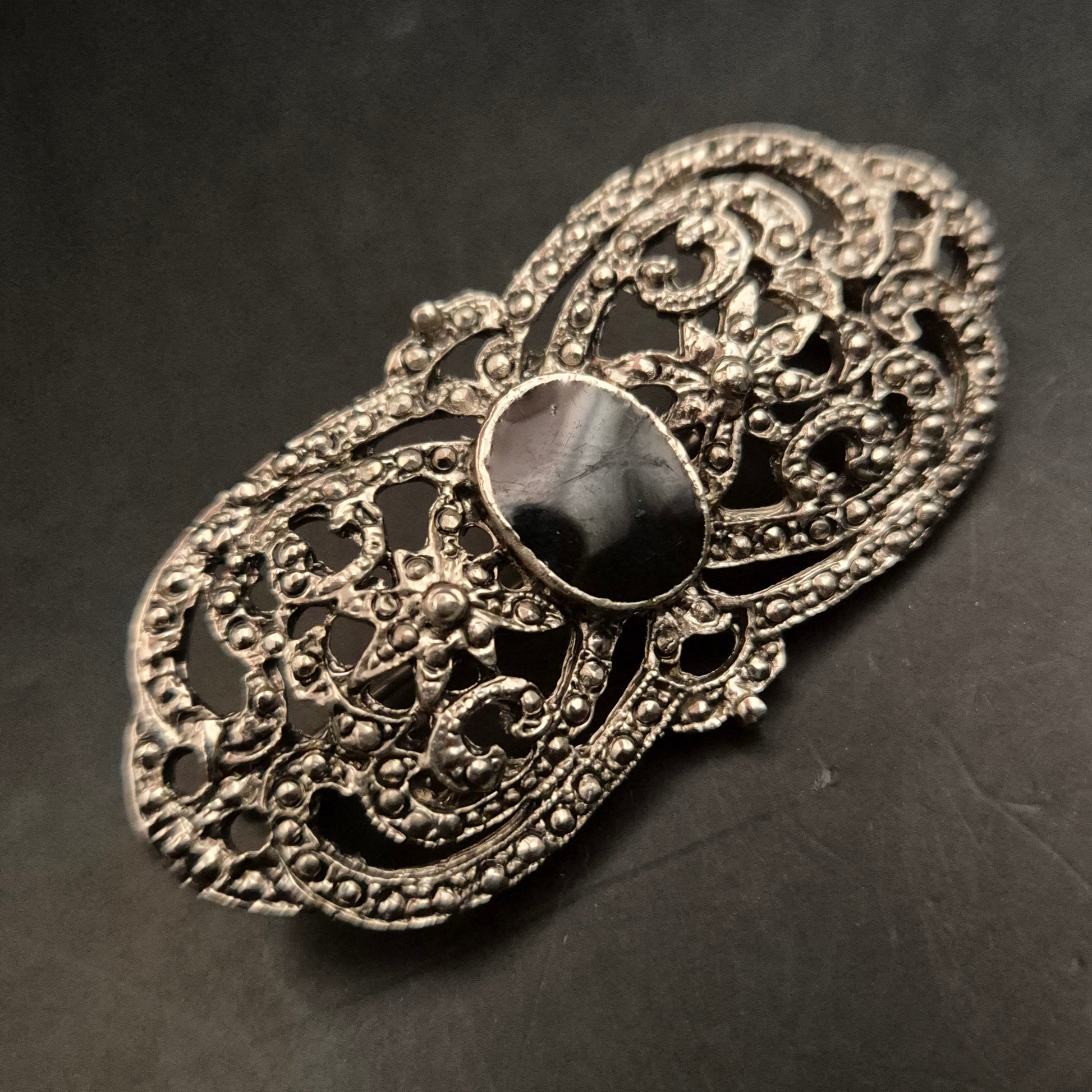 Verschnörkelte Vintage Brosche – Silberoptik mit schwarzem Stein