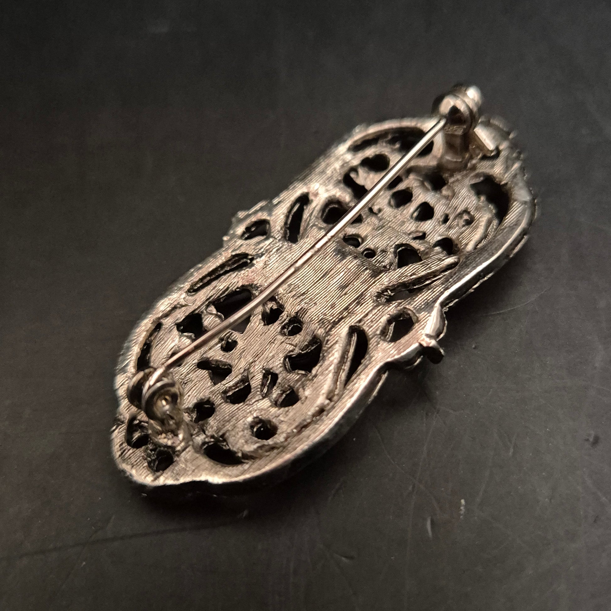 Diese elegante Vintage Brosche in Silberoptik besticht durch ihr kunstvoll filigranes Design und einen zentral eingefassten schwarzen Cabochon-Stein. Die detailreiche Ornamentik verleiht der Brosche eine antike, fast barocke Ausstrahlung – perfekt als stilvolles Accessoire für besondere Anlässe oder zum Aufwerten klassischer Outfits.