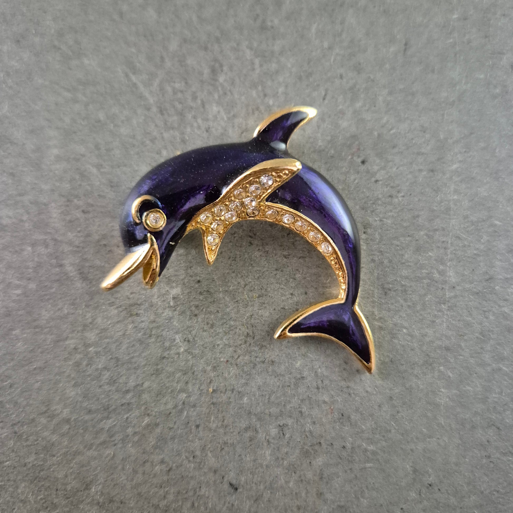 Diese bezaubernde Delfin-Brosche kombiniert maritimen Charme mit funkelnder Eleganz. Das tiefviolette Emaille-Finish wird durch eine geschwungene Silhouette und glitzernde Strasssteine unterstrichen. Umrahmt in goldfarbigem Metall, ist dieses Accessoire ein echter Hingucker – ideal für Tierliebhaber und Schmuckfans mit einem Faible für das Außergewöhnliche.