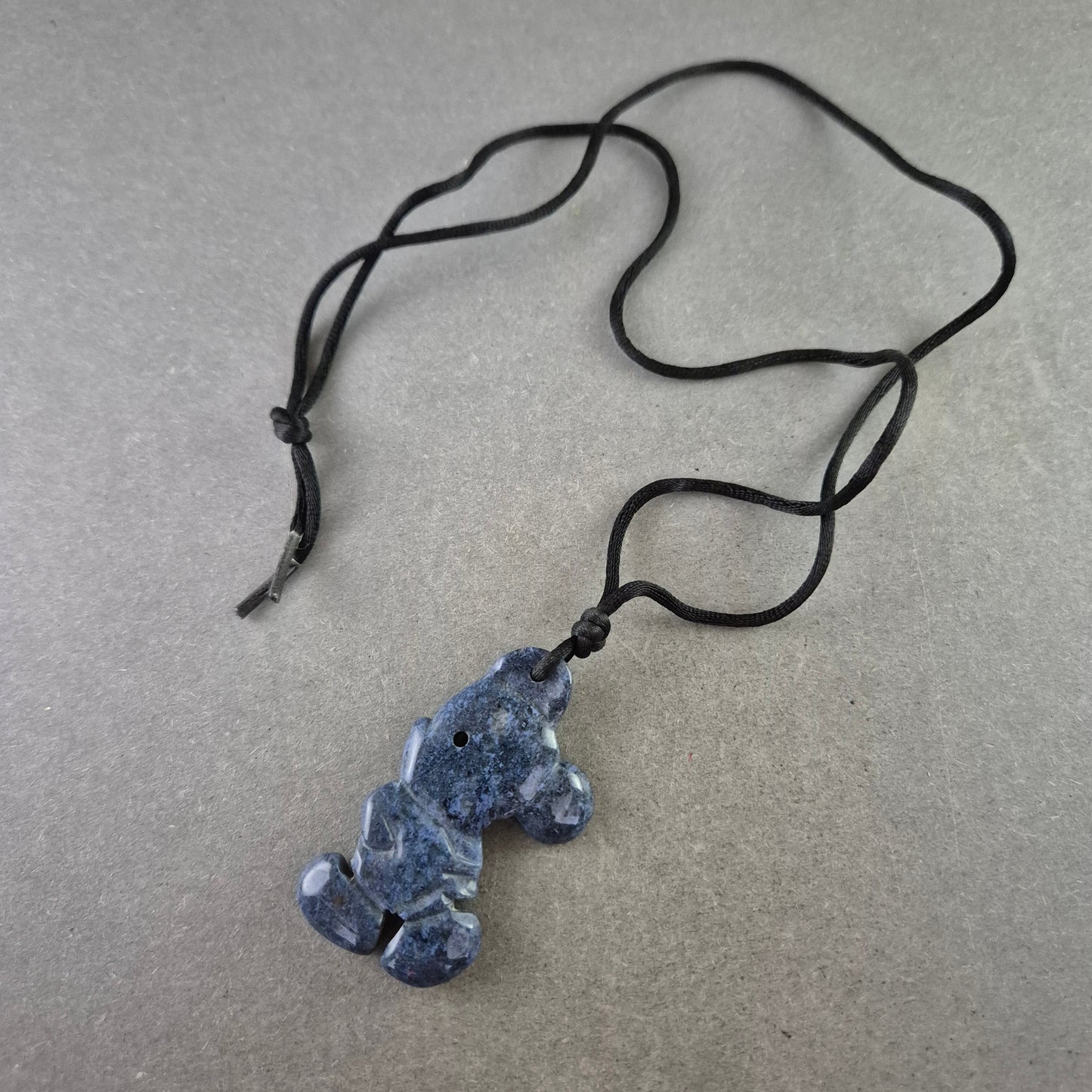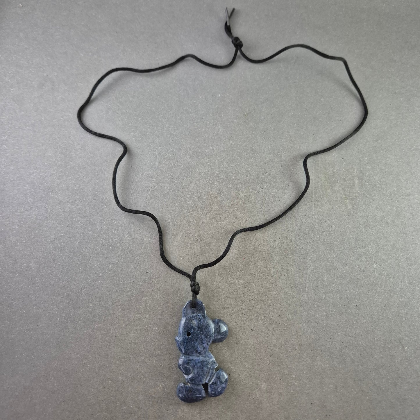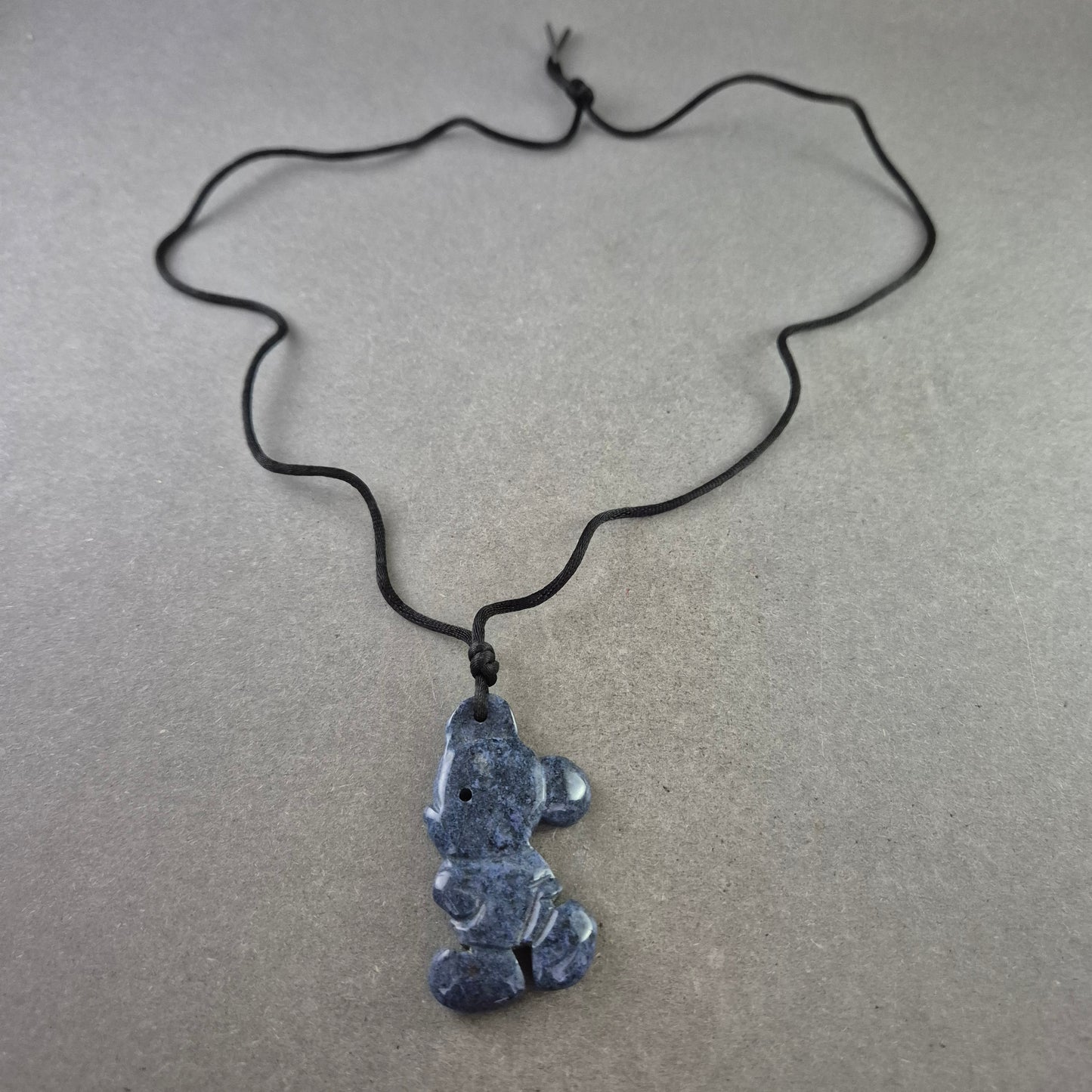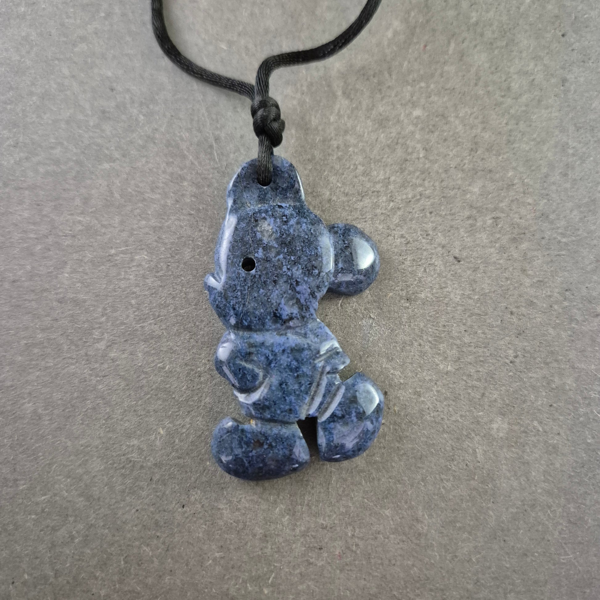 Diese kreative Halskette überzeugt mit einem einzigartigen Anhänger in Form einer Cartoon-Figur, gefertigt aus dunkelblauem Naturstein. Die Figur ist an einem schwarzen Stoffband befestigt, das sich in der Länge individuell anpassen lässt. Ideal für Liebhaber besonderer Accessoires mit Charme und Persönlichkeit.