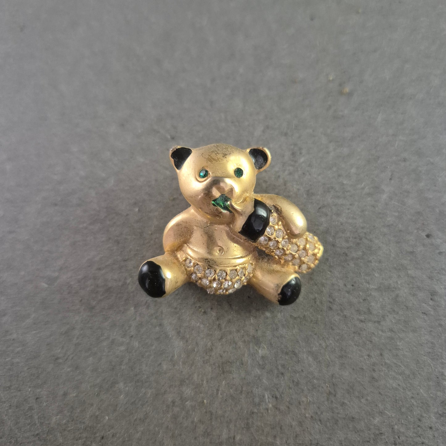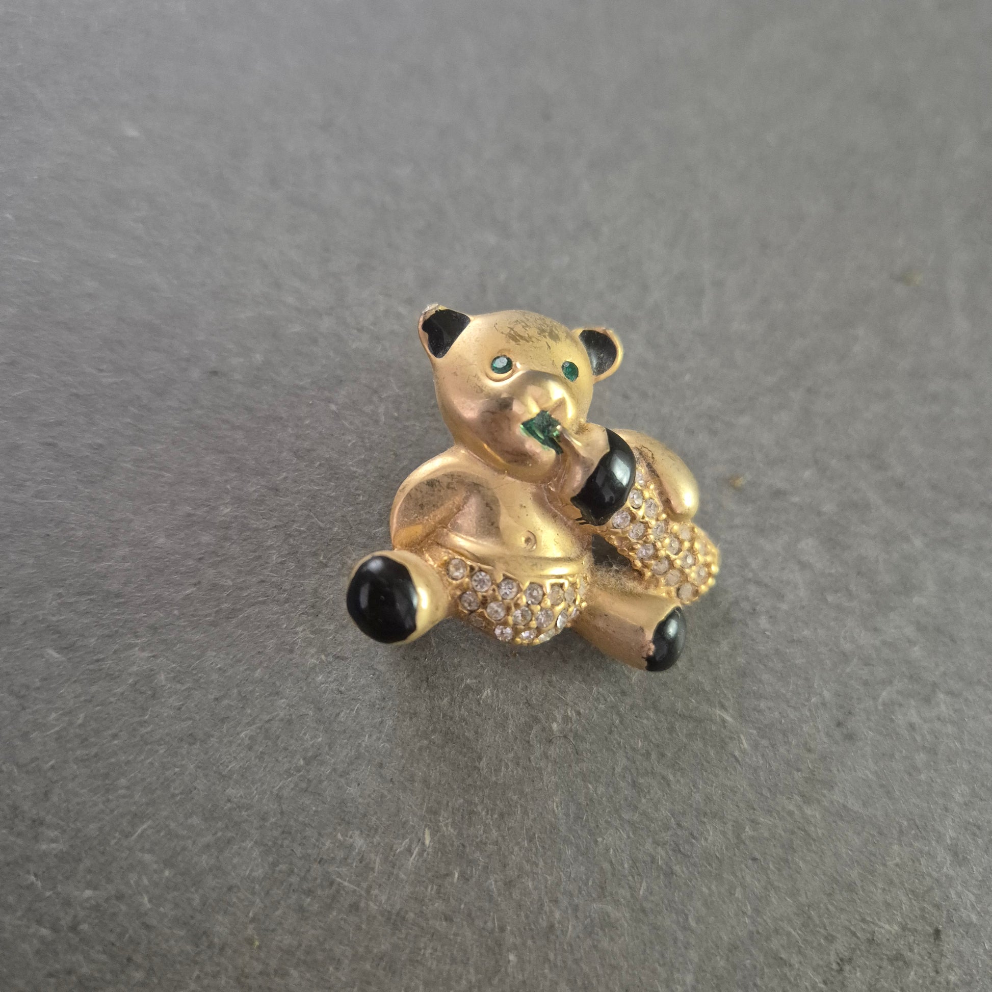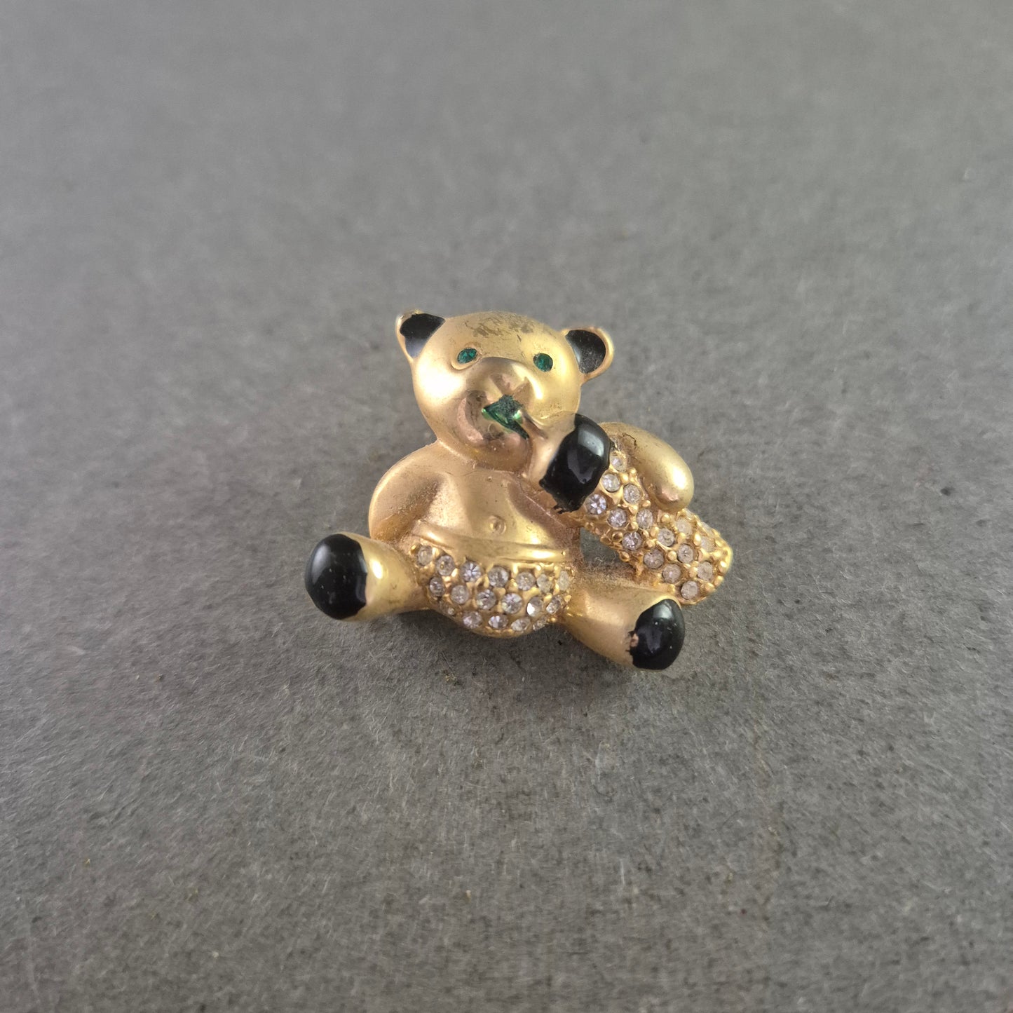 Diese charmante Brosche in Form eines Teddybären ist ein niedliches Accessoire mit Vintage-Charakter. Die goldfarbene Oberfläche wird durch funkelnde Strasssteine an Bauch und Tasche akzentuiert. Schwarze Emaille-Details und grüne Augen verleihen dem Bären zusätzlichen Ausdruck. Ein liebevoll gestaltetes Sammlerstück oder perfektes Geschenk für Schmuckliebhaberinnen mit Sinn für Humor.
