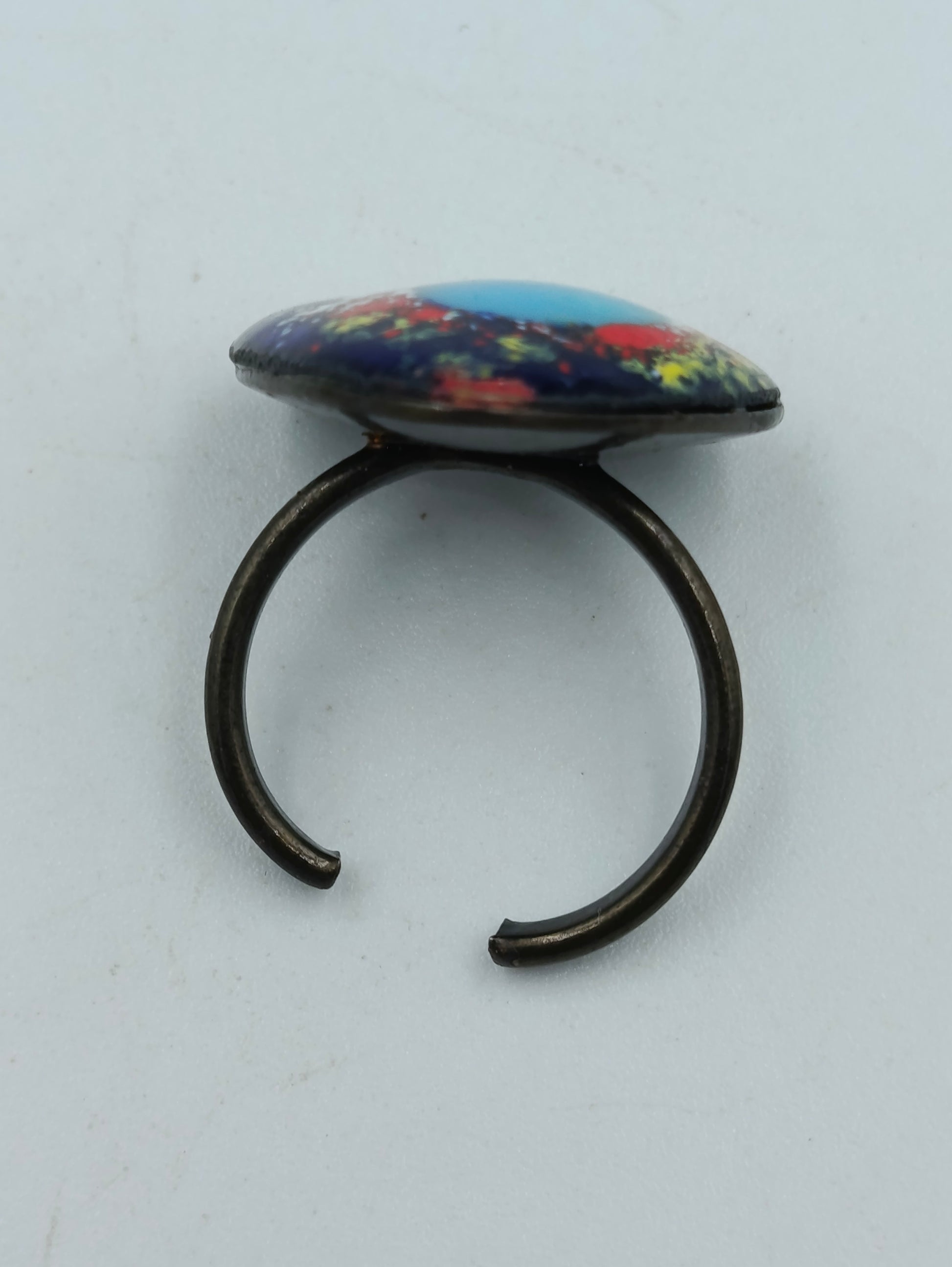 Künstlerischer Statement-Ring mit auffälligem, handbemaltem Emaille-Design. Die kräftigen Farben – Blau, Rot, Gelb und Weiß – bilden einen lebendigen Kontrast und verleihen dem Ring eine abstrakte, kunstvolle Ausstrahlung. Der Mittelstein in hellem Türkis setzt einen besonderen Akzent. Durch die offene Ringschiene ist der Ring größenverstellbar und flexibel tragbar.