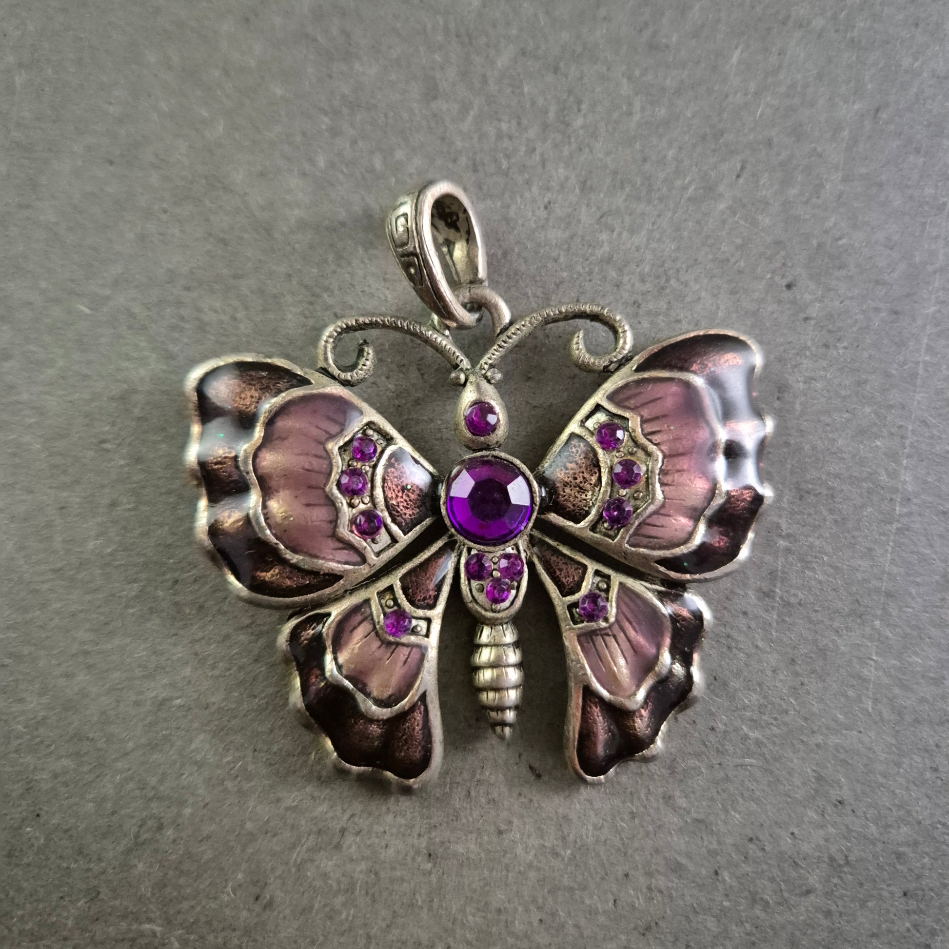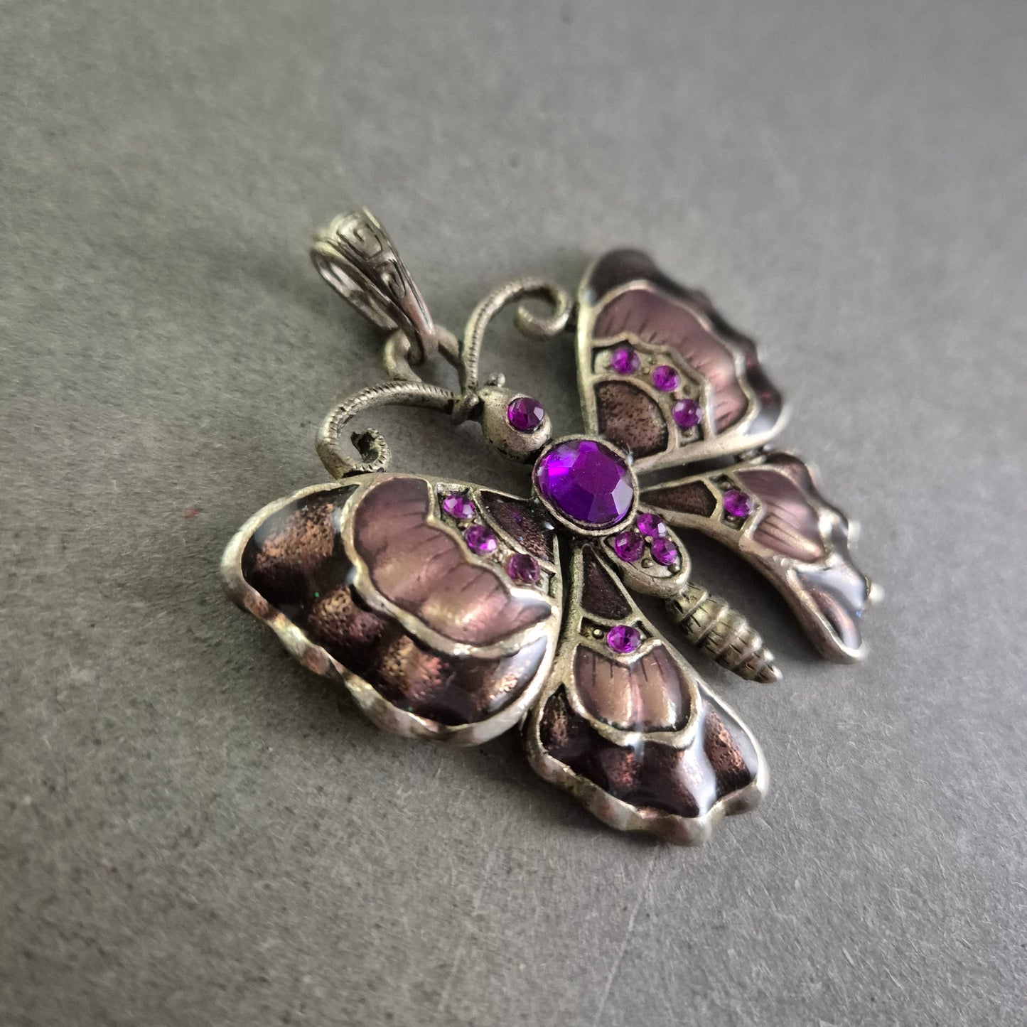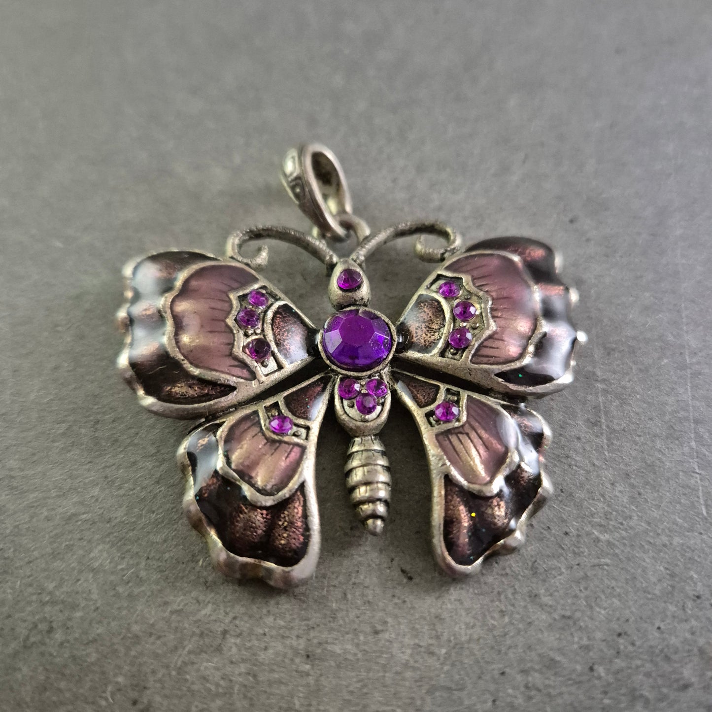 Dieser charmante Vintage-Anhänger in Form eines Schmetterlings begeistert mit detailreichen Flügeln und lilafarbenen Schmucksteinen. Die Flächen sind mit zarten Farbverläufen emailliert und mit kleinen Glitzerakzenten verziert. Der antik wirkende Metallkörper verleiht dem Stück zusätzlich Charakter – ein verspieltes Accessoire für Kettenliebhaber mit einem Sinn für romantische Designs.