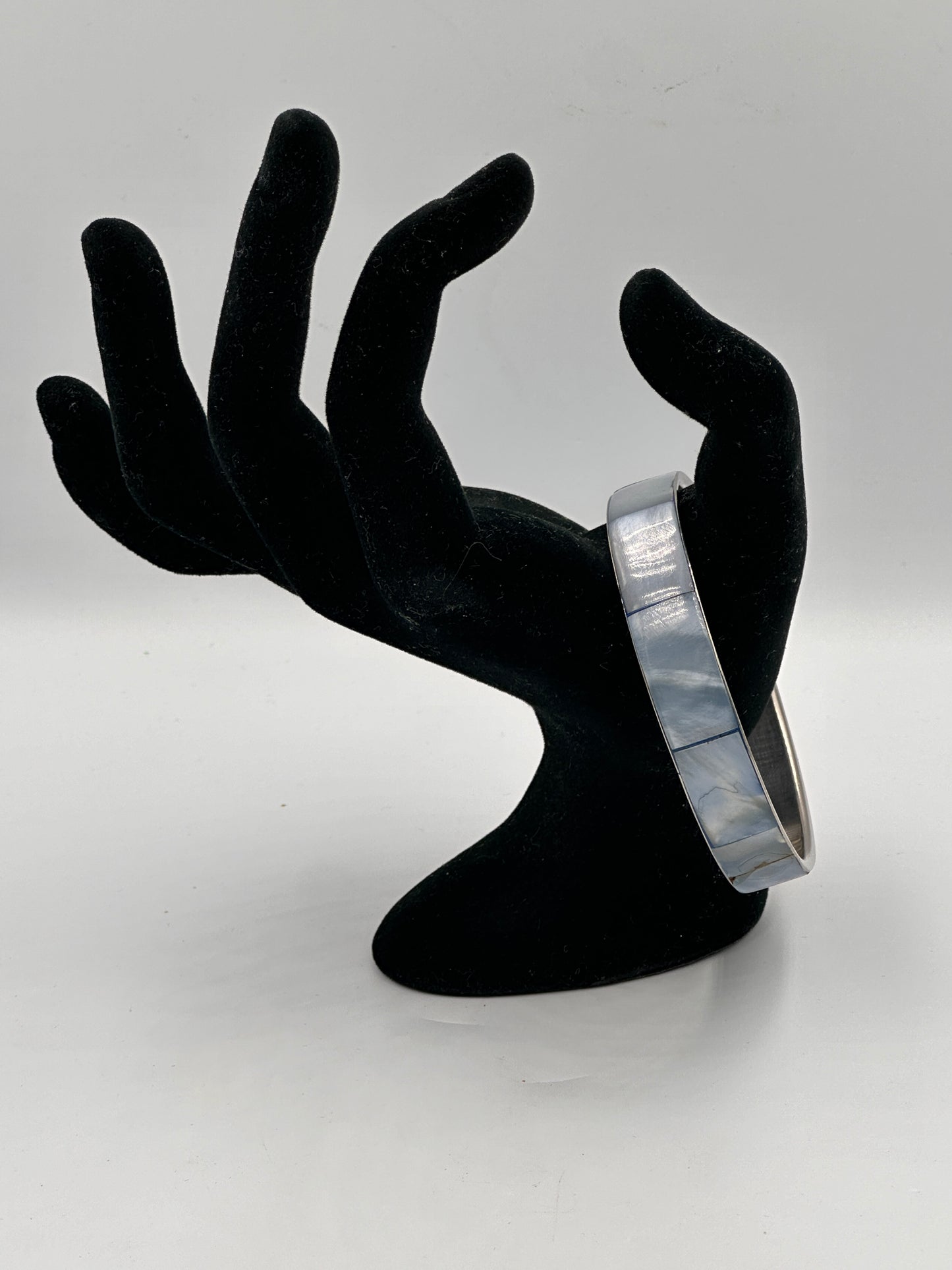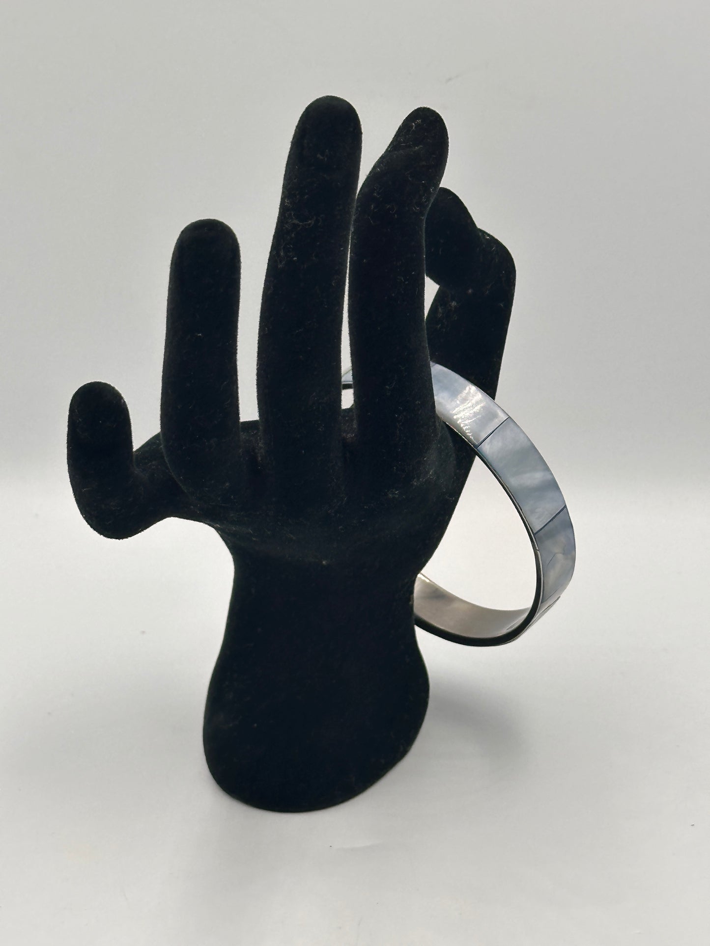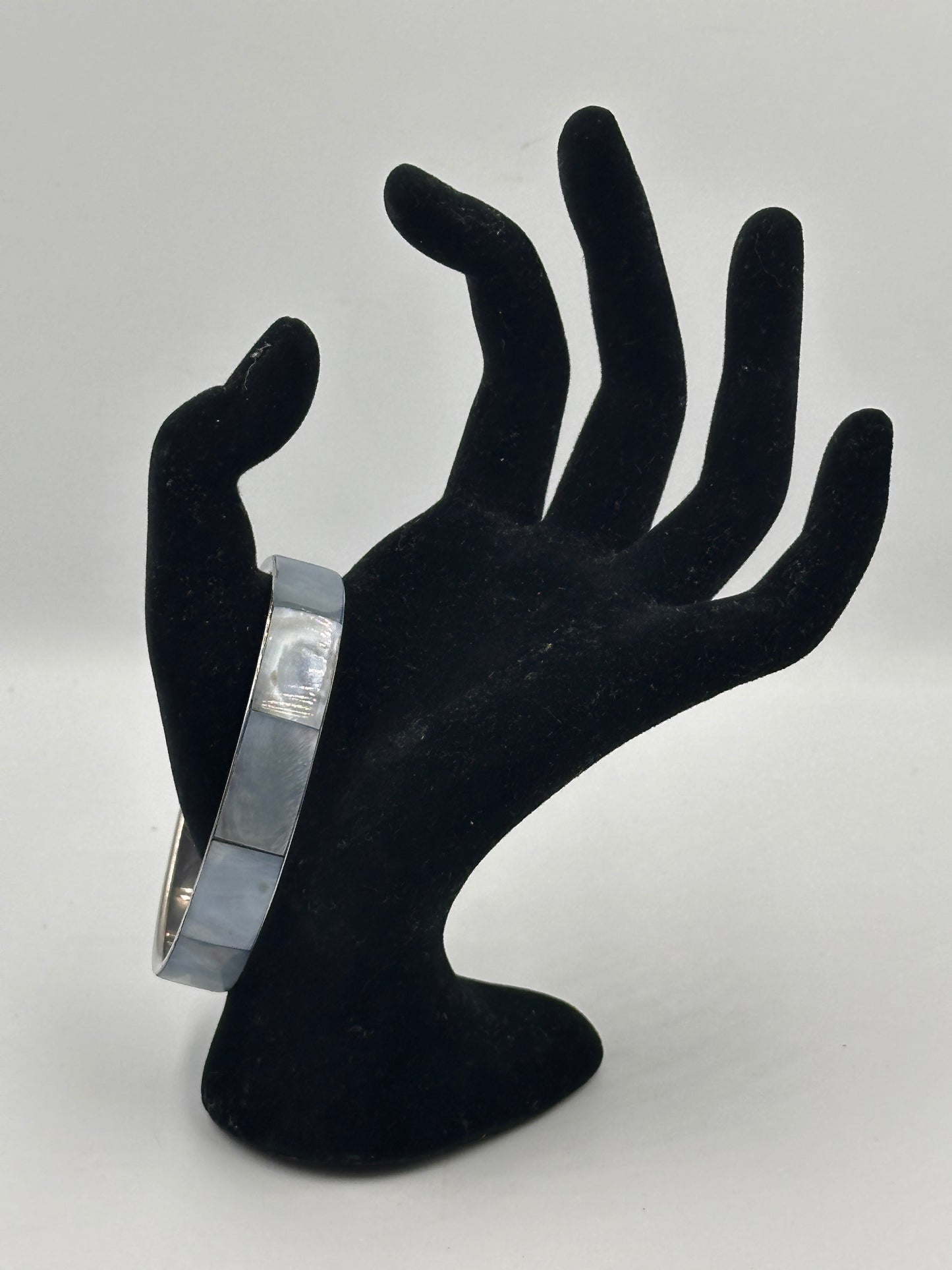 Dieses beeindruckende Armreif-Armband aus perlmuttfarbenem Material ist ein echtes Vintage-Stück mit einem Hauch von zeitloser Eleganz. Es besticht durch seine filigrane Verarbeitung und den einzigartigen Glanz, der charakteristisch für perlmuttartige Oberflächen ist.