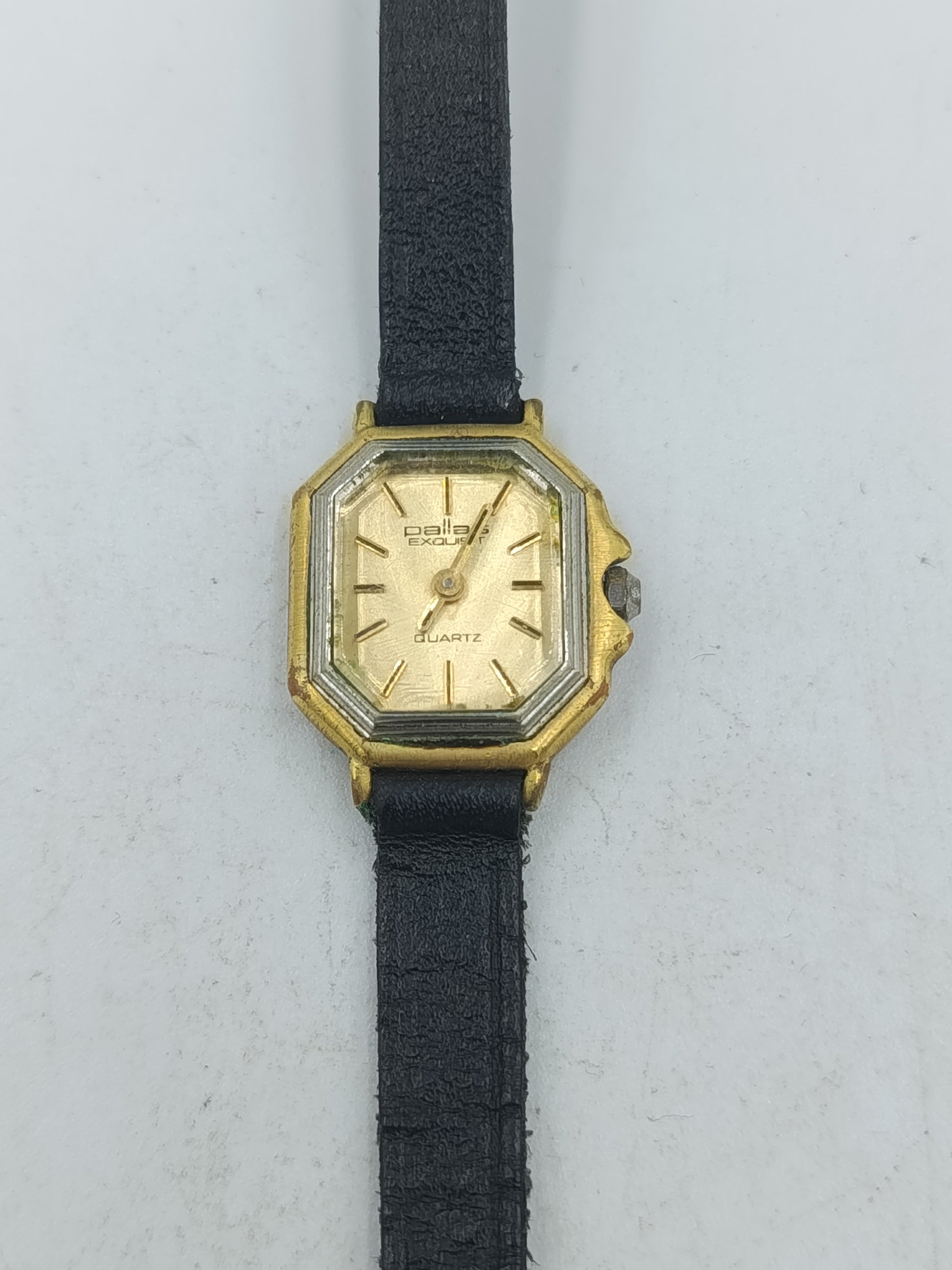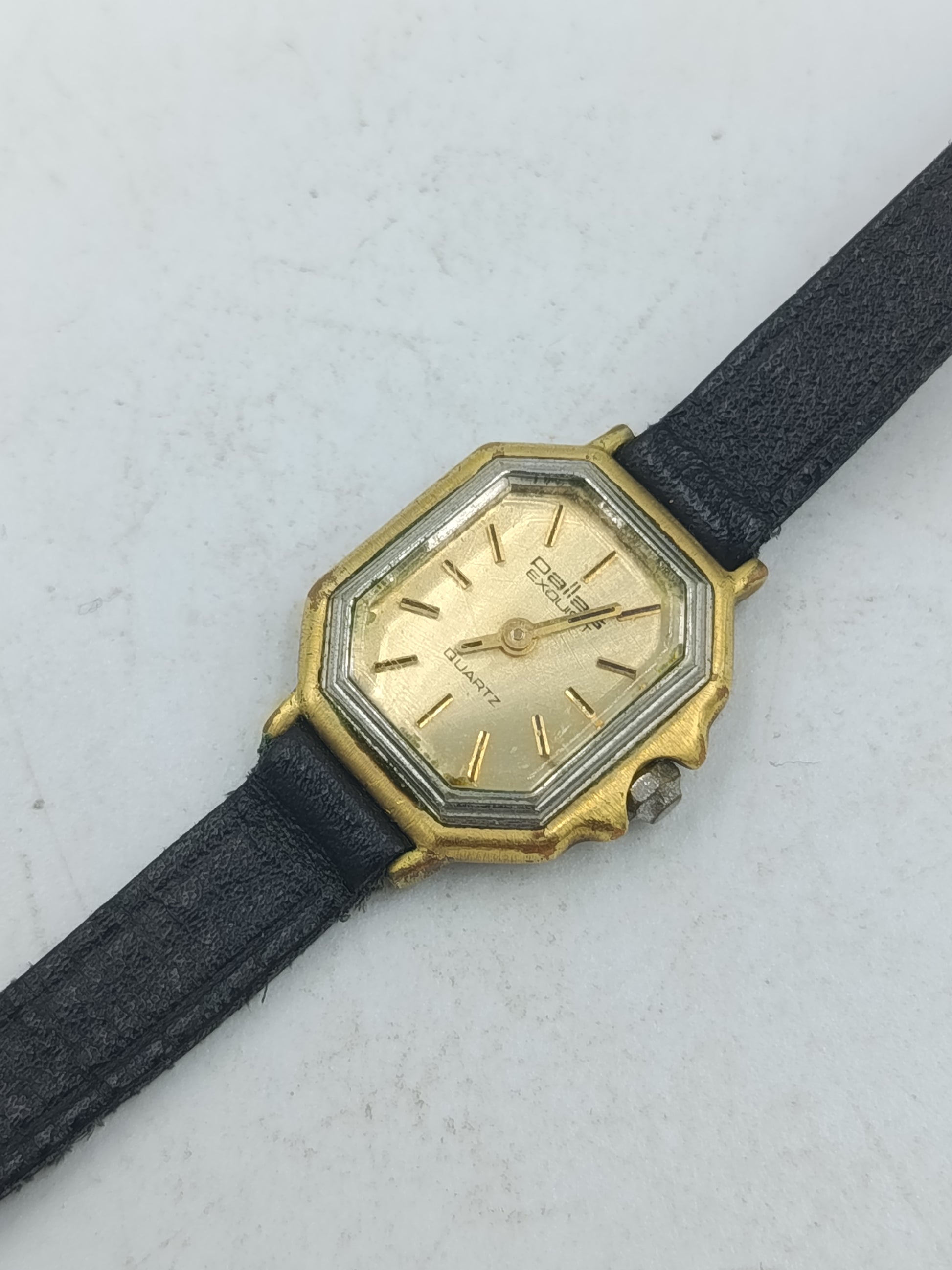 Vintage Armbanduhr mit achteckigem goldfarbenem Gehäuse und schwarzem Band