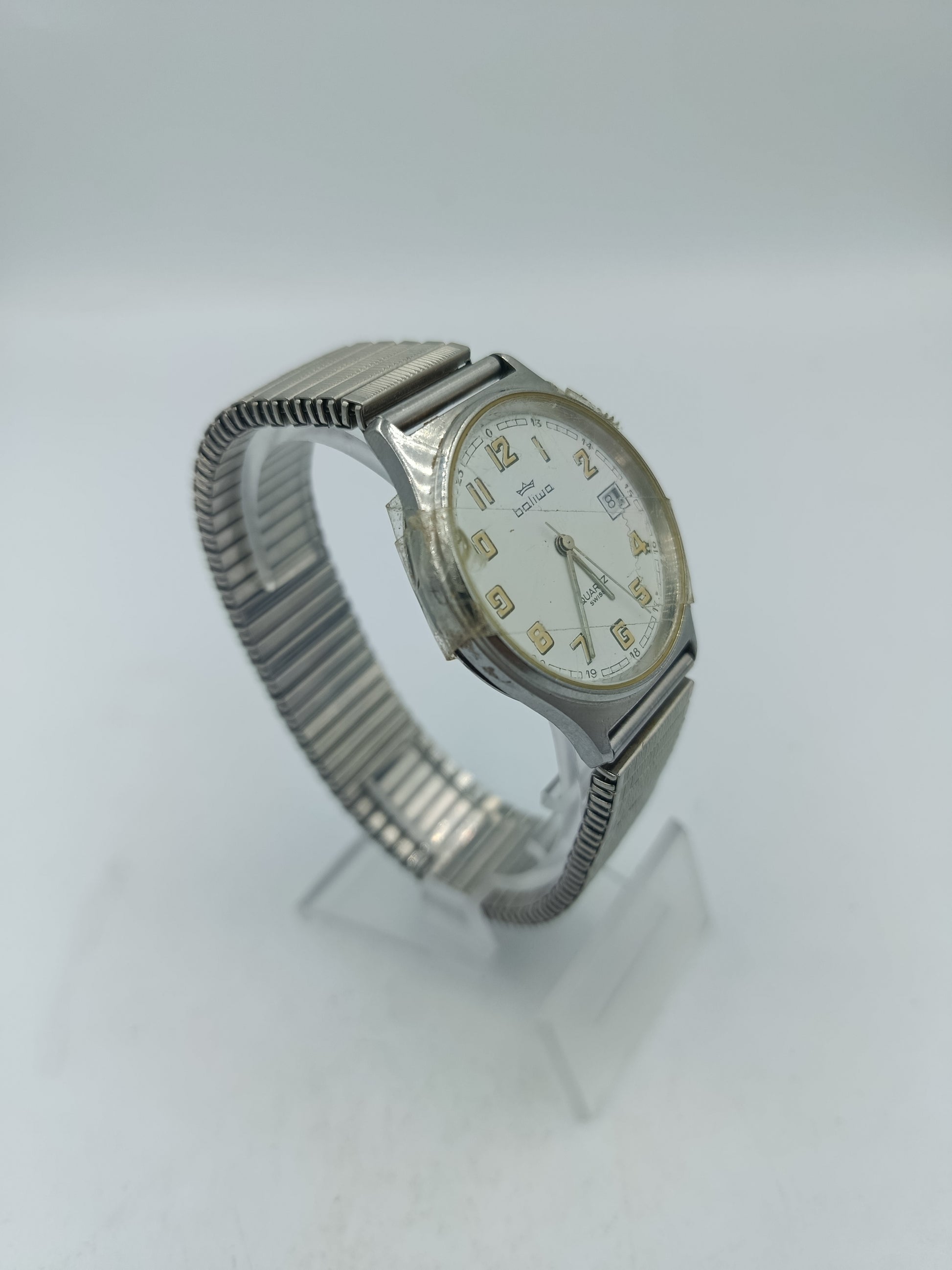 Vintage Boliwa Quartz Herrenarmbanduhr mit elastischem Edelstahlarmband im zeitlosen Design