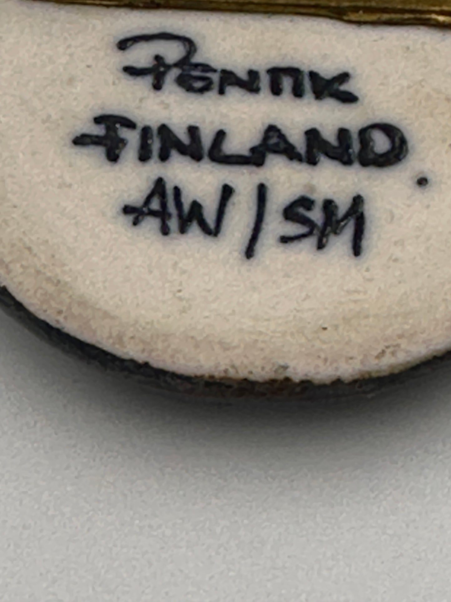 Diese einzigartige, abstrakte Brosche aus dem Hause Pentik in Finnland ist ein stilvolles Accessoire, das jedem Outfit eine besondere Note verleiht. Die Brosche hat einen Durchmesser von 4 cm und wiegt 19,3 g, was sie zu einem soliden und dennoch eleganten Schmuckstück macht. Trotz ihres gebrauchten Zustands ist sie gut erhalten und bereit, Ihrer Sammlung oder Ihrem Ensemble eine vintage Eleganz zu verleihen.