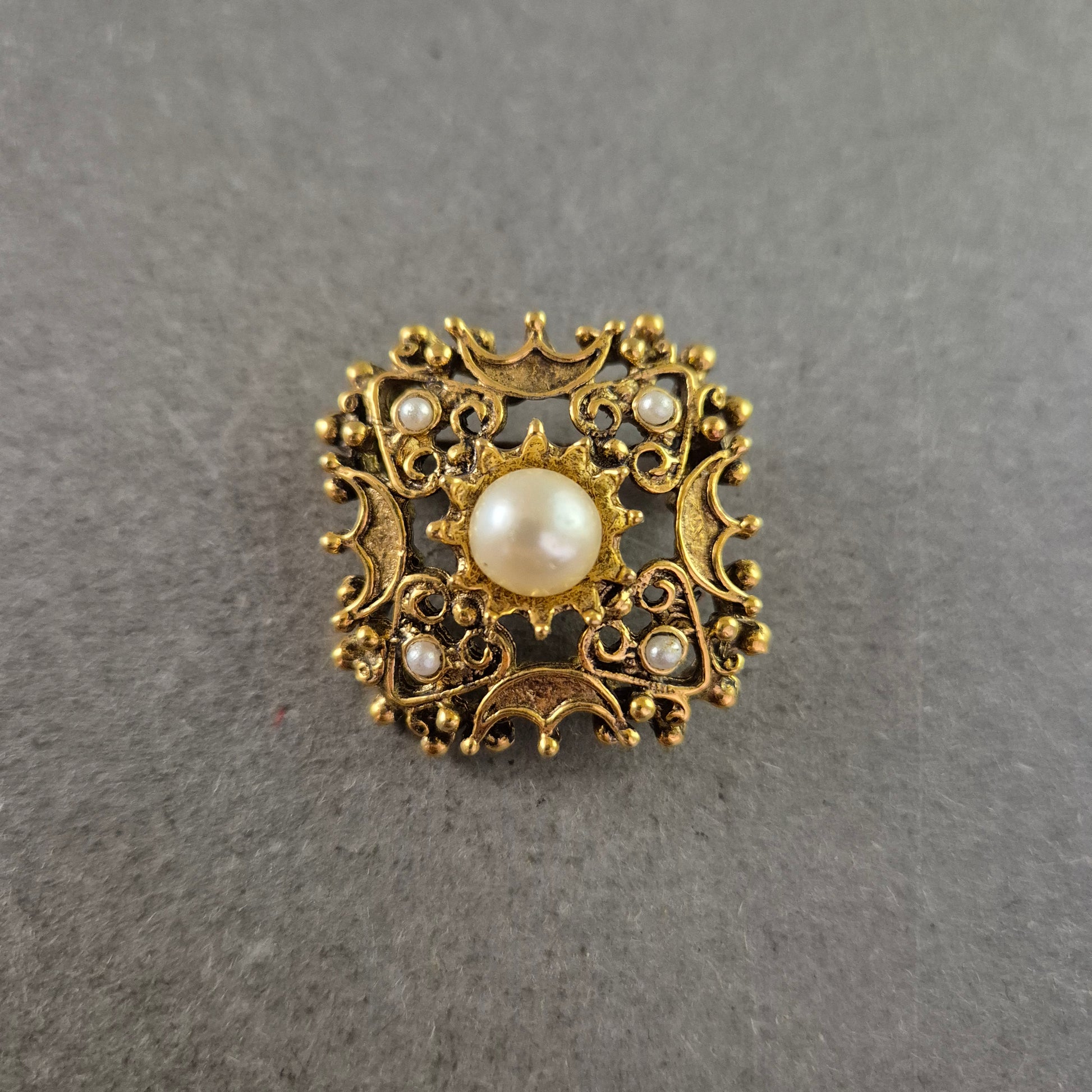 Vintage Brosche Gold Quadrat – Filigran & Große Perle