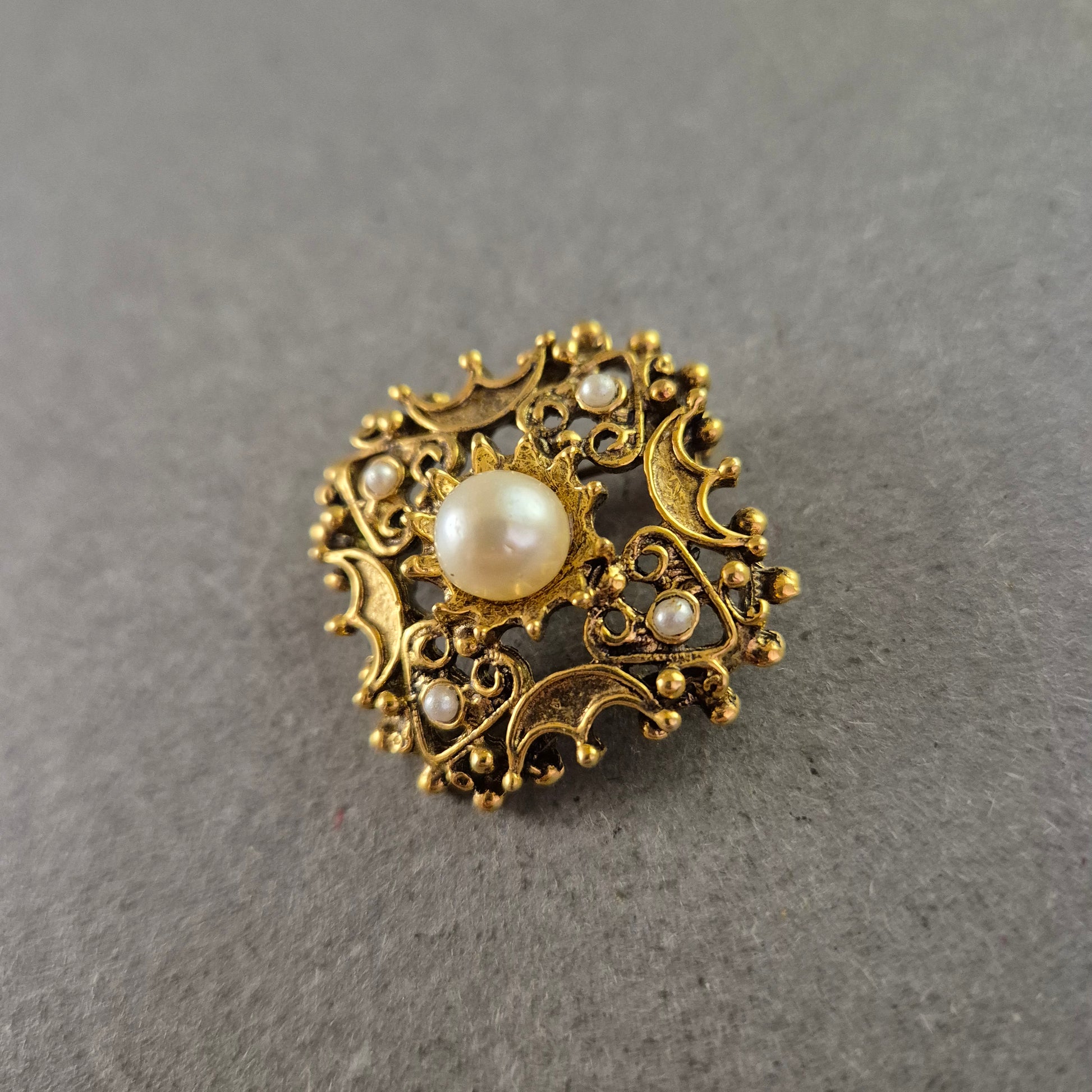 Diese prächtige Vintage Brosche besticht durch ihr kunstvolles, quadratisches Design in goldfarbenem Metall. Der detailreiche Rahmen im Filigran-Stil umgibt eine große, schimmernde Perle in der Mitte, die von einem Sonnen- oder Blumenmotiv betont wird. Kleinere Perlen sind in den Ecken platziert. Ein ausdrucksstarkes und elegantes Vintage-Accessoire, das jedem Outfit einen Hauch von Opulenz und Nostalgie verleiht.