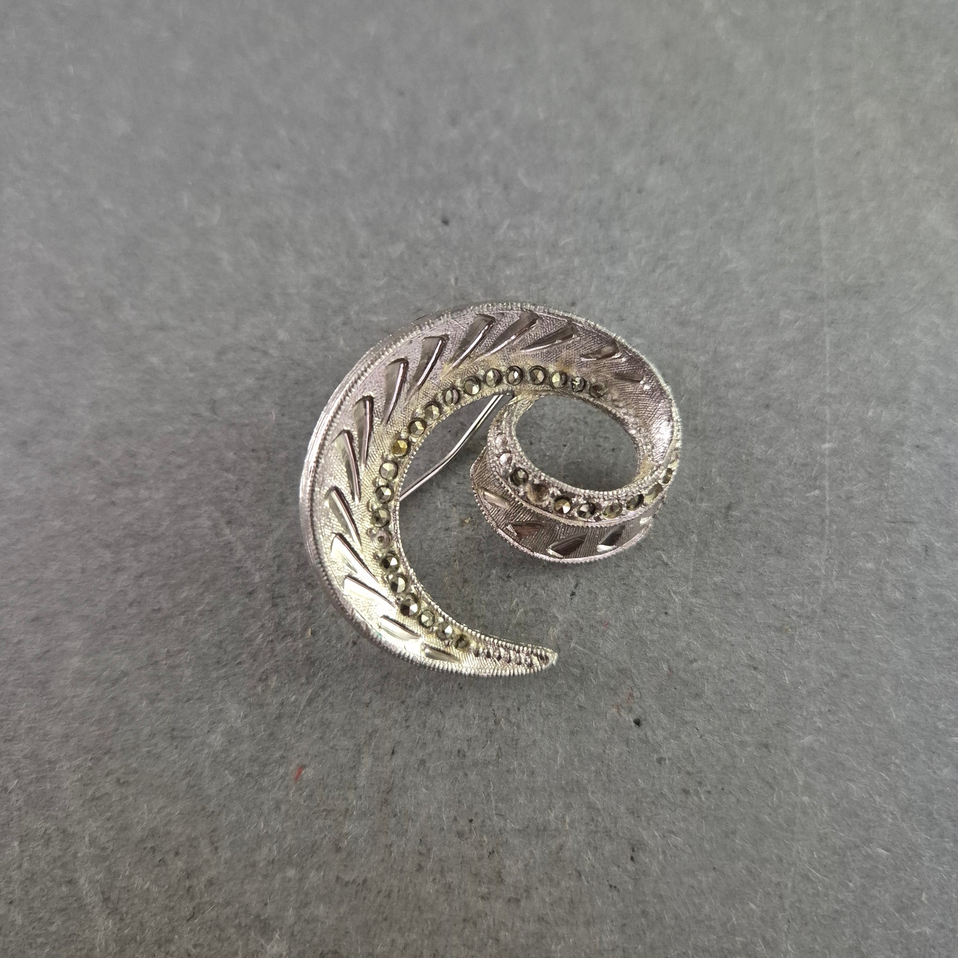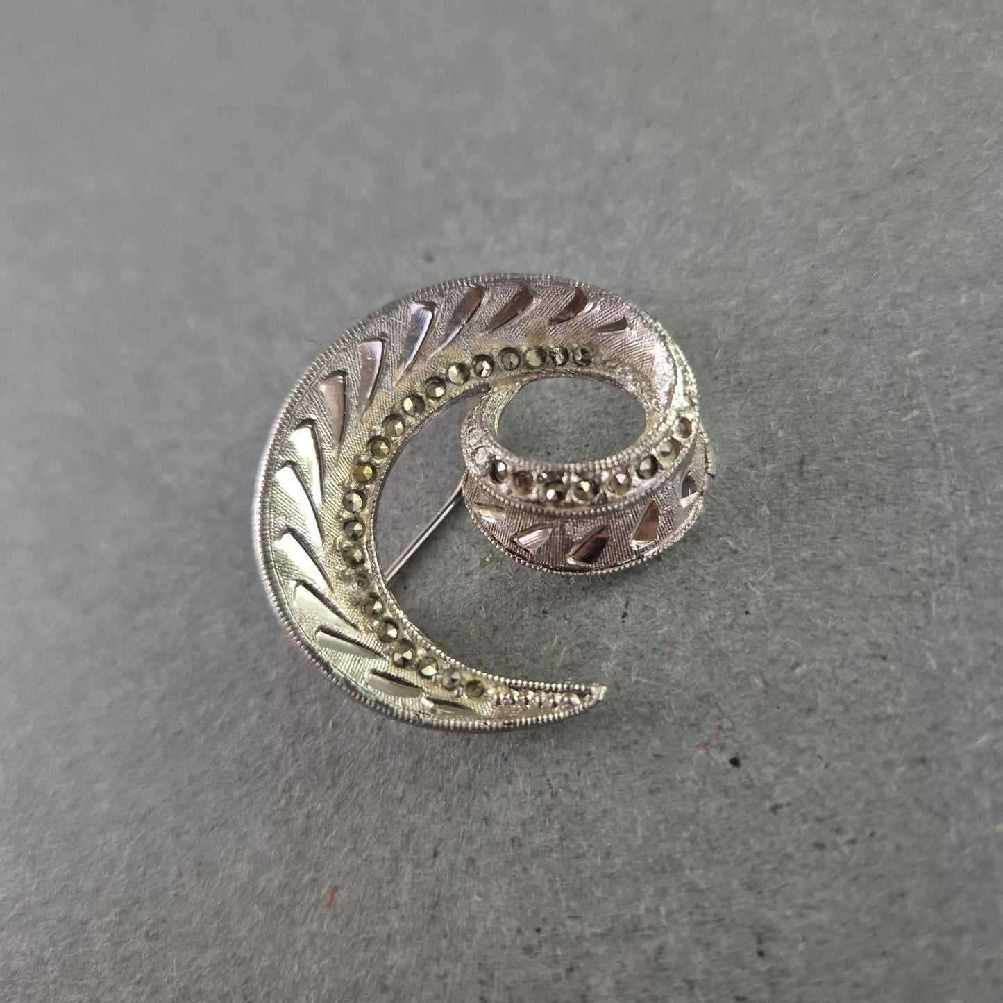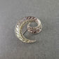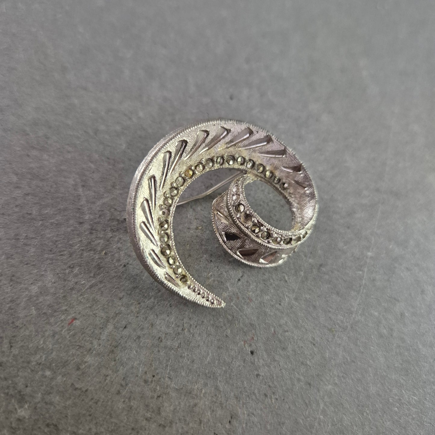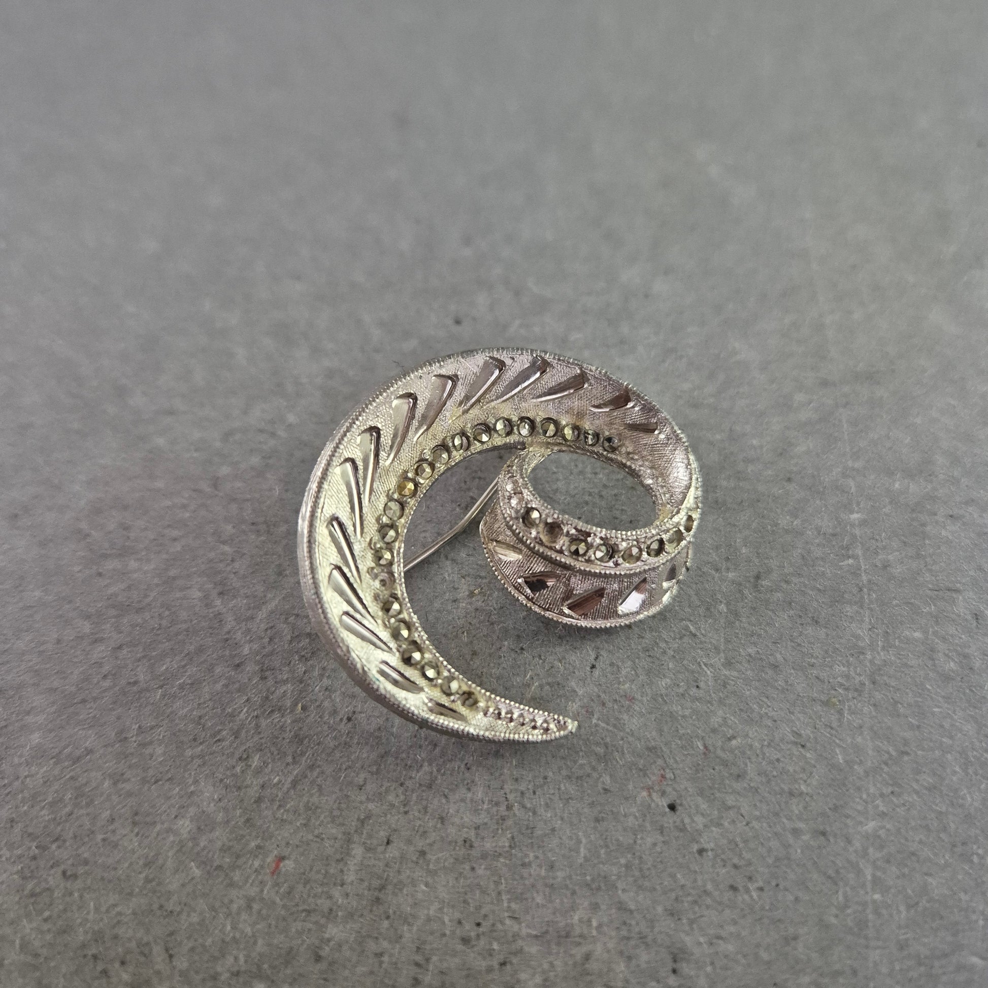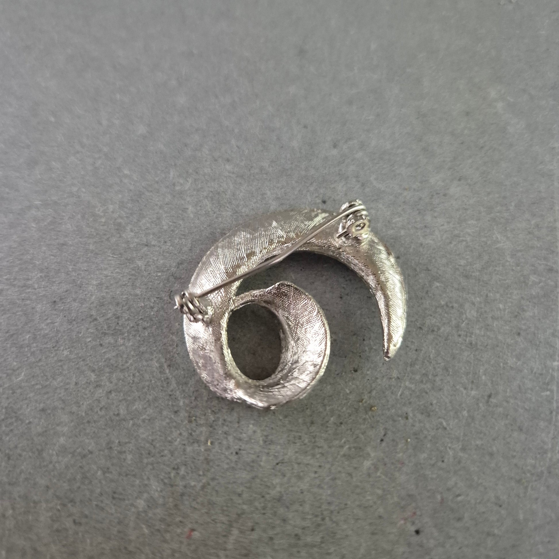 Diese elegante Vintage-Brosche überzeugt durch ihre außergewöhnliche, halbmondähnliche Form mit kunstvoll eingearbeiteten Strukturen und kleinen, funkelnden Zierelementen. Das silberfarbene Design macht sie zu einem stilvollen Hingucker – ideal für Vintage-Liebhaberinnen, die einen dezenten und dennoch markanten Akzent setzen möchten.