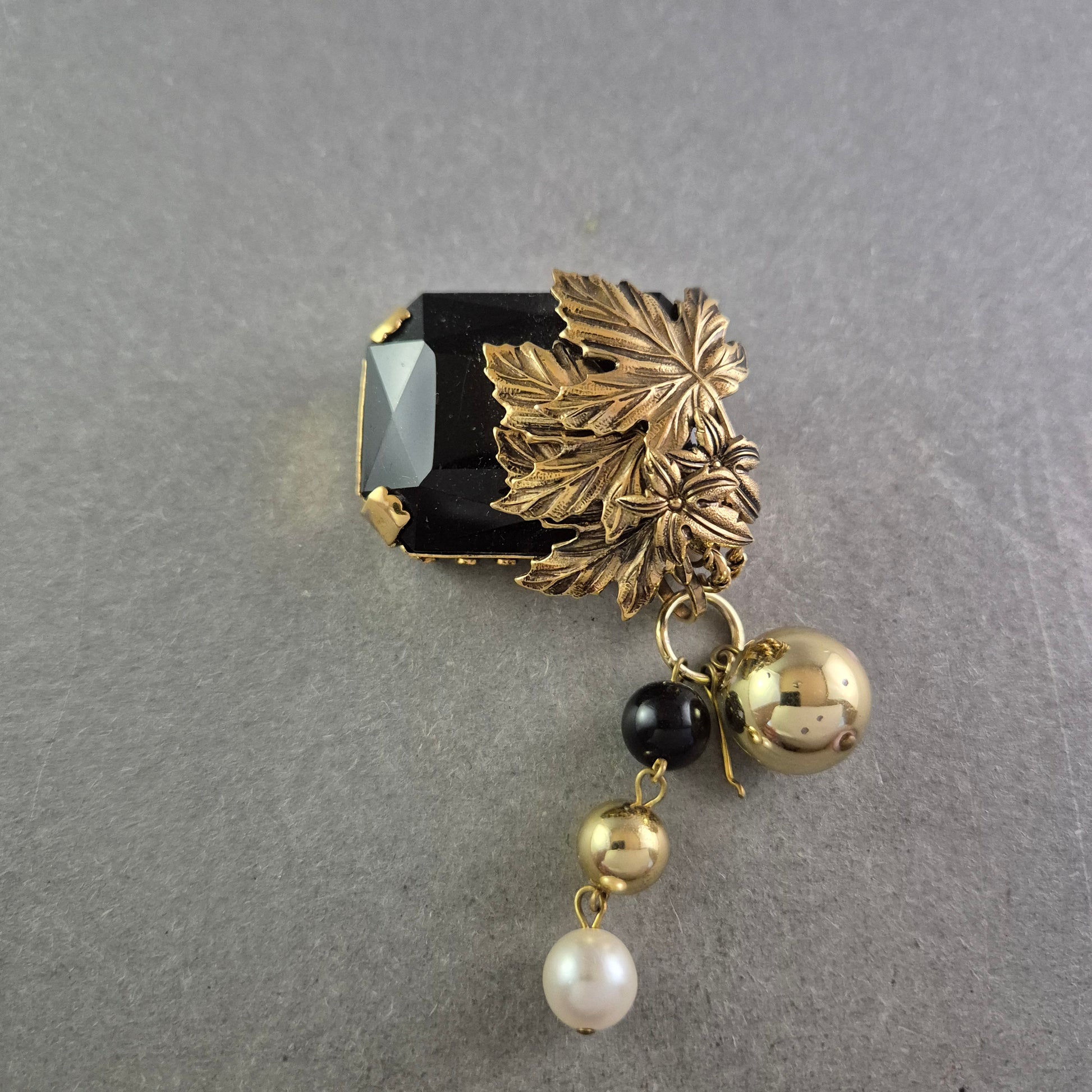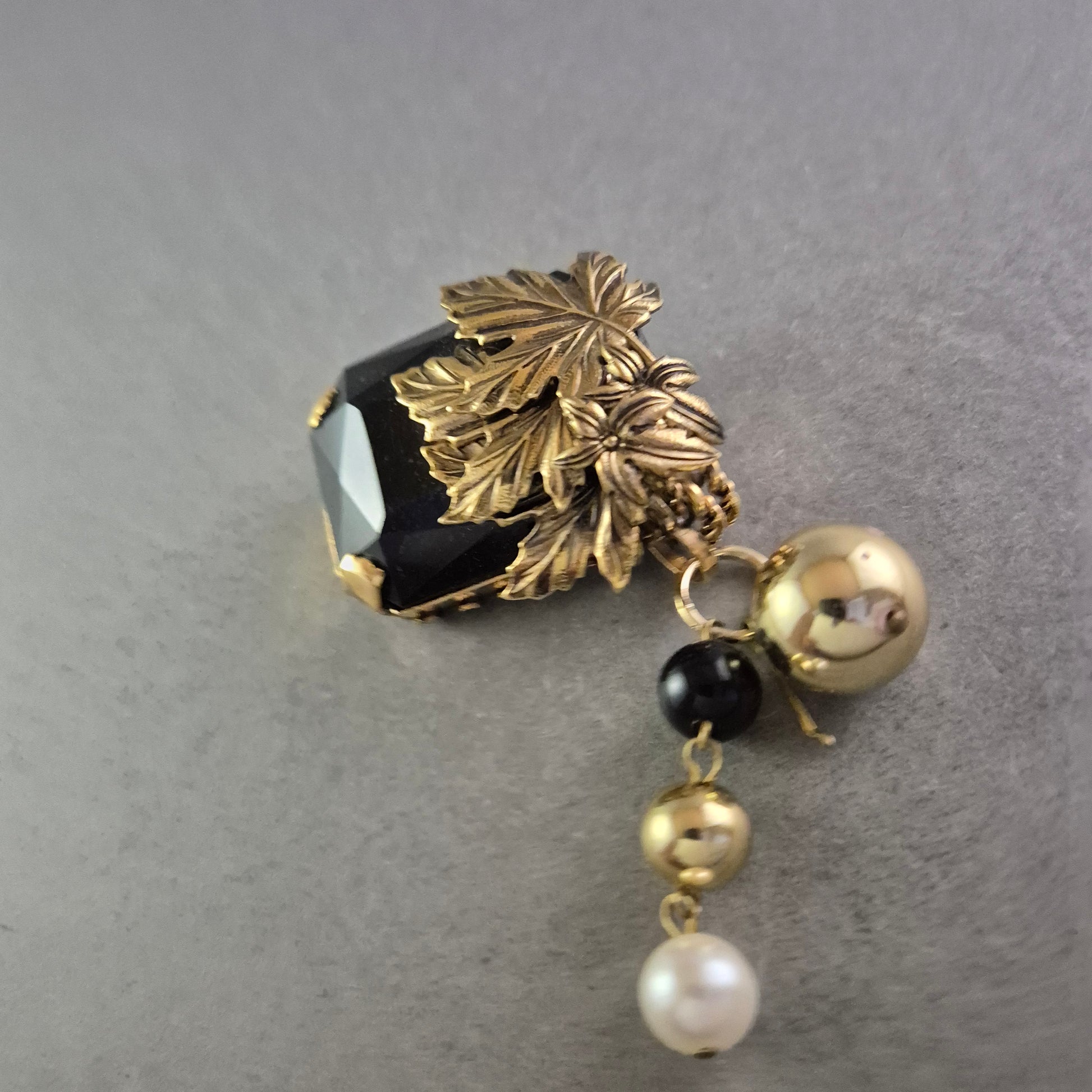 Diese kunstvolle Vintage Brosche stammt aus Deutschland und ist mit dem Prägezeichen „Western Germany“ versehen. Das Herzstück bildet ein facettierter schwarzer Schmuckstein, der von filigran gearbeiteten goldfarbenen Blättern eingefasst ist. Bewegliche Anhänger mit Perlen-, Onyx- und Metalloptik sorgen für einen verspielten Touch. Ein Sammlerstück mit nostalgischem Flair und hochwertiger Verarbeitung.