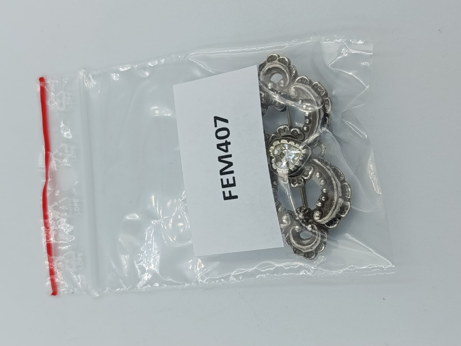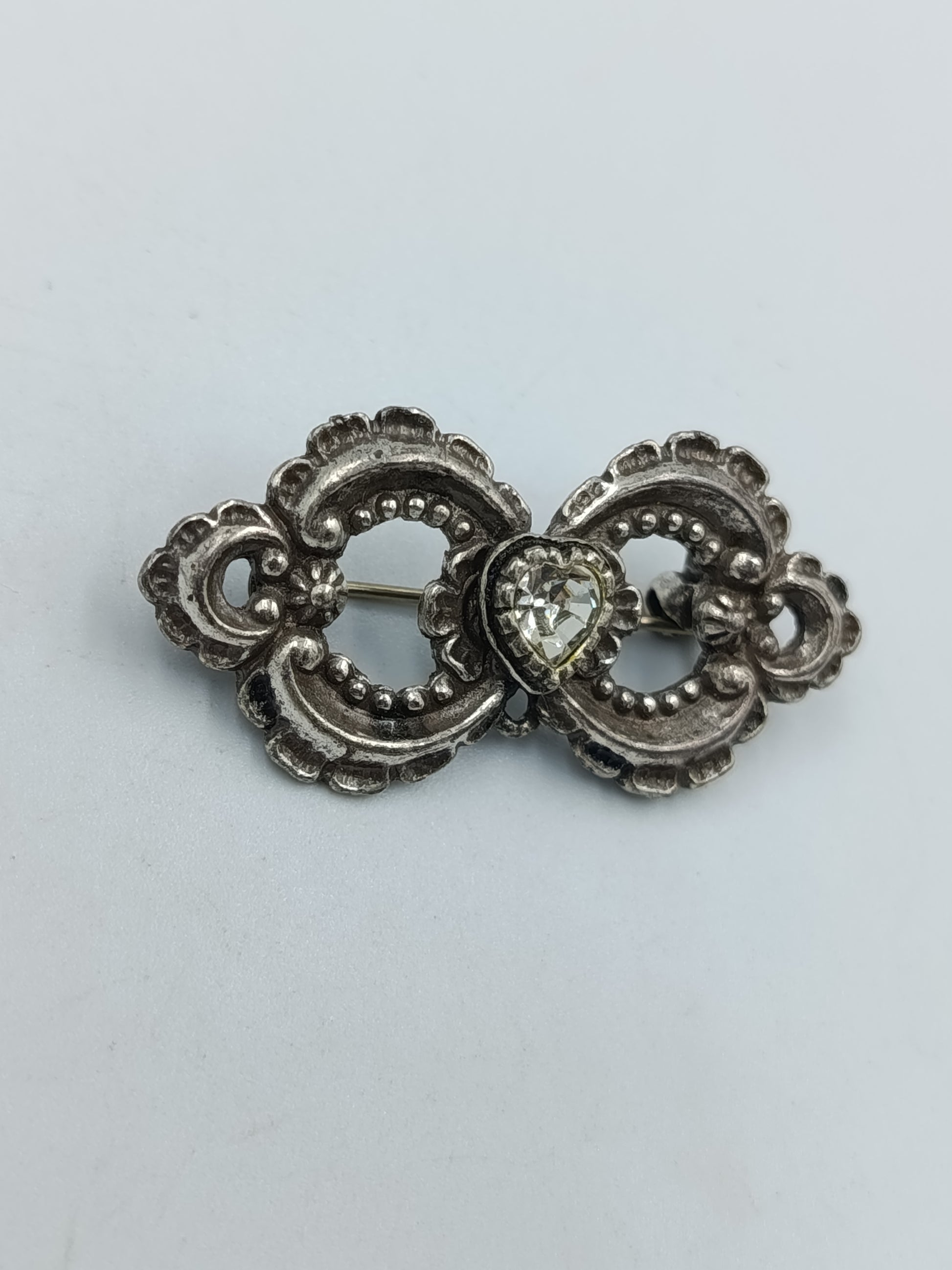 Dekorative Vintage-Brosche im kunstvollen Barockstil, verziert mit floralen Ornamenten und zarten Perlen-Reliefdetails. Im Zentrum sitzt ein funkelnder, herzförmiger Glasstein, der der Brosche eine elegante und romantische Note verleiht.