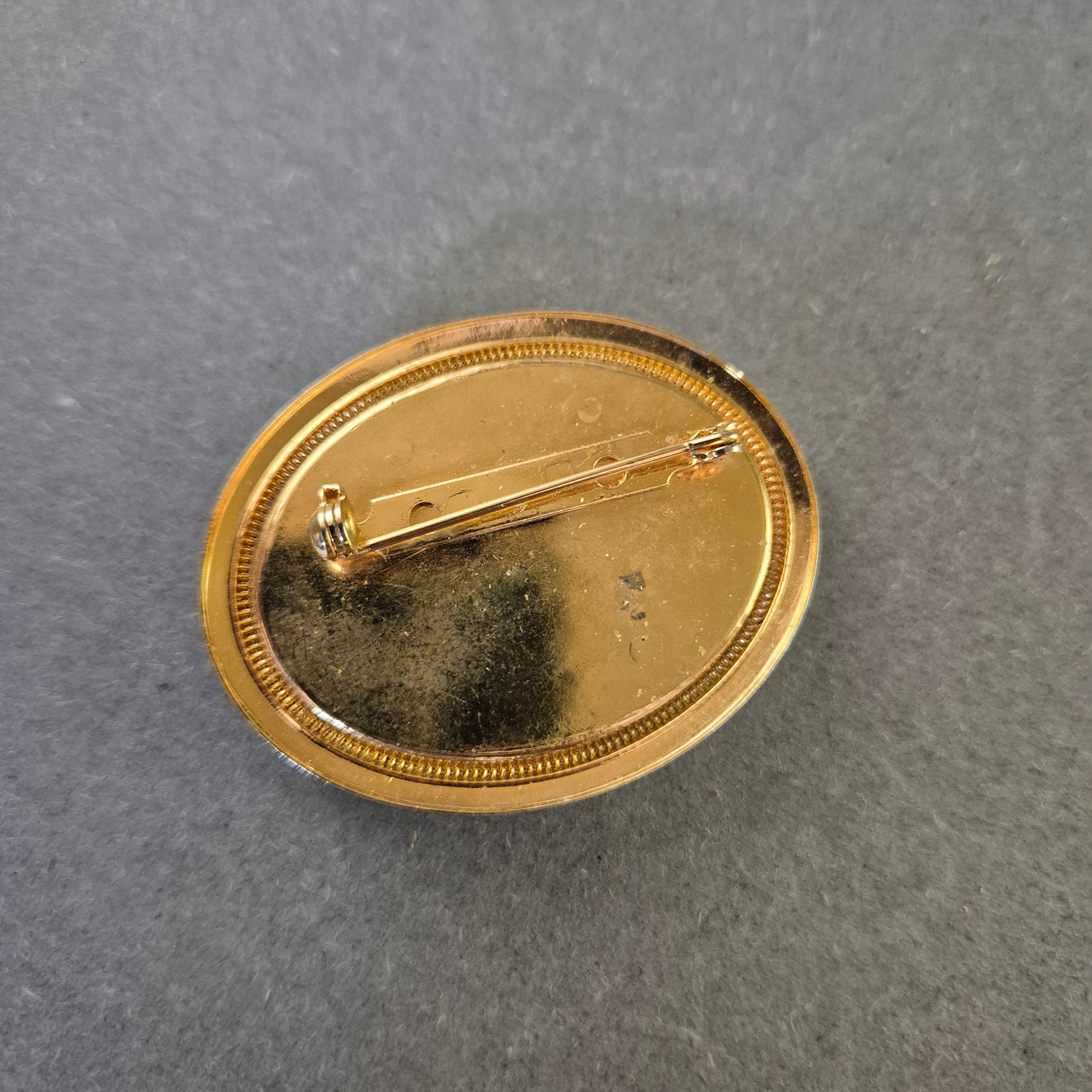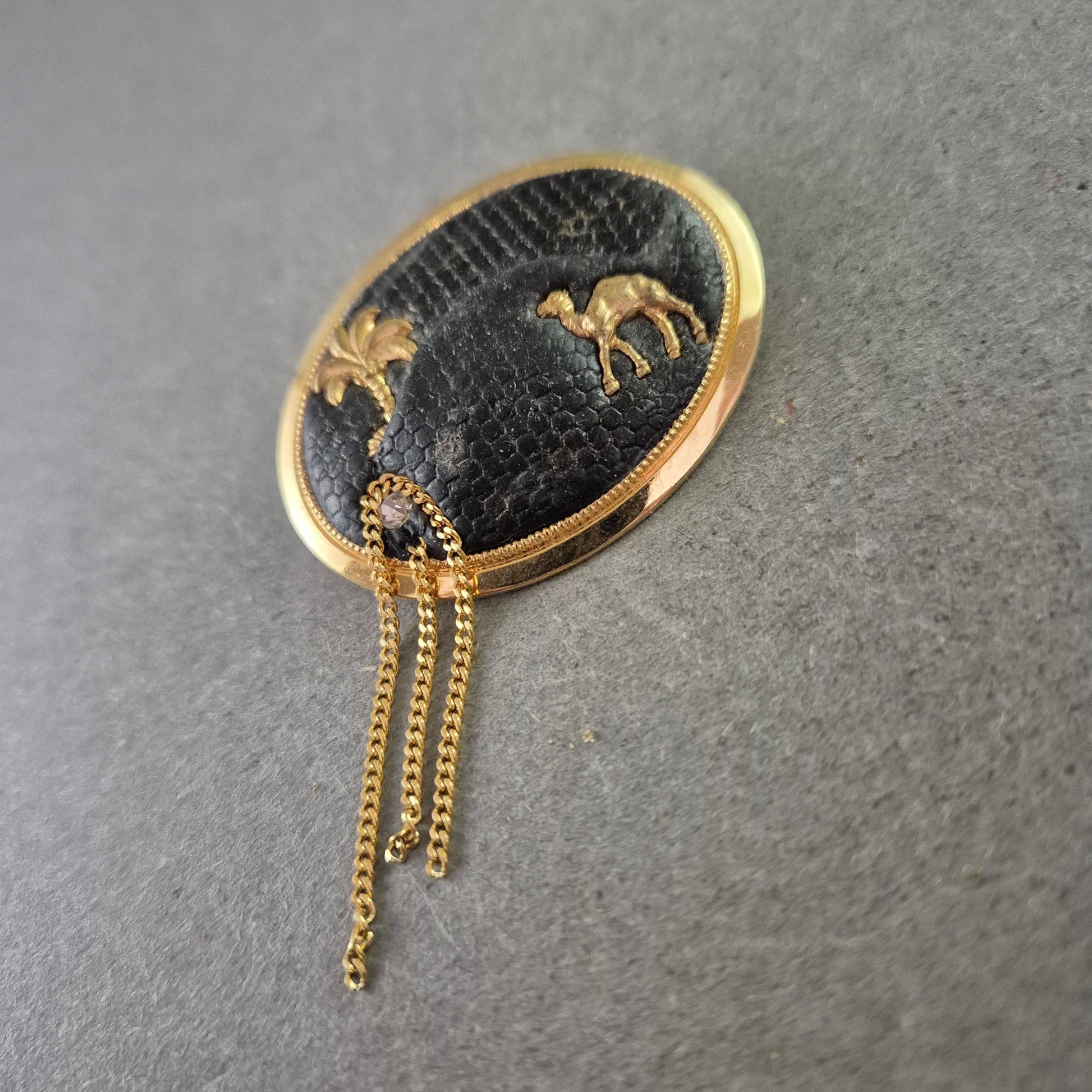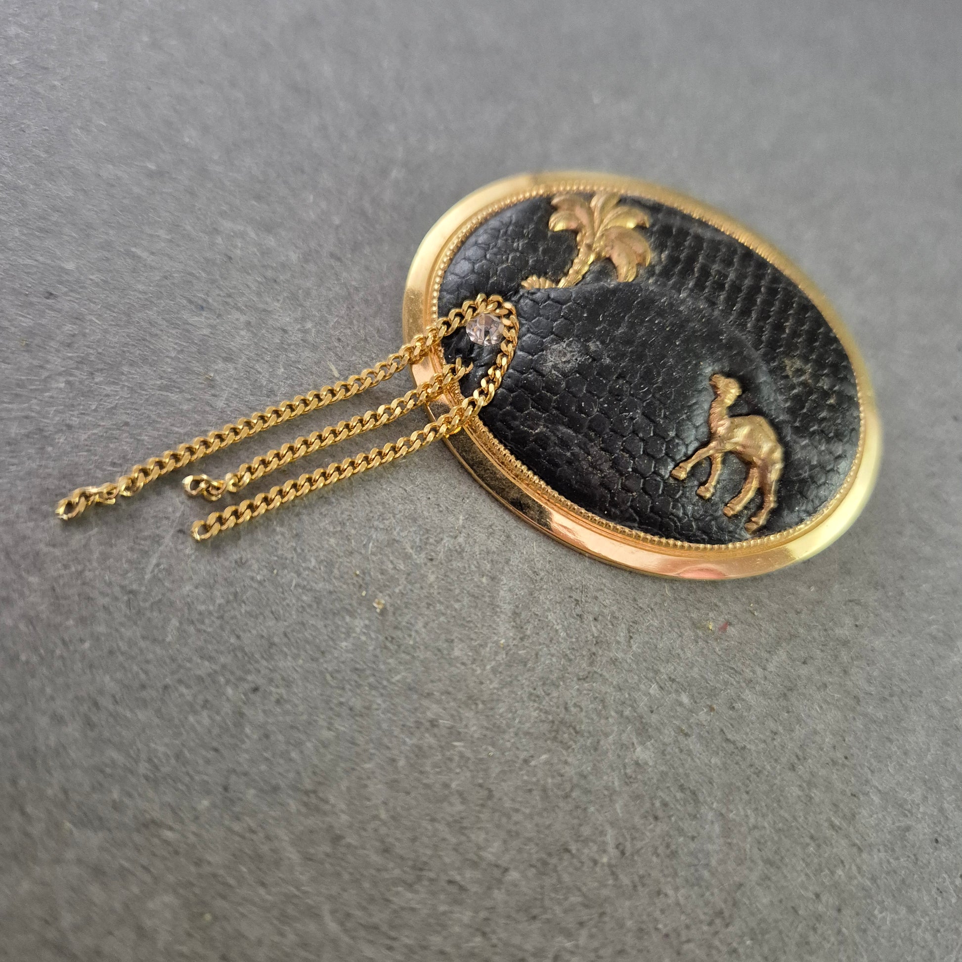 Diese auffällige Vintage-Brosche zeigt ein fein gearbeitetes Wüstenszenario mit einem goldfarbenen Kamel und einer Palme, eingebettet in eine schwarze, strukturierte Oberfläche im Schlangenhaut-Look. Der goldene Rahmen und die filigranen Kettendetails unterstreichen den exotischen Stil dieses Accessoires und machen sie zu einem besonderen Sammlerstück oder Blickfang an Jacken, Tüchern oder Taschen.