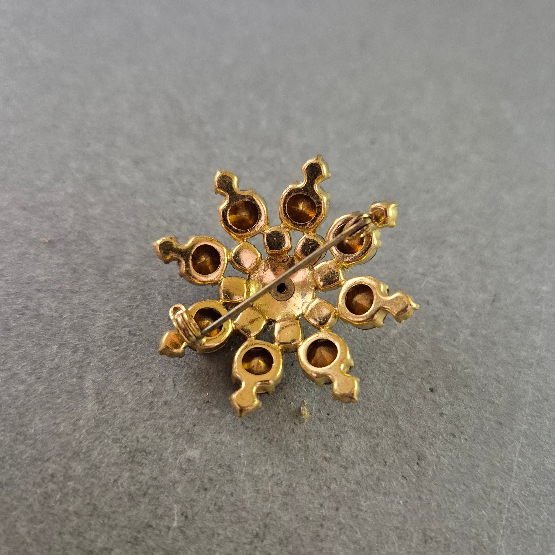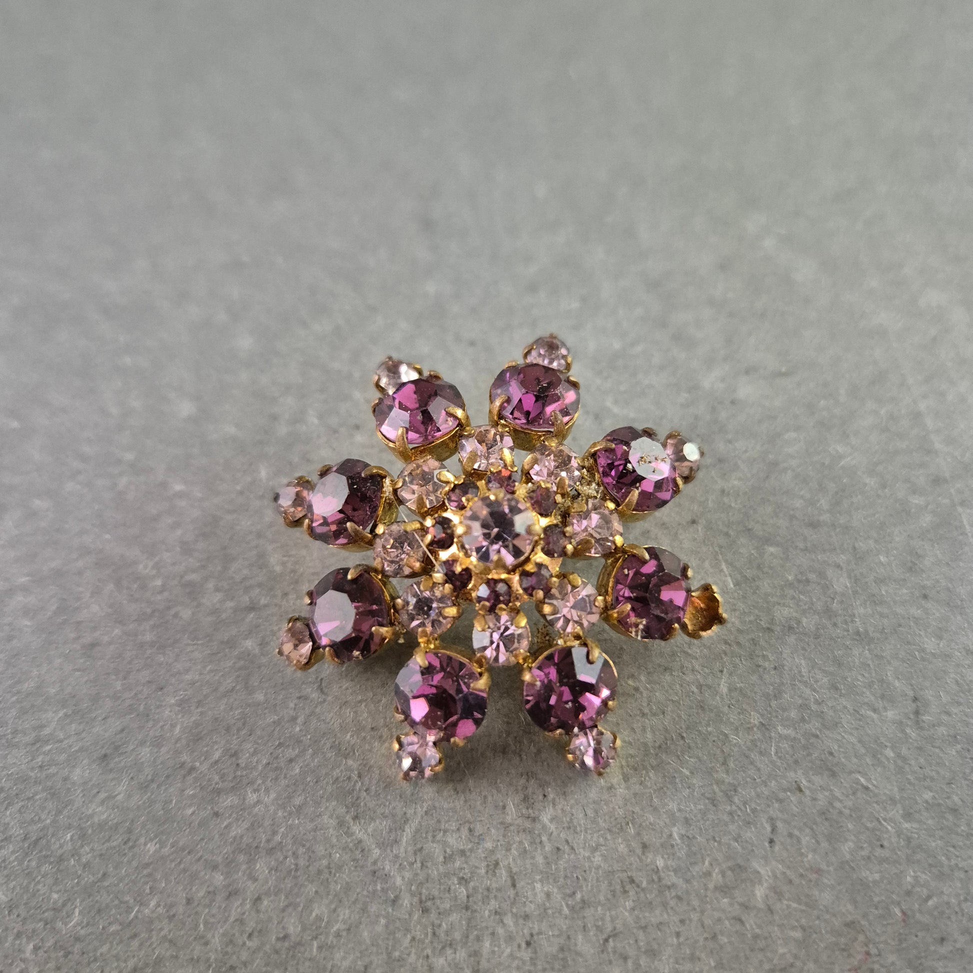 Diese stilvolle Vintage-Brosche in Schneeflockenform verzaubert durch ihr opulentes Design mit funkelnden lila Strasssteinen in verschiedenen Größen. Die goldfarbene Metallfassung bringt die Farben besonders zur Geltung und verleiht dem Stück einen eleganten, nostalgischen Charme. Perfekt als Akzent für festliche Outfits oder als Sammlerstück im Retro-Stil.