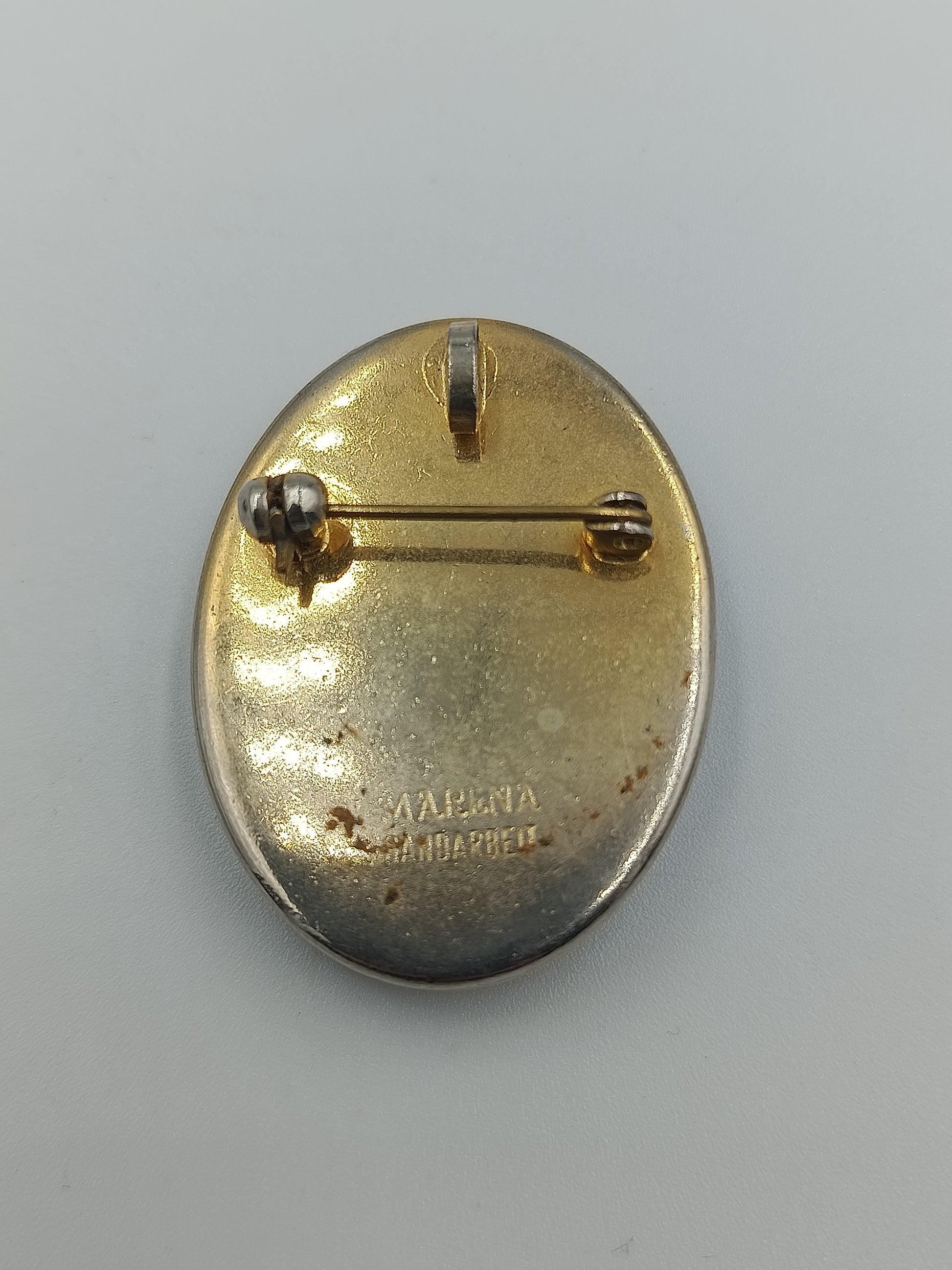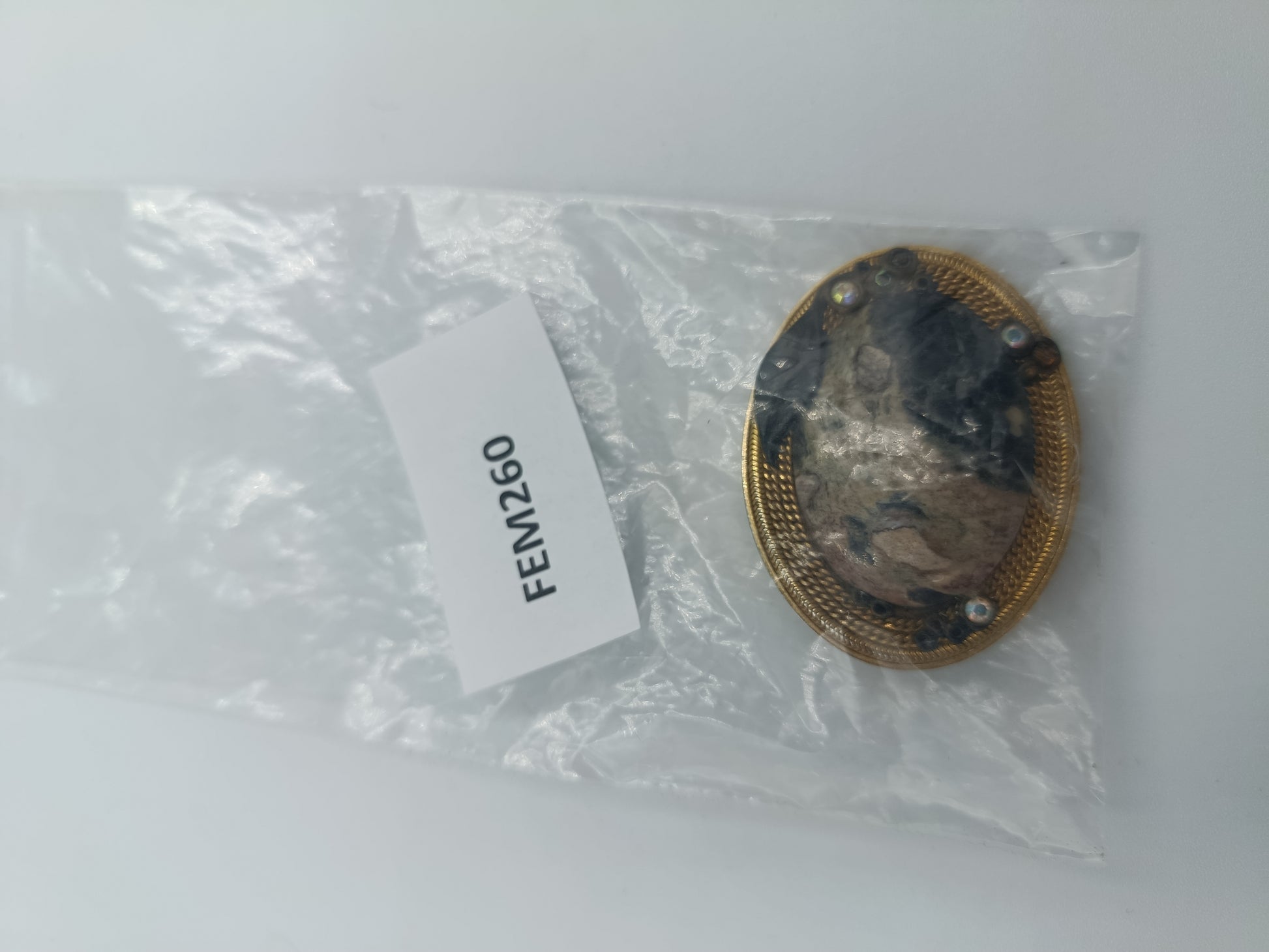 Charmante, ovale Vintage-Brosche mit großem Naturstein in Braun- und Schwarztönen. Der Stein ist von einem goldfarbenen, strukturierten Rahmen eingefasst und mit kleinen, funkelnden Glassteinen sowie einer schwarzen Blattapplikation verziert. Eine edle, zeitlose Brosche, die jedem Outfit einen Hauch von Eleganz verleiht.