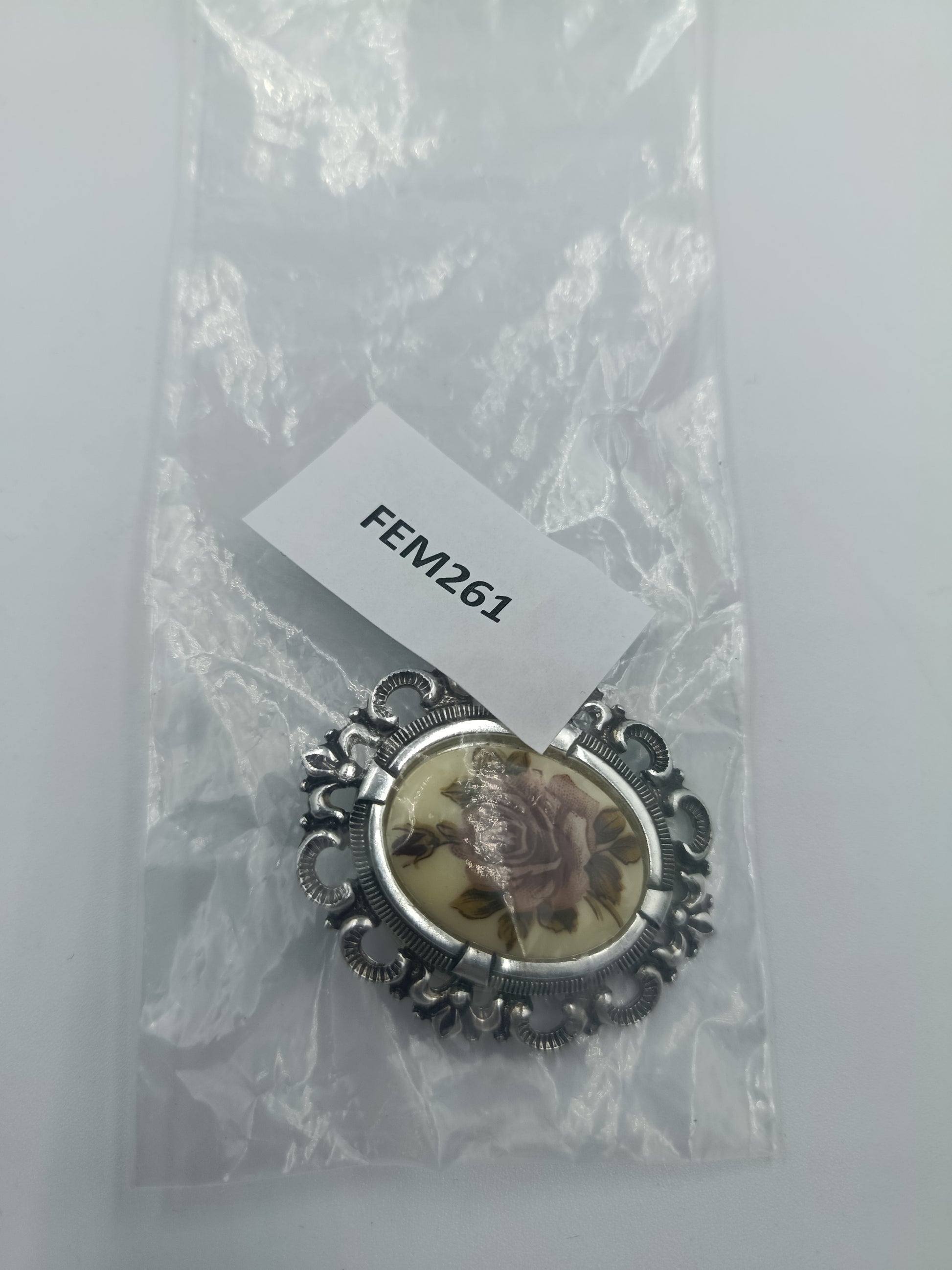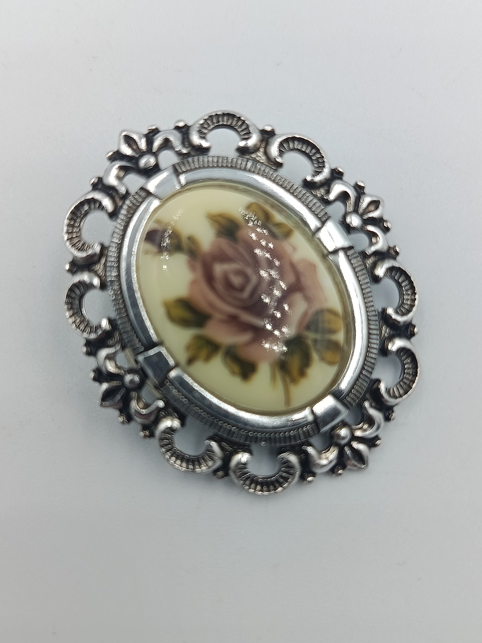 Vintage-Brosche mit Rosenmotiv im Silberrahmen