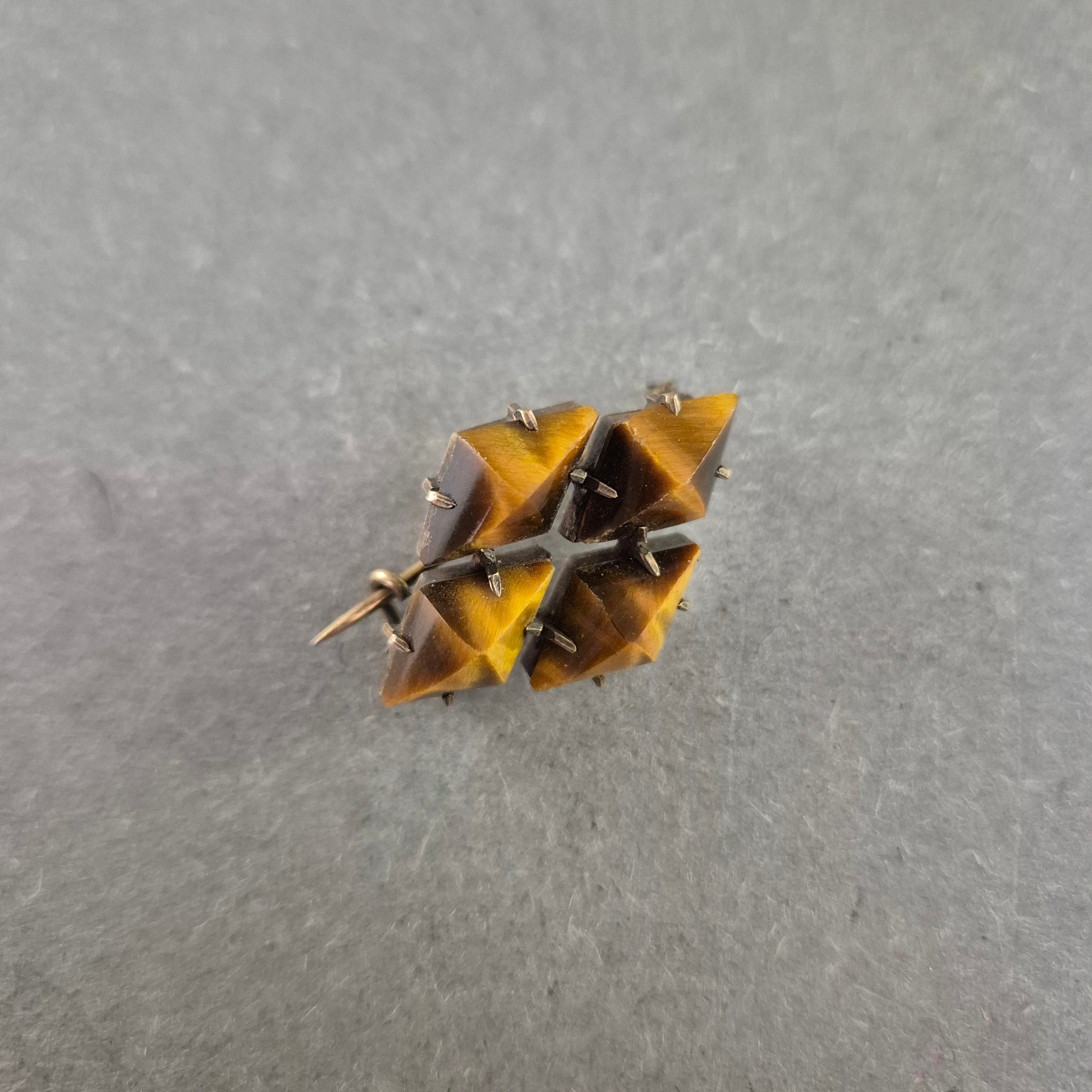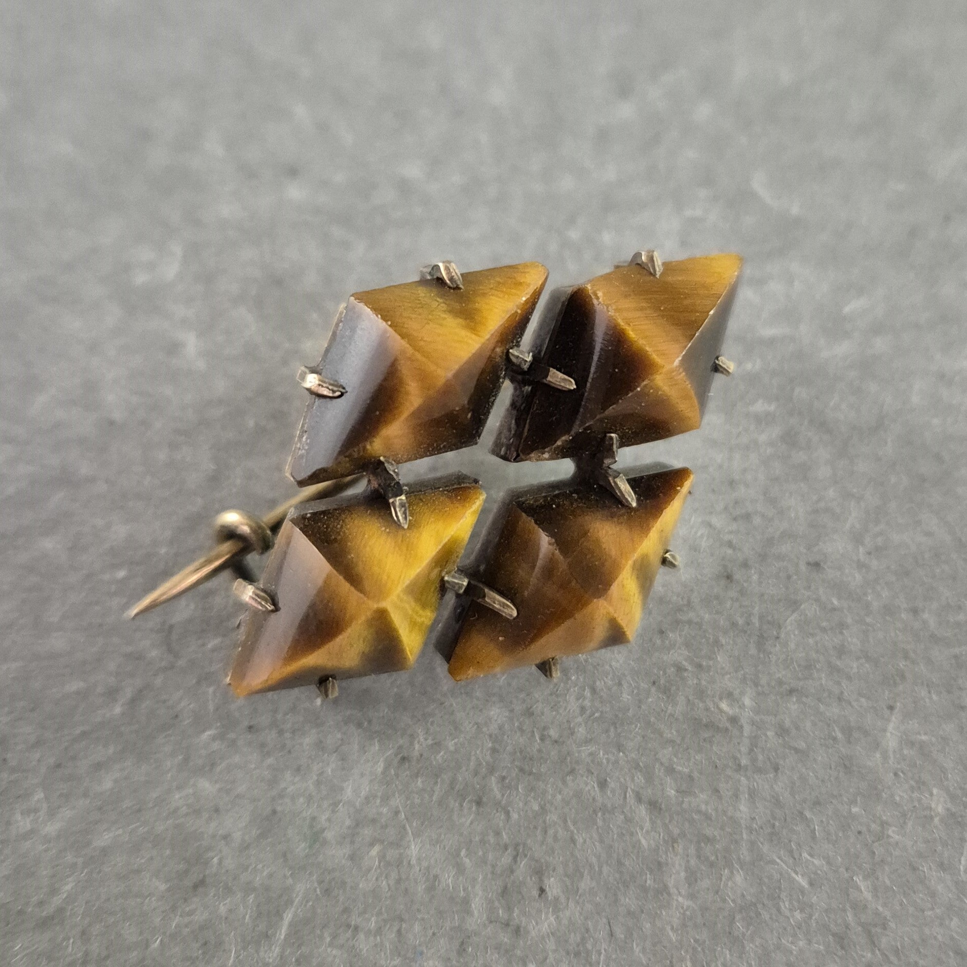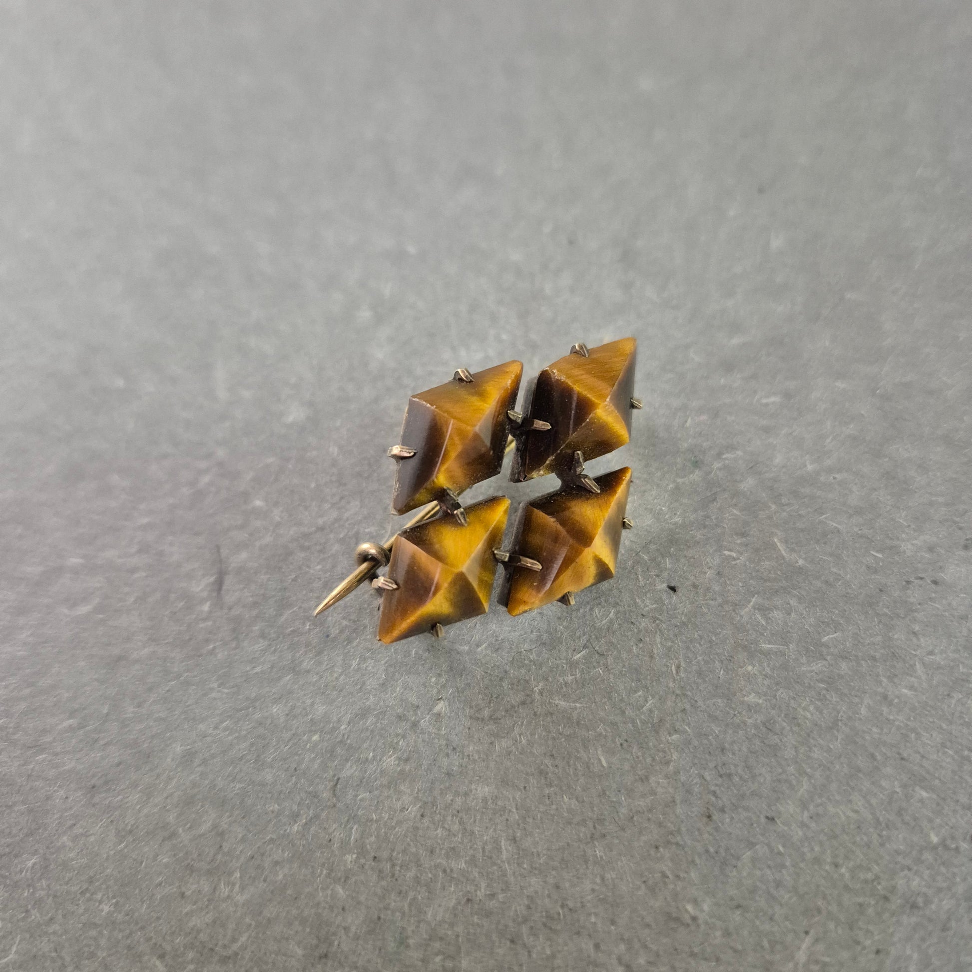Diese ausdrucksstarke Vintage-Brosche kombiniert vier polierte Tigerauge-Steine in pyramidenförmigem Schliff mit einer bronzefarbenen Fassung. Die geometrische Anordnung verleiht dem Stück einen modernen, kantigen Look, während das Tigerauge mit seinem natürlichen Schimmer klassische Eleganz ausstrahlt. Ein besonderes Accessoire für Sammler von Edelstein-Schmuckstücken oder Liebhaber seltener Vintage-Designs.