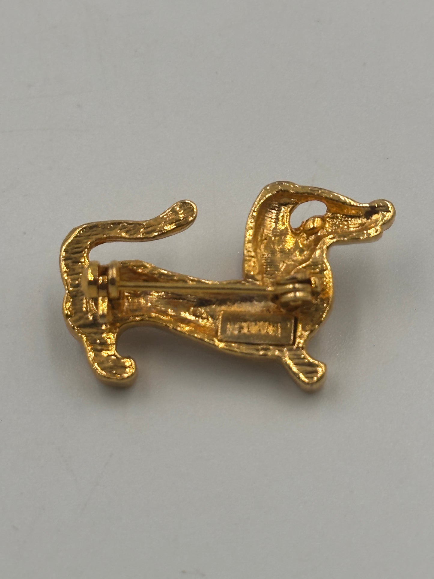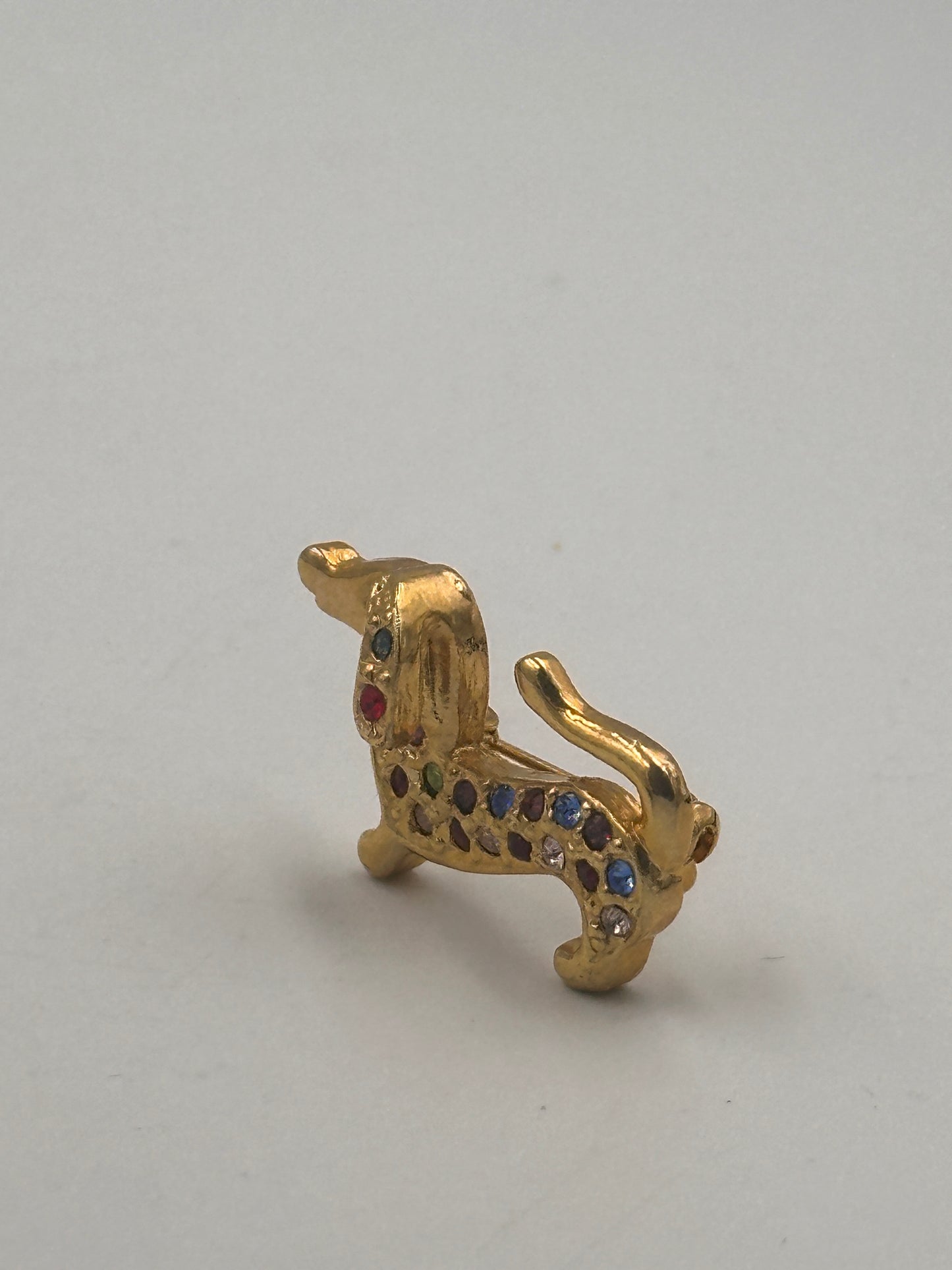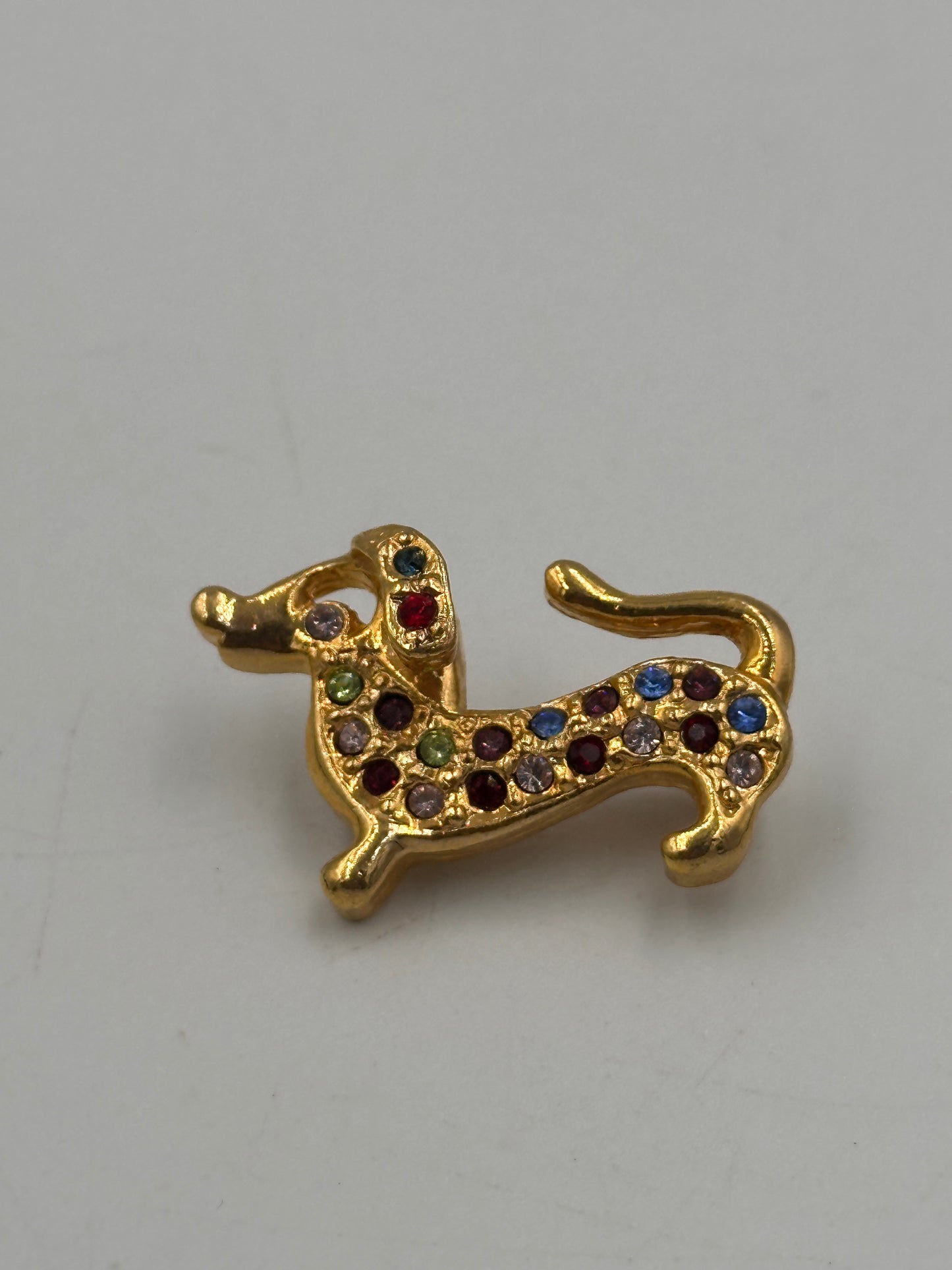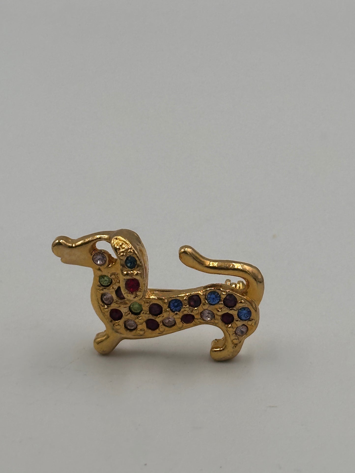 Diese einzigartige Vintage-Brosche in Form eines Dackels ist ein wahres Schmuckstück für Liebhaber des Besonderen. Die Brosche ist mit funkelnden Zirkonia-Steinen in verschiedenen Farben besetzt, die ihr ein bezauberndes und lebendiges Aussehen verleihen.