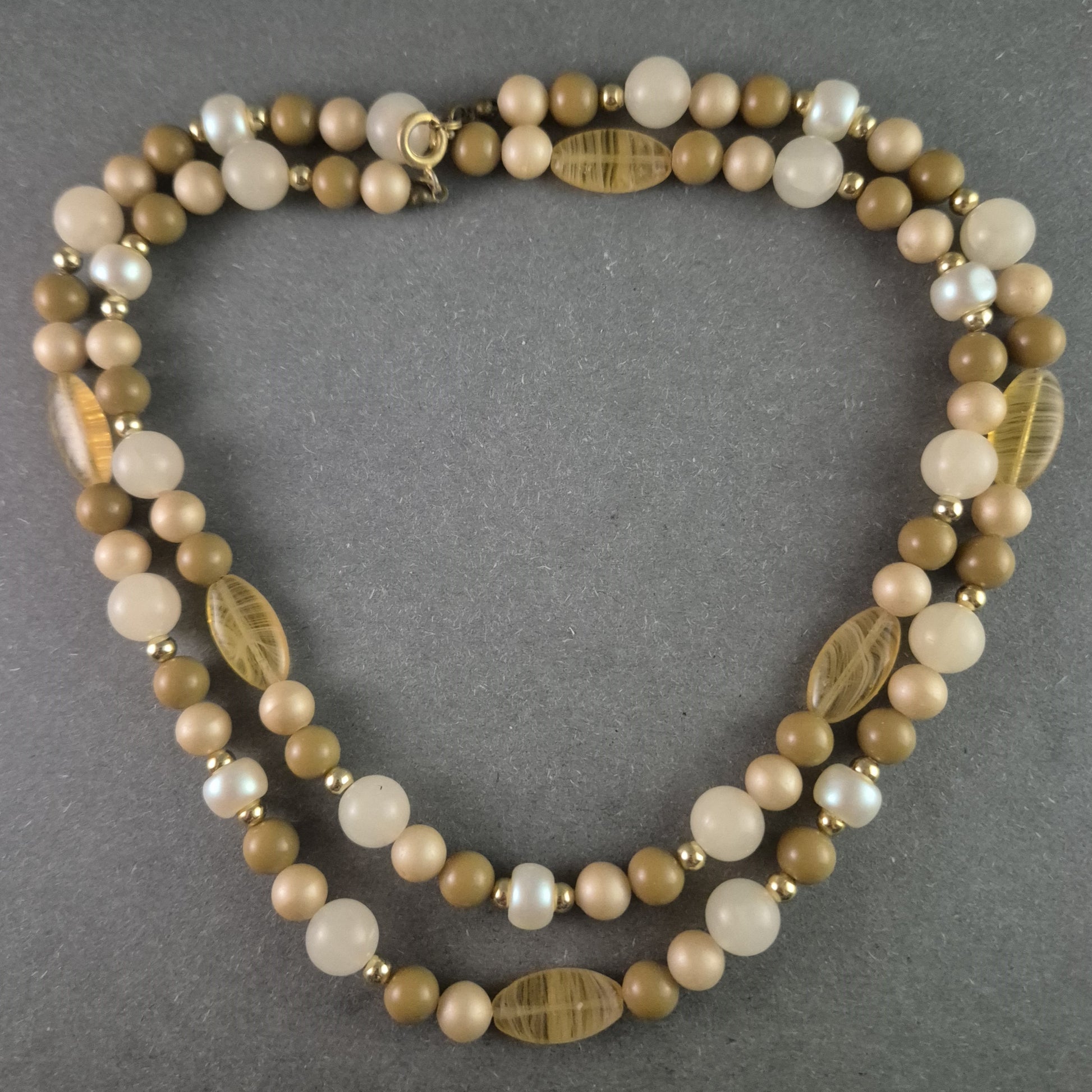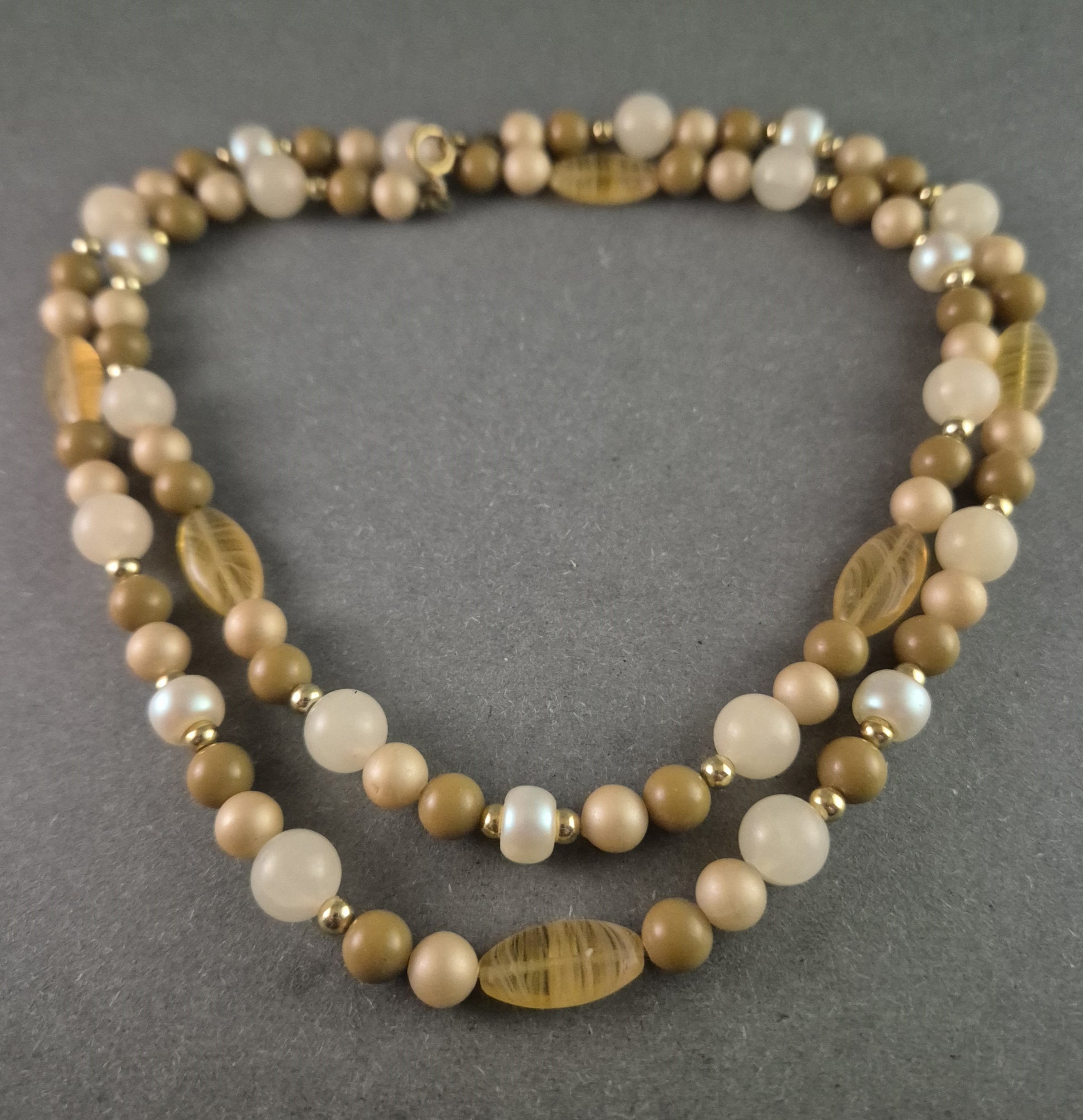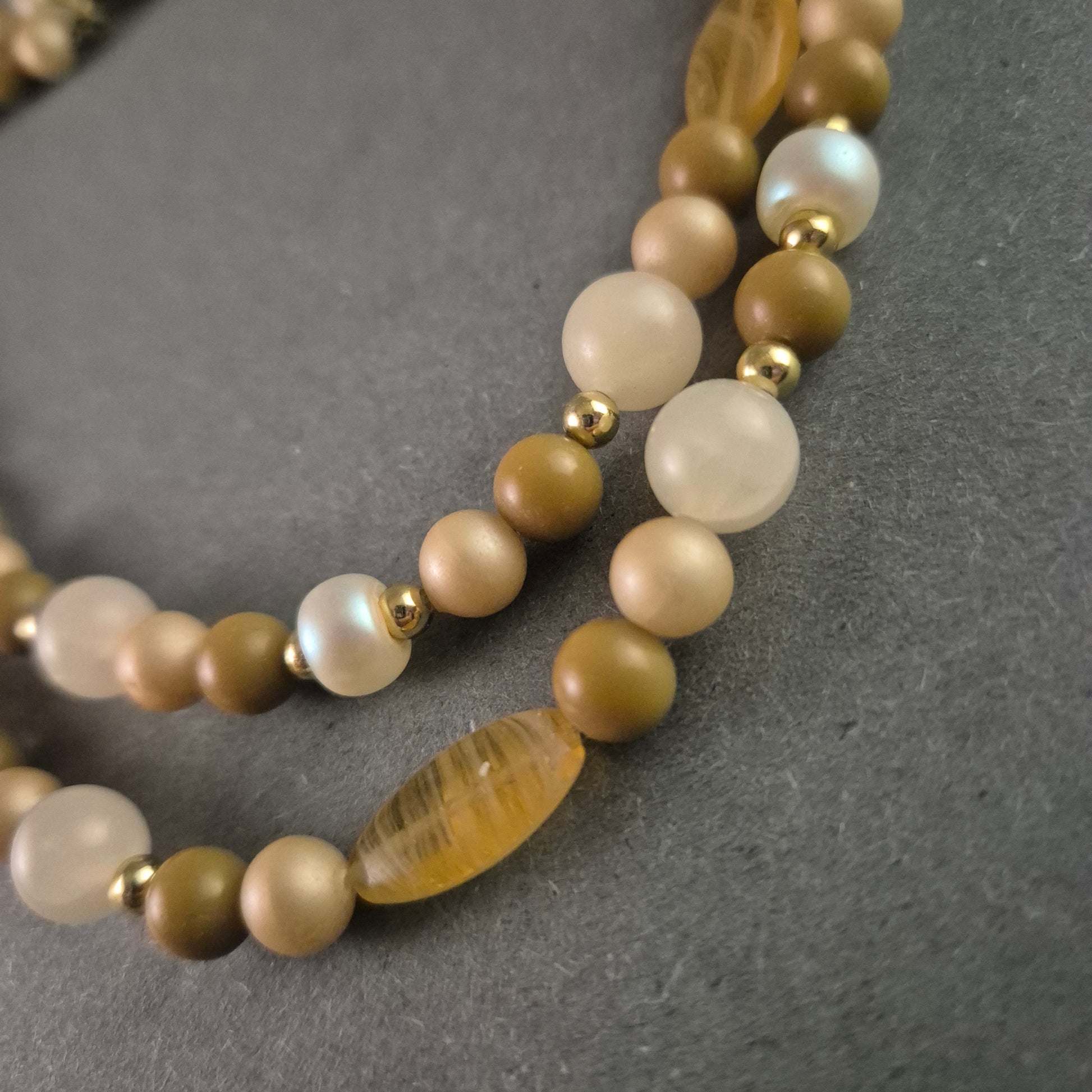 Diese elegante Vintage-Halskette besteht aus zwei Strängen mit harmonisch abgestimmten Naturstein- und Glasperlen in warmen Erdtönen. Die Kombination aus matten, schimmernden und facettierten Perlen verleiht der Kette eine natürliche Eleganz und eine besondere Tiefe. Goldfarbene Zwischenelemente runden das Design stilvoll ab. Ein wunderschönes Schmuckstück für Liebhaber von Naturmaterialien und zeitloser Eleganz.