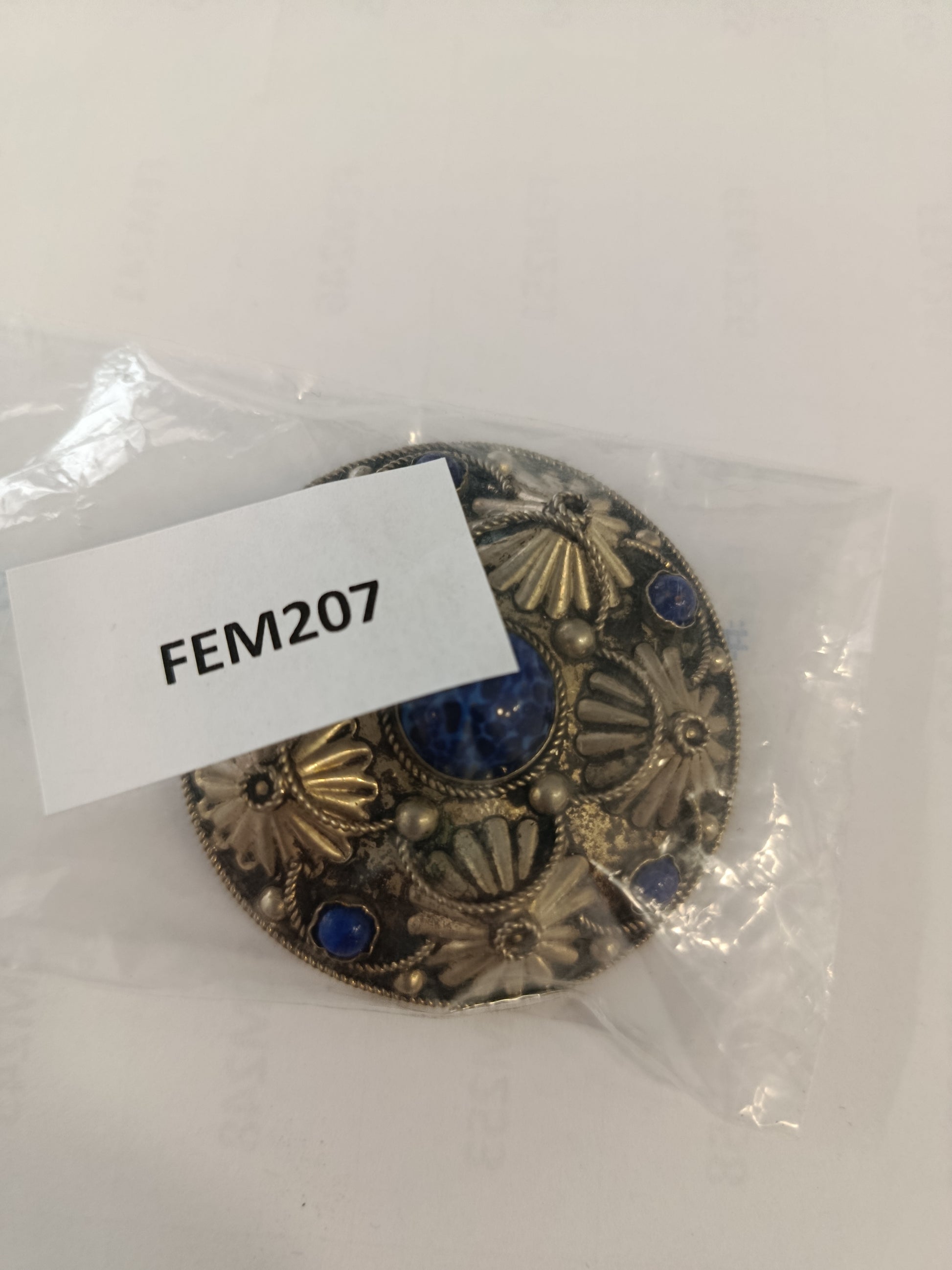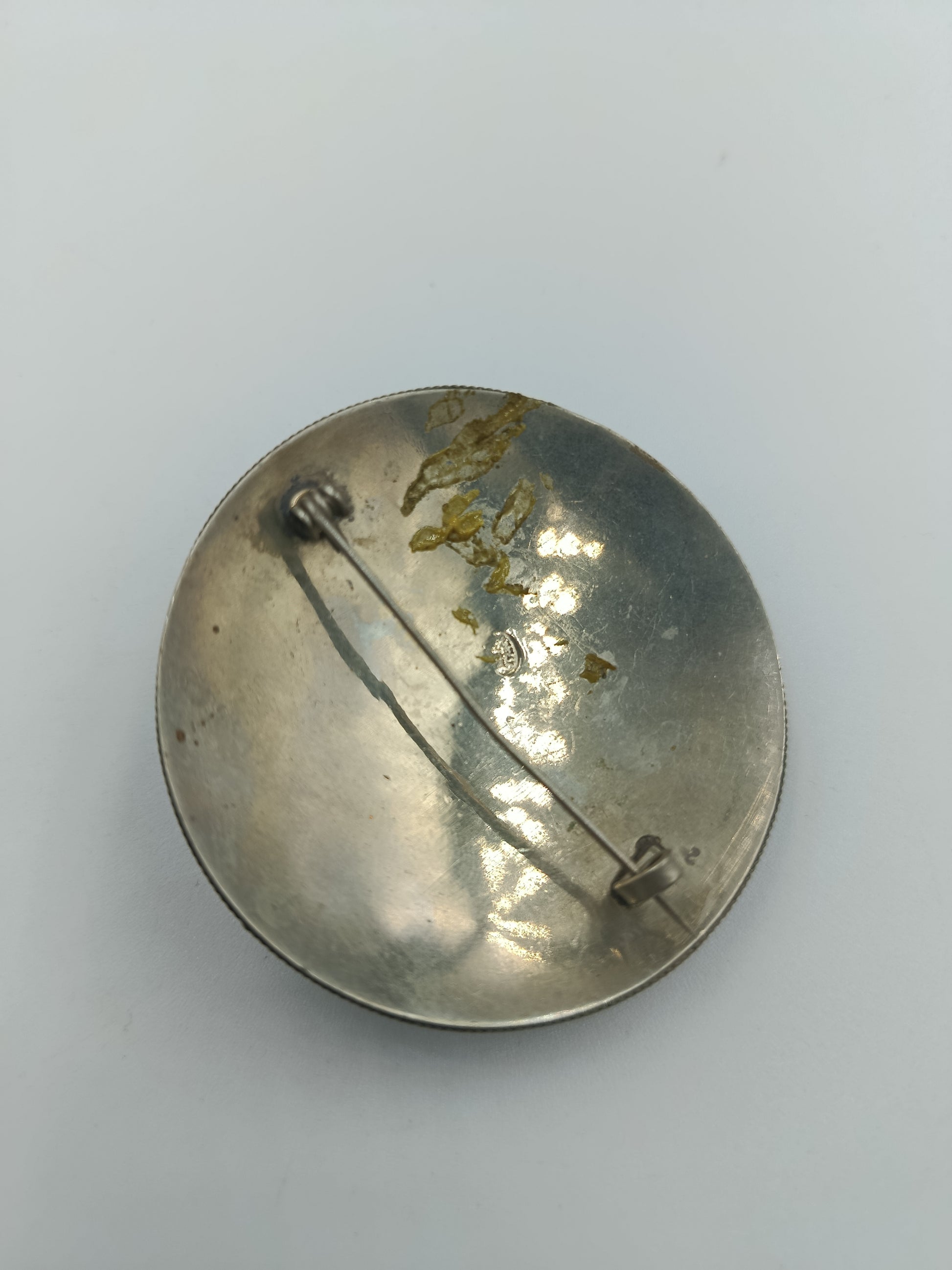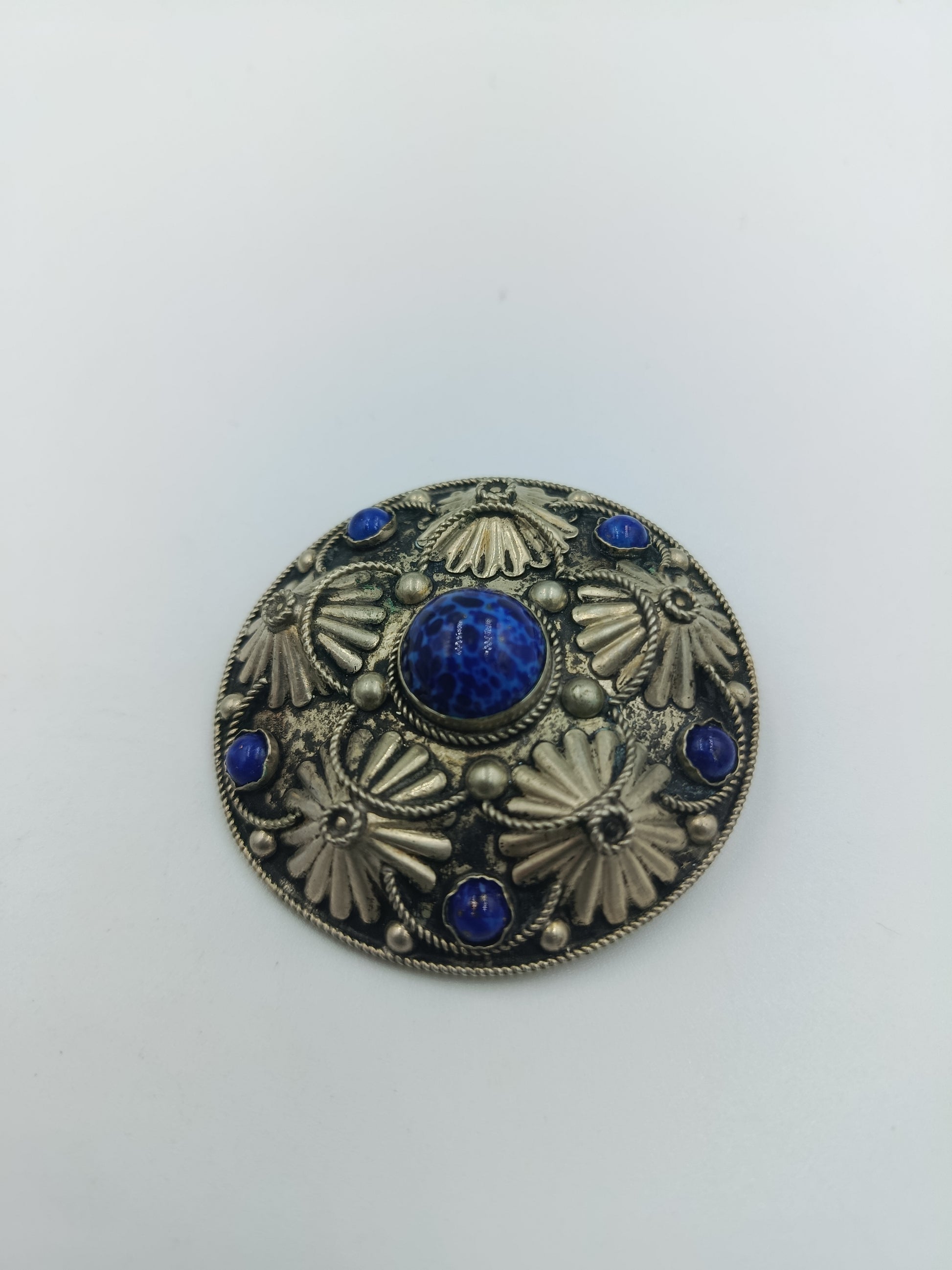 Große, runde Vintage-Brosche aus versilbertem Metall mit aufwendig gearbeitetem Reliefdekor und dunkelblauen Cabochon-Steinen. Die filigranen Blüten- und Ornamentmuster geben der Brosche einen antiken, folkloristischen Charakter – ein echter Blickfang auf Jacken, Schals oder Trachten.