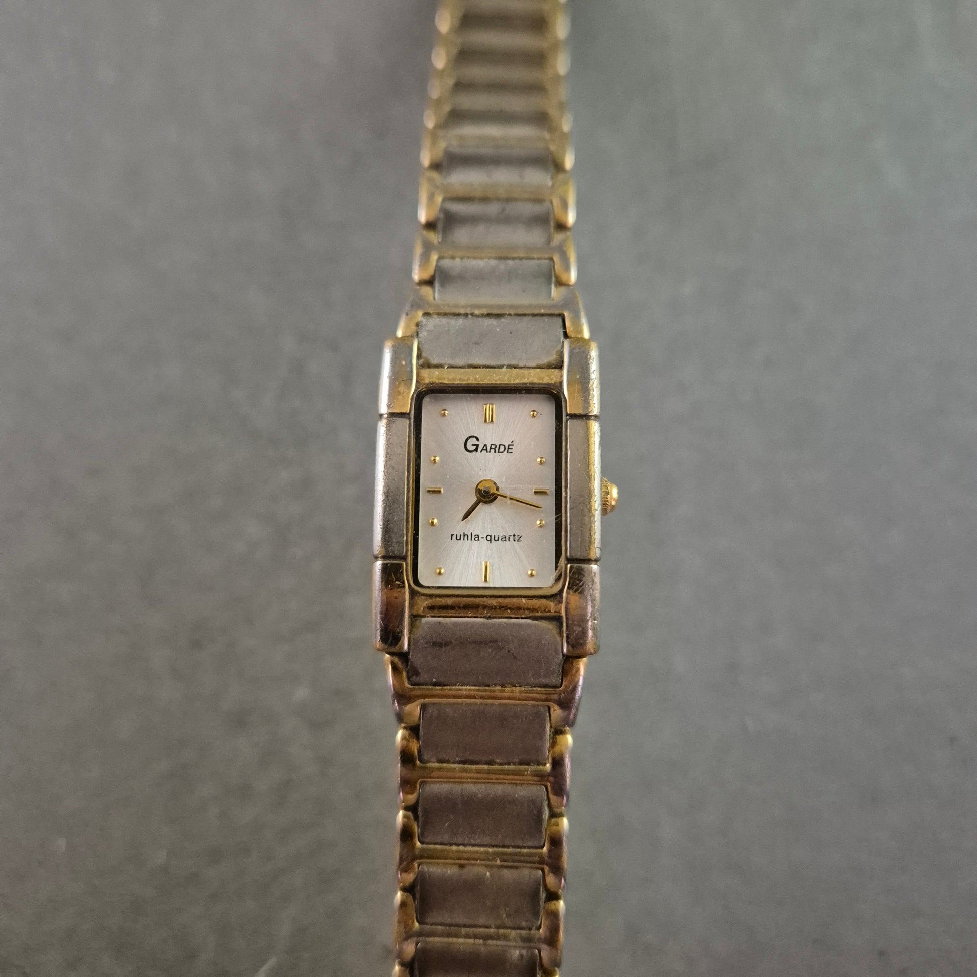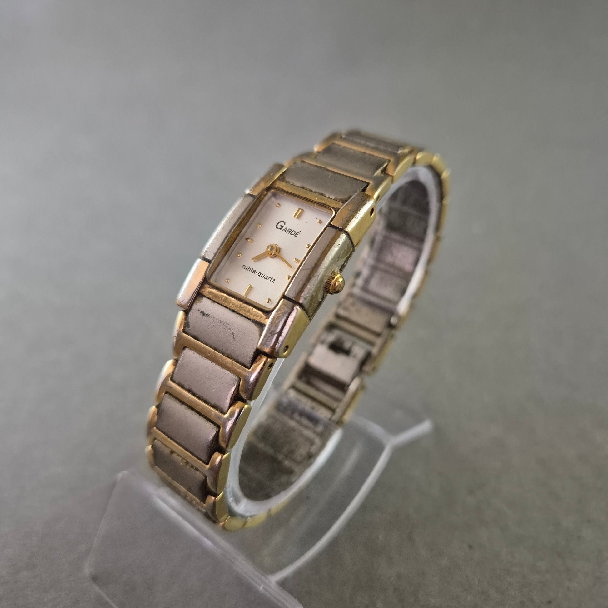Diese Garde Damen Uhr mit rechteckigem Gehäuse stammt aus der Ruhla-Quartz-Reihe und ist ein klassisches Modell aus deutscher Produktion. Das vergoldete Armband und das helle Zifferblatt mit goldfarbenen Stundenmarkierungen unterstreichen den eleganten Vintage-Charakter. Die Uhr zeigt deutliche Gebrauchsspuren, funktioniert jedoch mit einem zuverlässigen Quarzwerk.