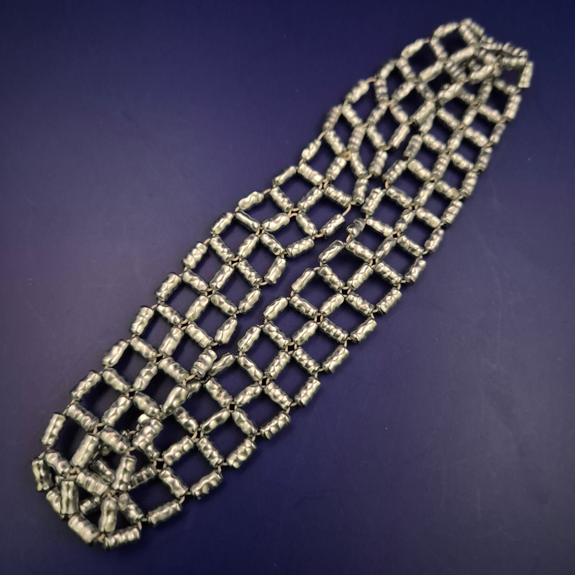 Dieses ausgefallene Collier im Netzdesign ist aus zahlreichen silberfarbenen Glasperlen kunstvoll geknüpft. Die symmetrische Gitterstruktur sorgt für einen auffälligen Look, der sowohl elegant als auch verspielt wirkt. Das flexible, anschmiegsame Material passt sich angenehm dem Hals an und macht das Collier zu einem idealen Statement-Piece für besondere Anlässe.