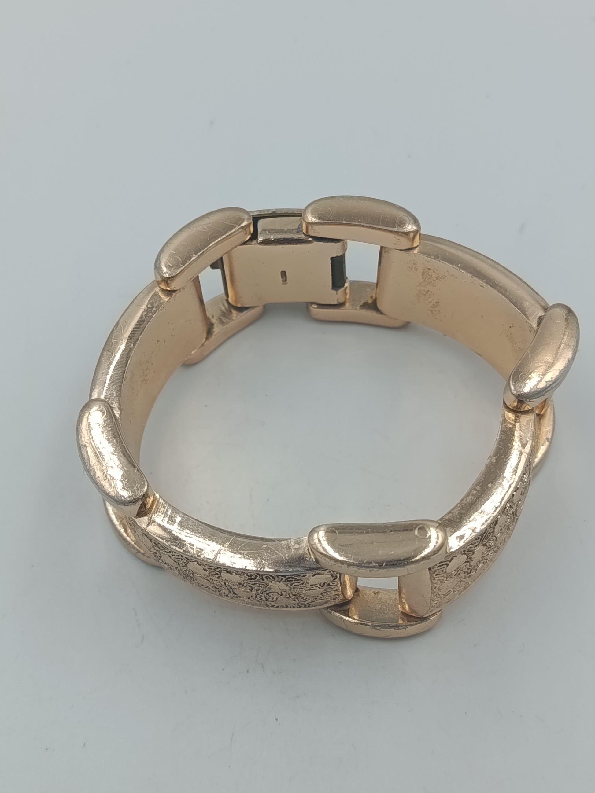 Edles Vintage-Armband aus Metall in warmer Goldoptik mit fein strukturiertem Dekor auf den breiten Gliedern. Die stabile Gliederkonstruktion und der integrierte Kastenschluss sorgen für sicheren Halt und ein angenehmes Tragegefühl. Ein klassisches Schmuckstück im Retro-Stil – perfekt für Liebhaber zeitloser Accessoires.