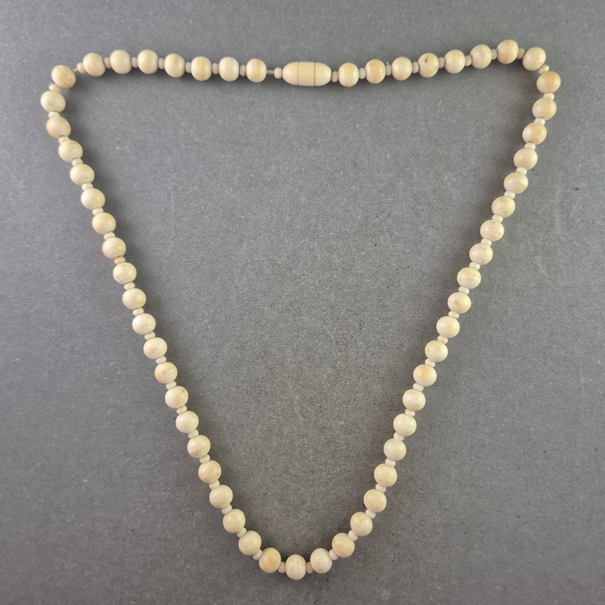 Diese schlichte Vintage Halskette besticht durch ihre gleichmäßig geformten, cremefarbenen Kugelperlen. Die Perlen aus leichtem Kunststoff oder Harz sind fein aufgereiht und schließen mit einem praktischen Schraubverschluss. Durch ihre neutrale Farbe ist die Kette vielseitig kombinierbar – ein klassisches Accessoire für den Alltag oder elegante Anlässe.
