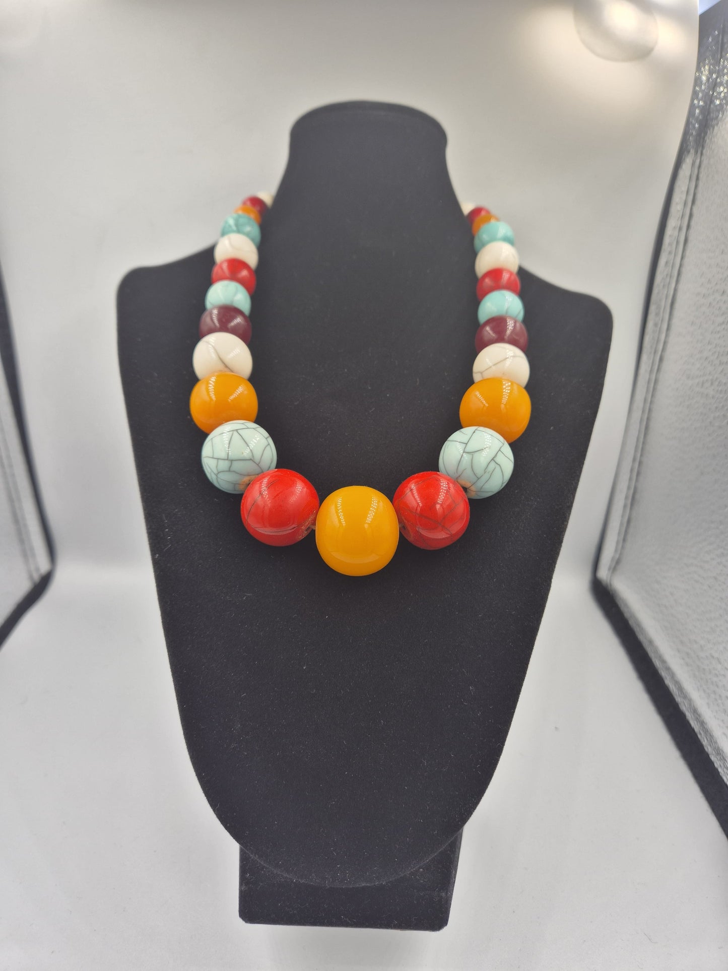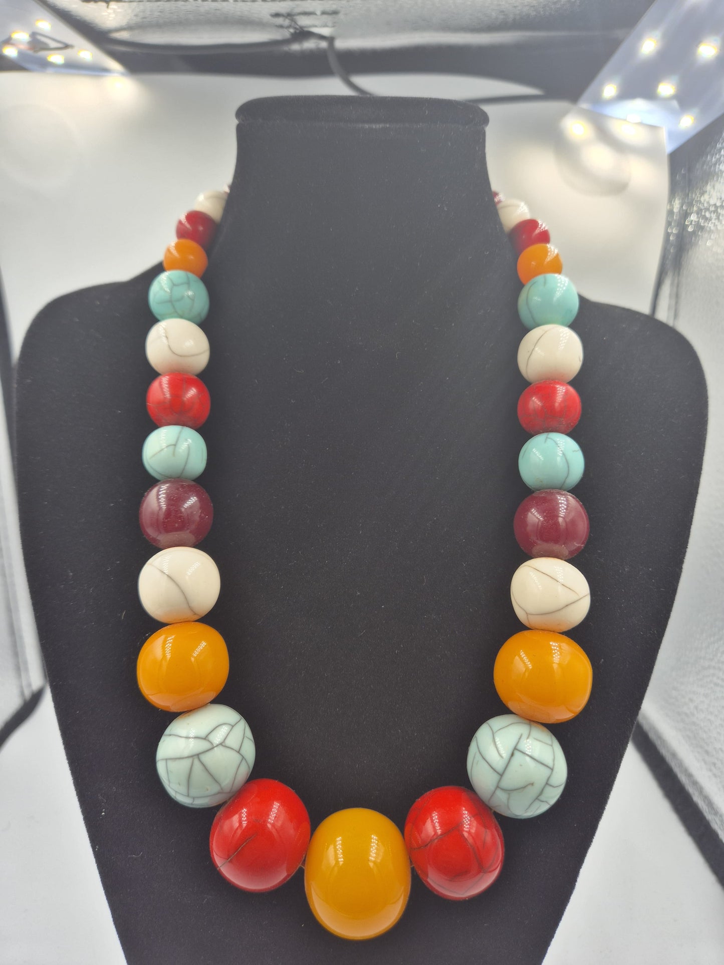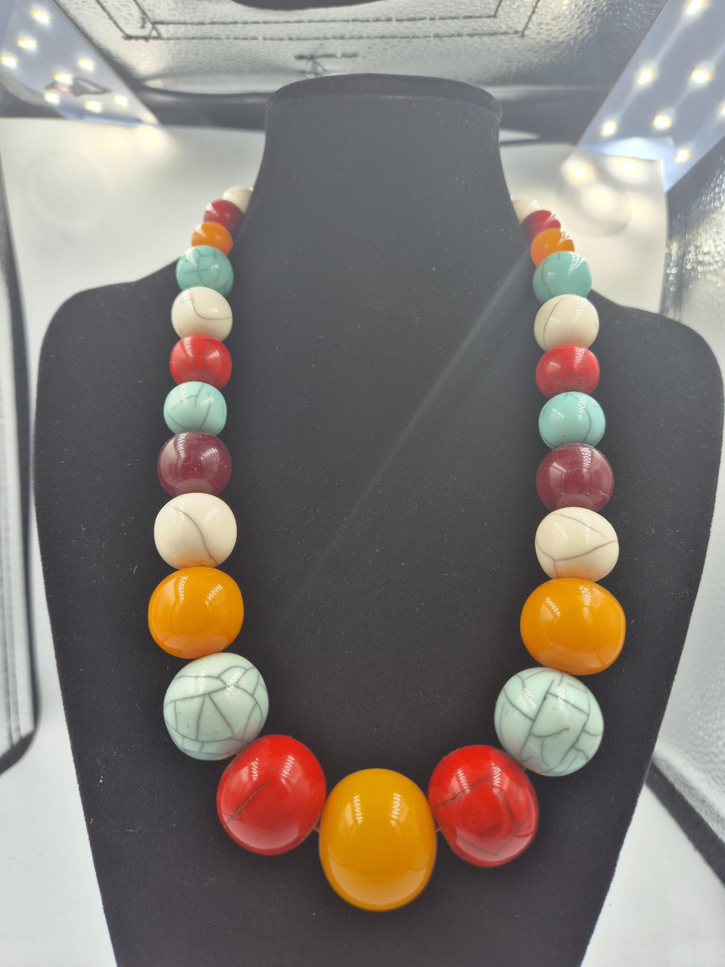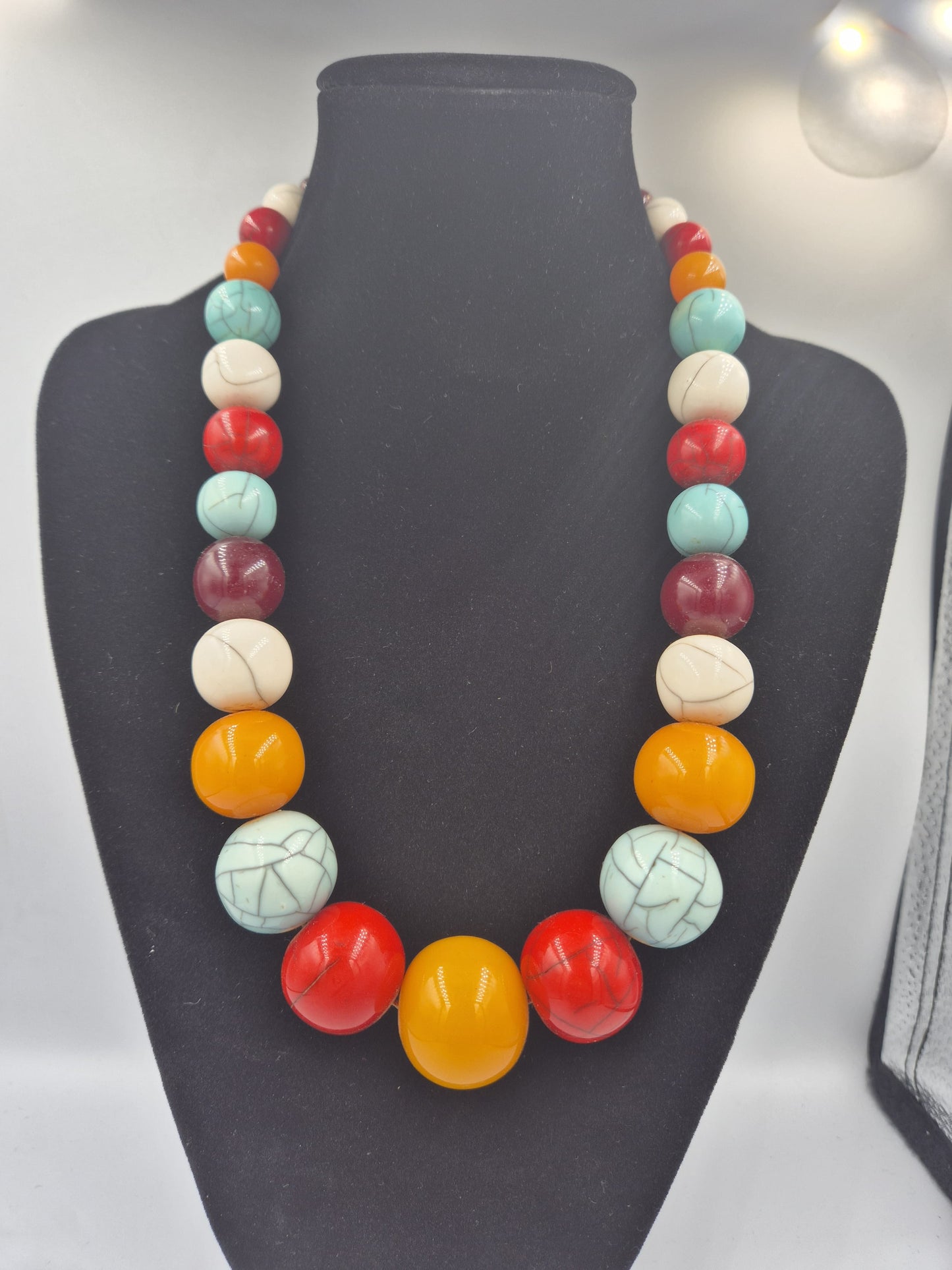 Diese einzigartige Vintage Halskette vereint kräftiges Rot mit einer faszinierenden Türkis-Marmor-Optik und wird so zum Highlight in jeder Schmucksammlung. Die großen, kugelförmigen Perlen verleihen dem Schmuckstück einen unverwechselbaren Charme. Dank der sorgfältigen Verarbeitung strahlt diese Kette nicht nur Stil, sondern auch Robustheit aus – ideal für Liebhaber zeitloser Vintage-Stücke.
