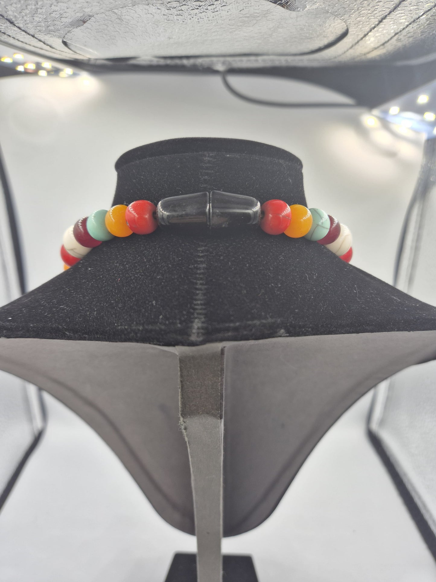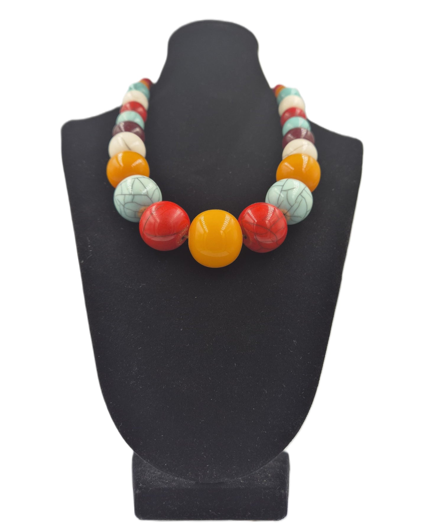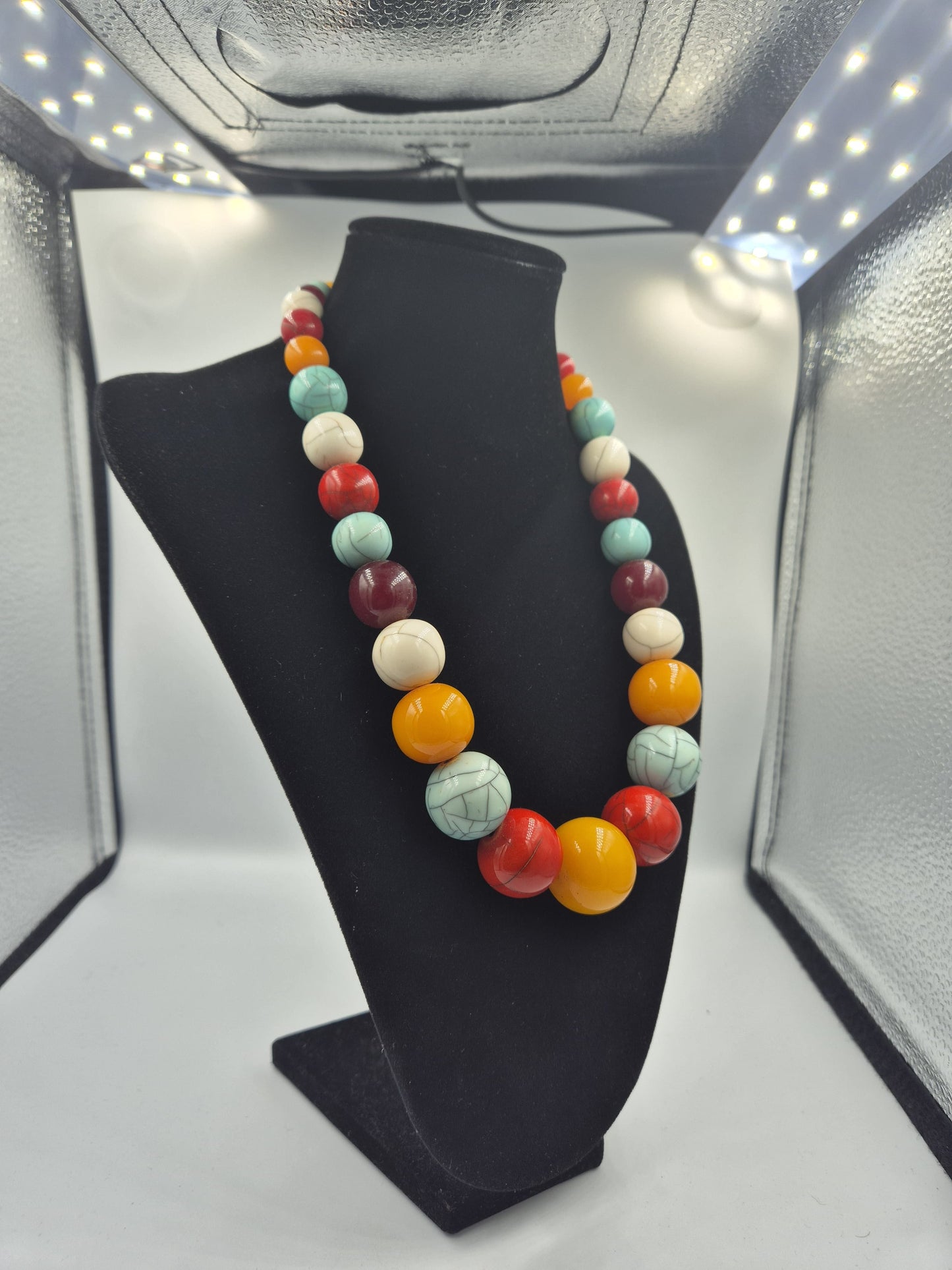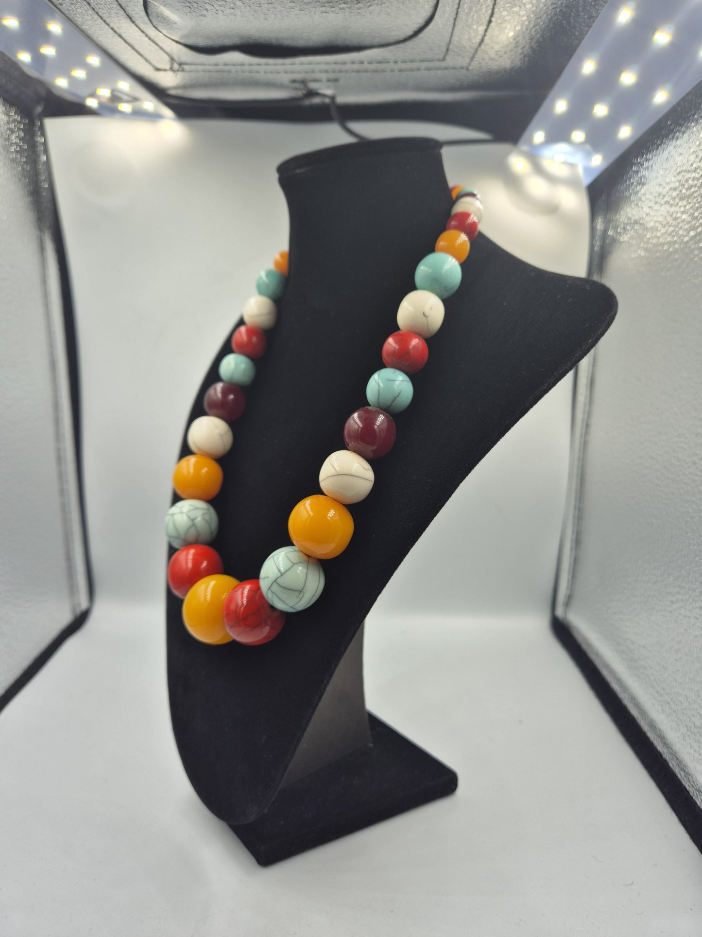 Diese einzigartige Vintage Halskette vereint kräftiges Rot mit einer faszinierenden Türkis-Marmor-Optik und wird so zum Highlight in jeder Schmucksammlung. Die großen, kugelförmigen Perlen verleihen dem Schmuckstück einen unverwechselbaren Charme. Dank der sorgfältigen Verarbeitung strahlt diese Kette nicht nur Stil, sondern auch Robustheit aus – ideal für Liebhaber zeitloser Vintage-Stücke.