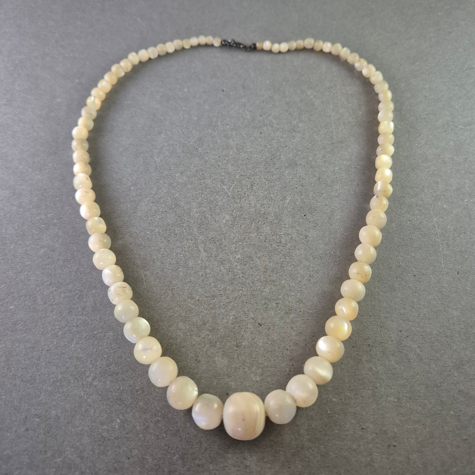 Diese zeitlose Vintage Halskette besteht aus cremefarbenen Perlen in abgestufter Größe, die ihr eine elegante und harmonische Ausstrahlung verleihen. Die größeren Mittelperlen bilden den Blickfang, während die kleineren Perlen zum Verschluss hin dezent auslaufen. Mit ihrem klassischen Design passt sie perfekt zu festlicher Garderobe, kann aber auch als stilvolles Accessoire im Alltag getragen werden.