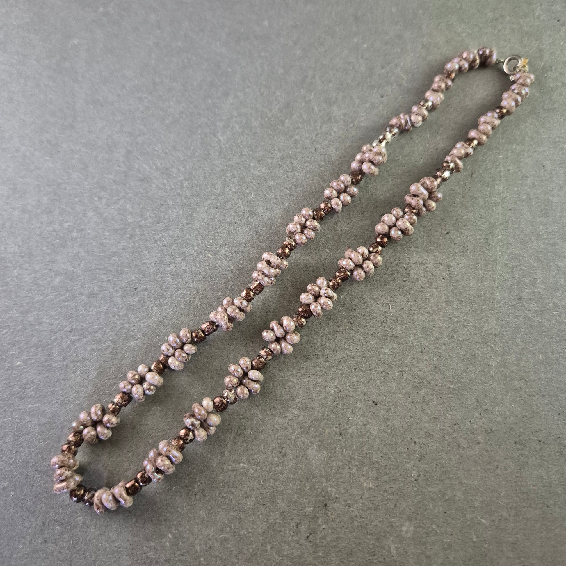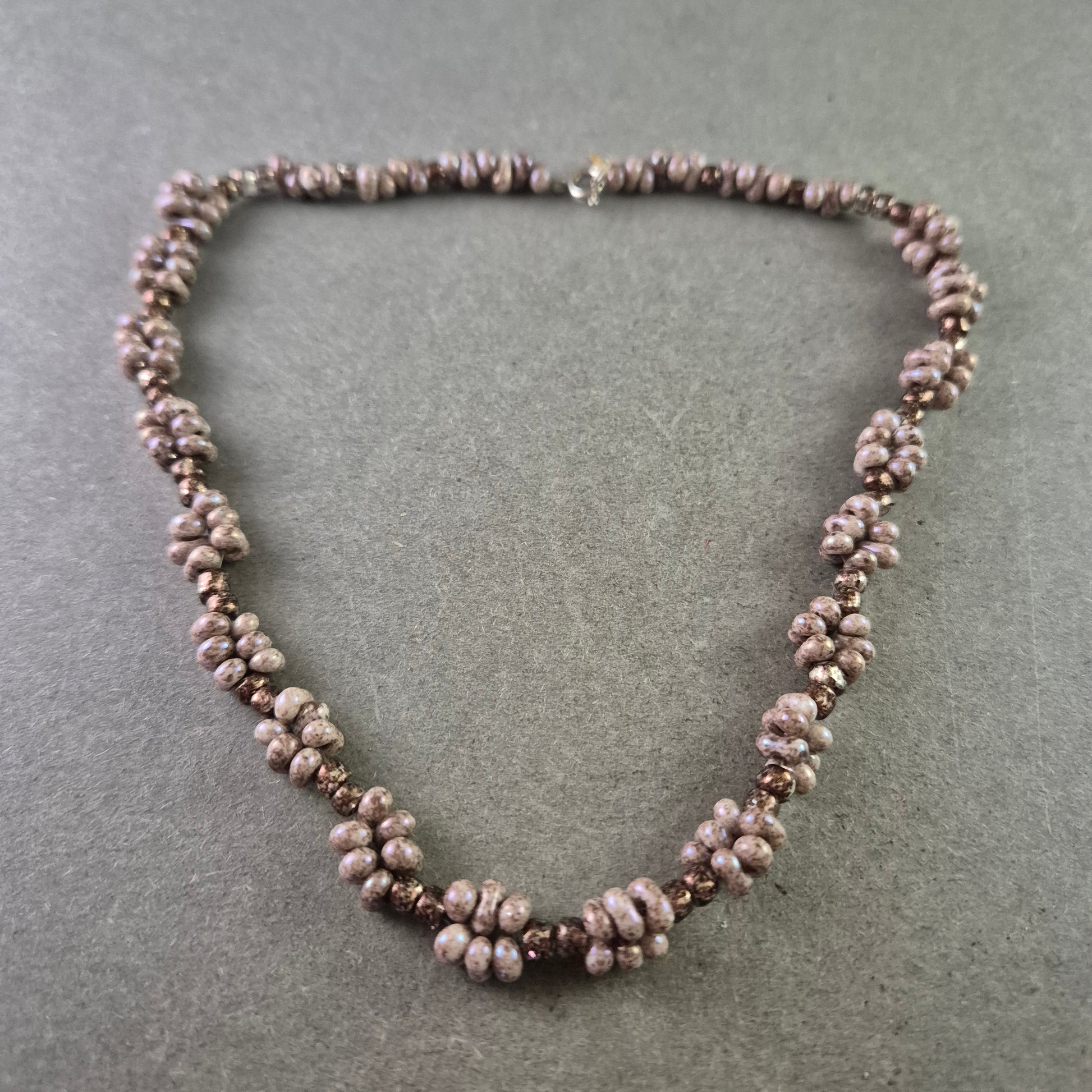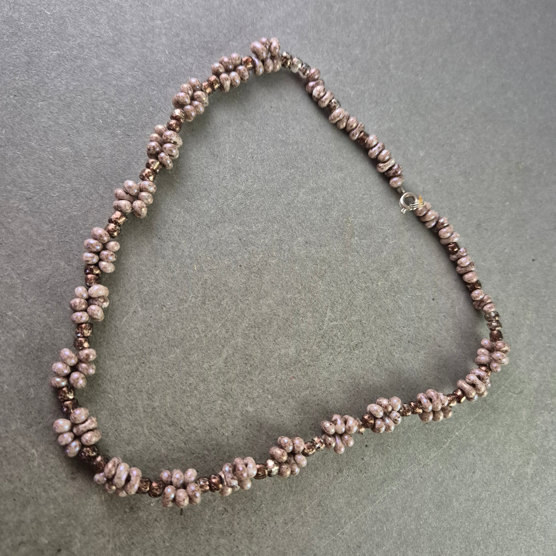 Diese dekorative Vintage Halskette besticht durch ihr außergewöhnliches Blütenmuster, das aus rosafarbenen Glasperlen und kleineren braun schimmernden Zwischenperlen gefertigt ist. Die Perlen sind zu kleinen Blütenformen arrangiert und verleihen der Kette eine verspielte und zugleich elegante Ausstrahlung. Mit ihrem charmanten Retro-Charakter ist sie das perfekte Accessoire für besondere Anlässe oder als auffälliger Hingucker im Alltag.