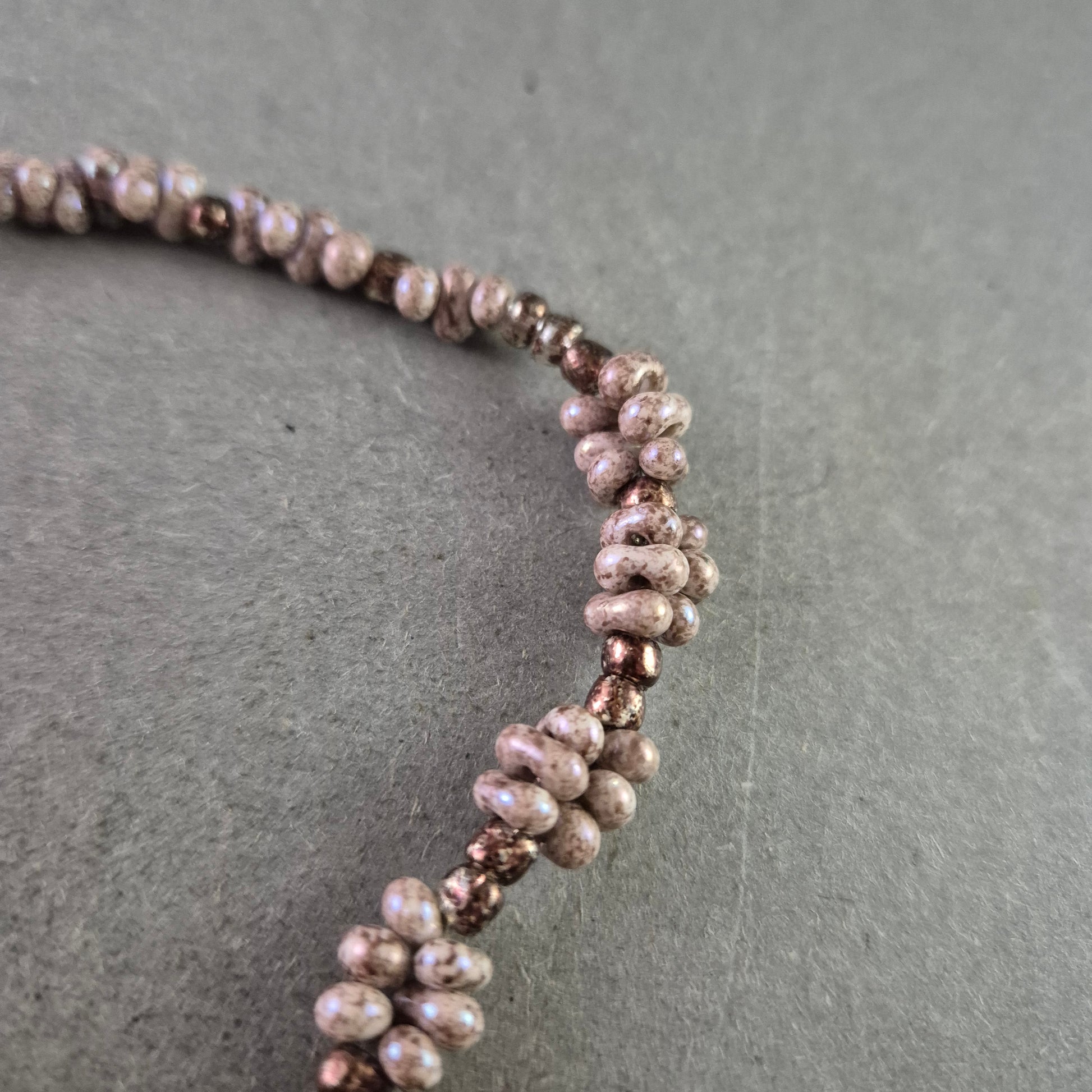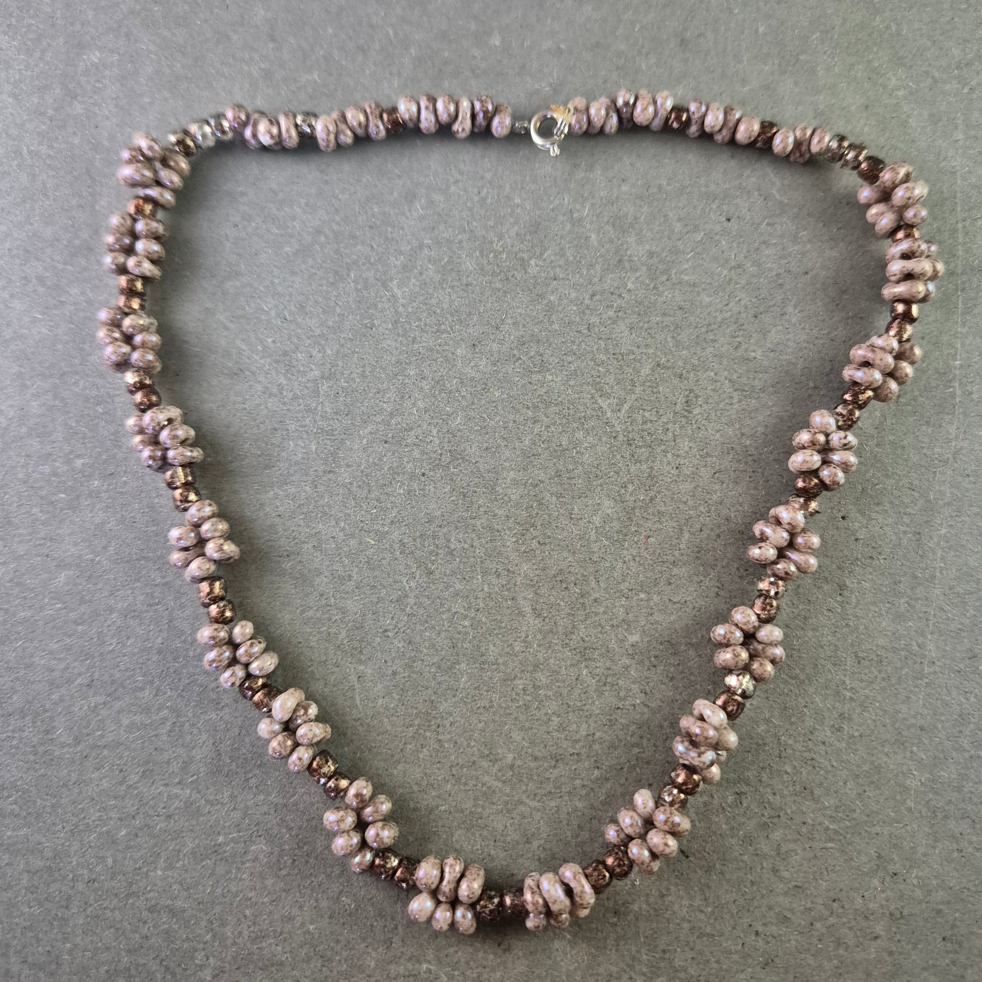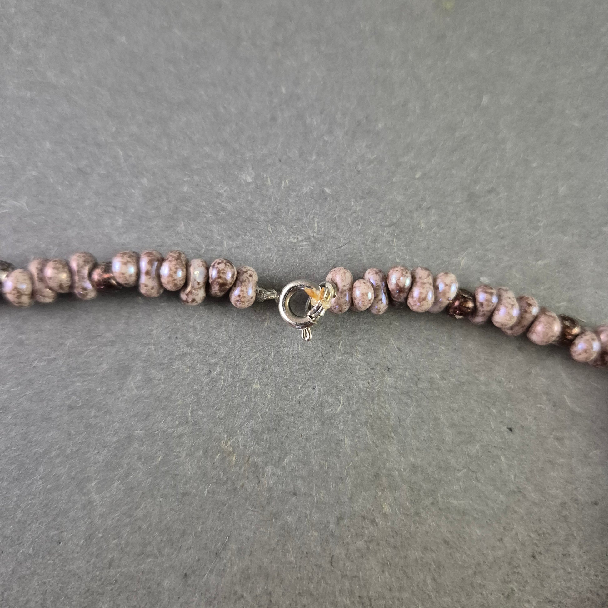Diese dekorative Vintage Halskette besticht durch ihr außergewöhnliches Blütenmuster, das aus rosafarbenen Glasperlen und kleineren braun schimmernden Zwischenperlen gefertigt ist. Die Perlen sind zu kleinen Blütenformen arrangiert und verleihen der Kette eine verspielte und zugleich elegante Ausstrahlung. Mit ihrem charmanten Retro-Charakter ist sie das perfekte Accessoire für besondere Anlässe oder als auffälliger Hingucker im Alltag.
