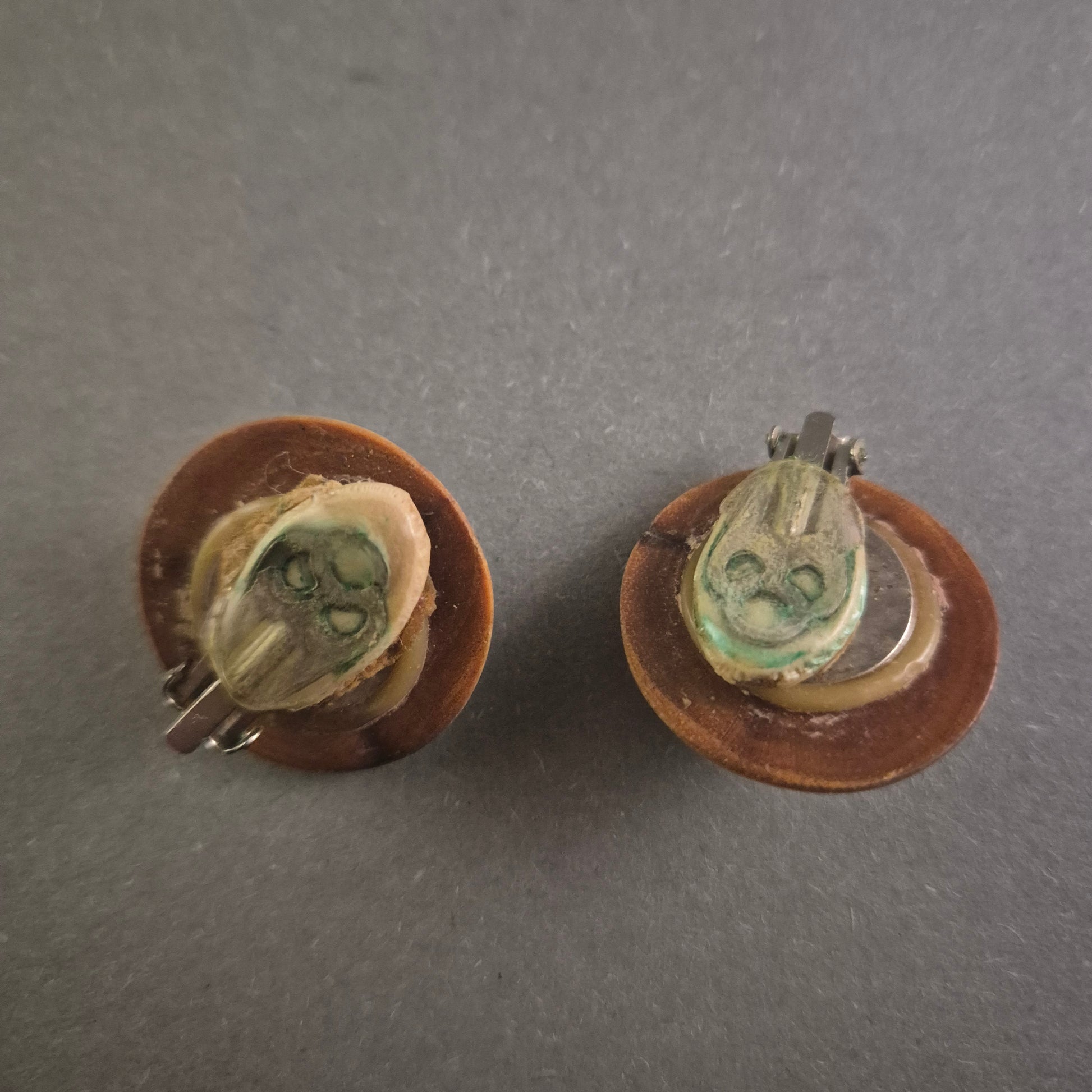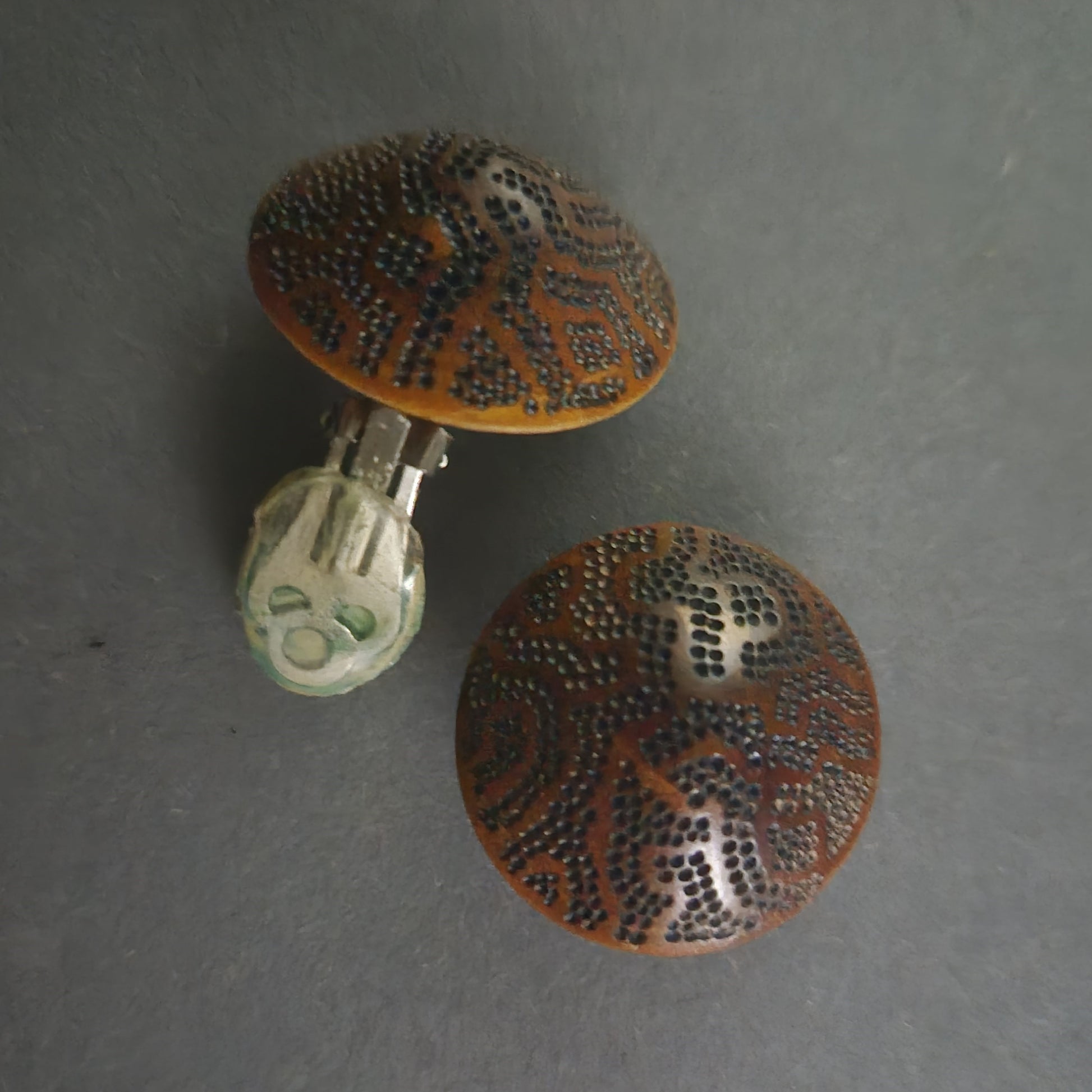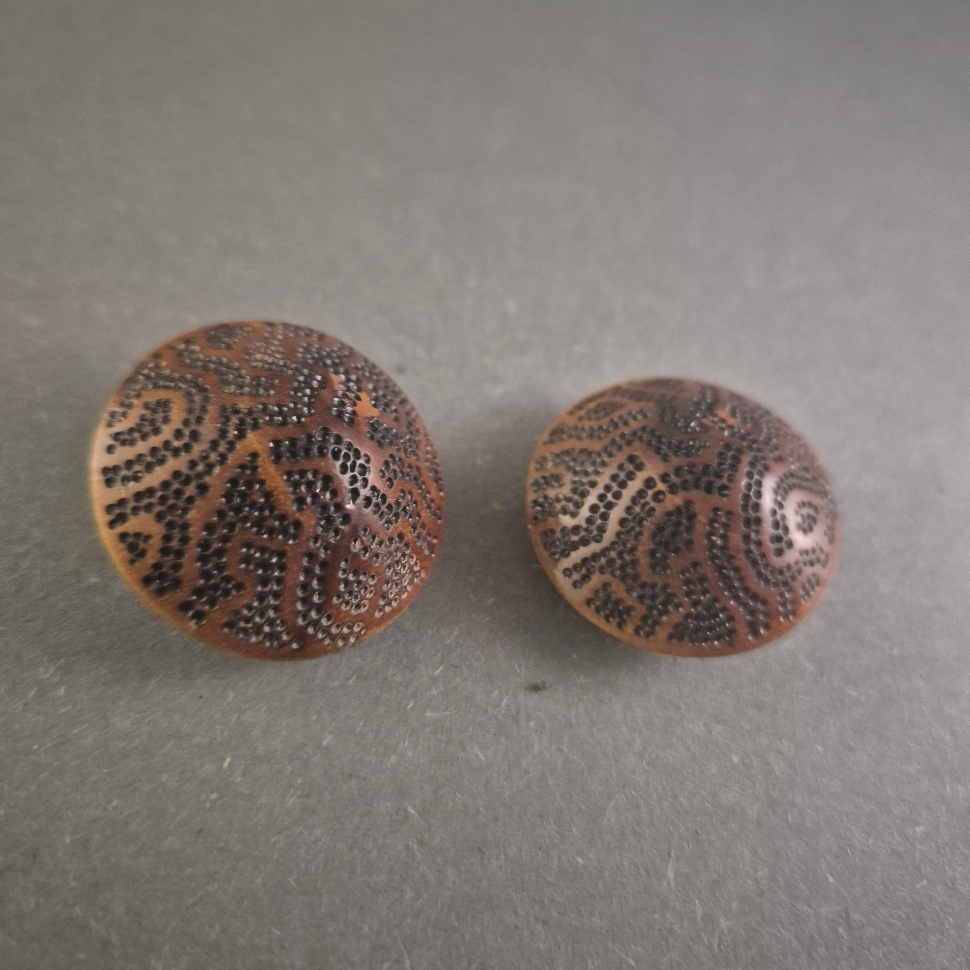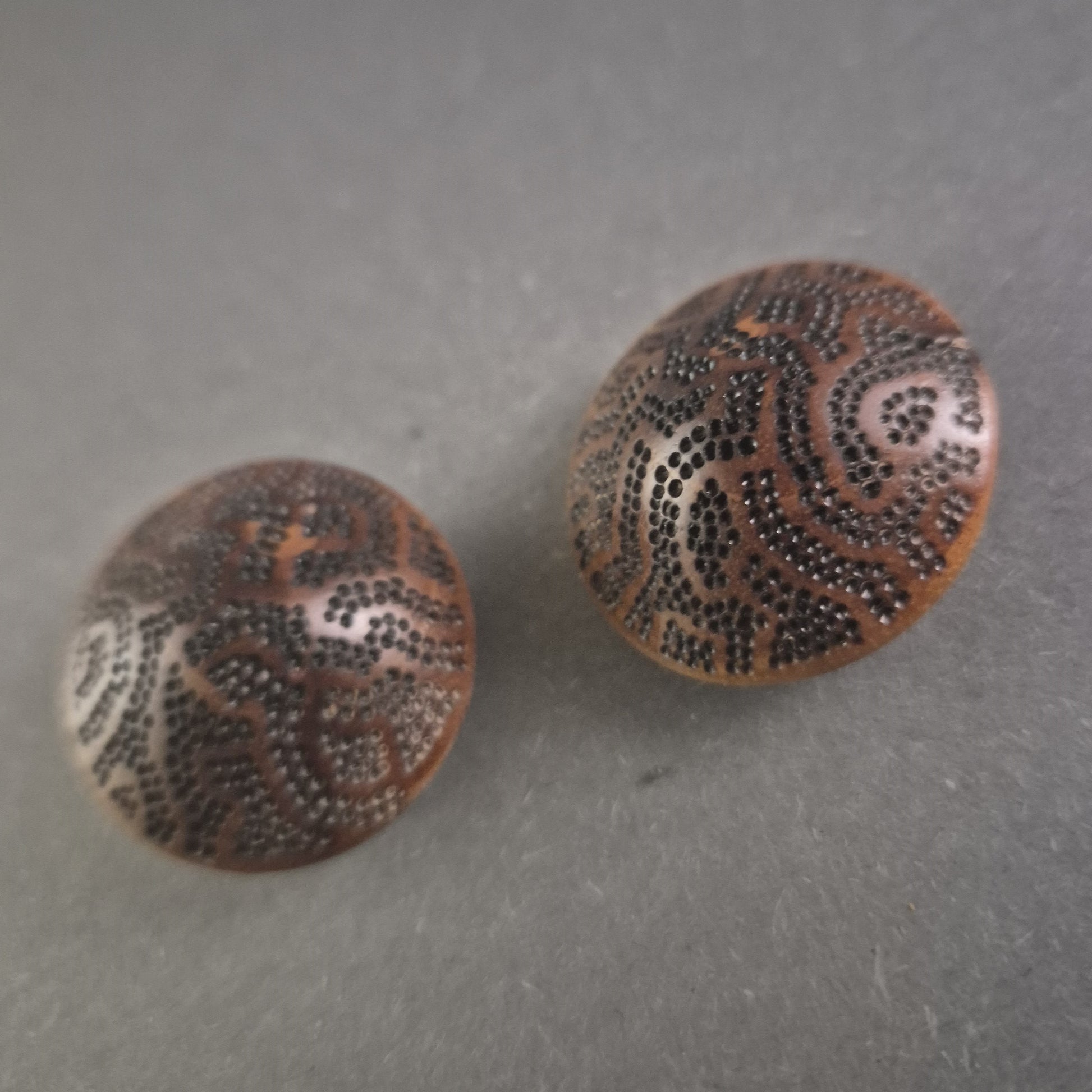 Diese einzigartigen Vintage-Manschettenknöpfe bestehen aus edlem Holz mit feinen, kunstvollen Gravuren, die ein dekoratives Muster formen. Die warmen Brauntöne und die detaillierte Verzierung verleihen diesen Schmuckstücken eine besondere Eleganz und Individualität. Dank ihrer seltenen Machart sind sie ein außergewöhnlicher Hingucker für stilbewusste Herren.