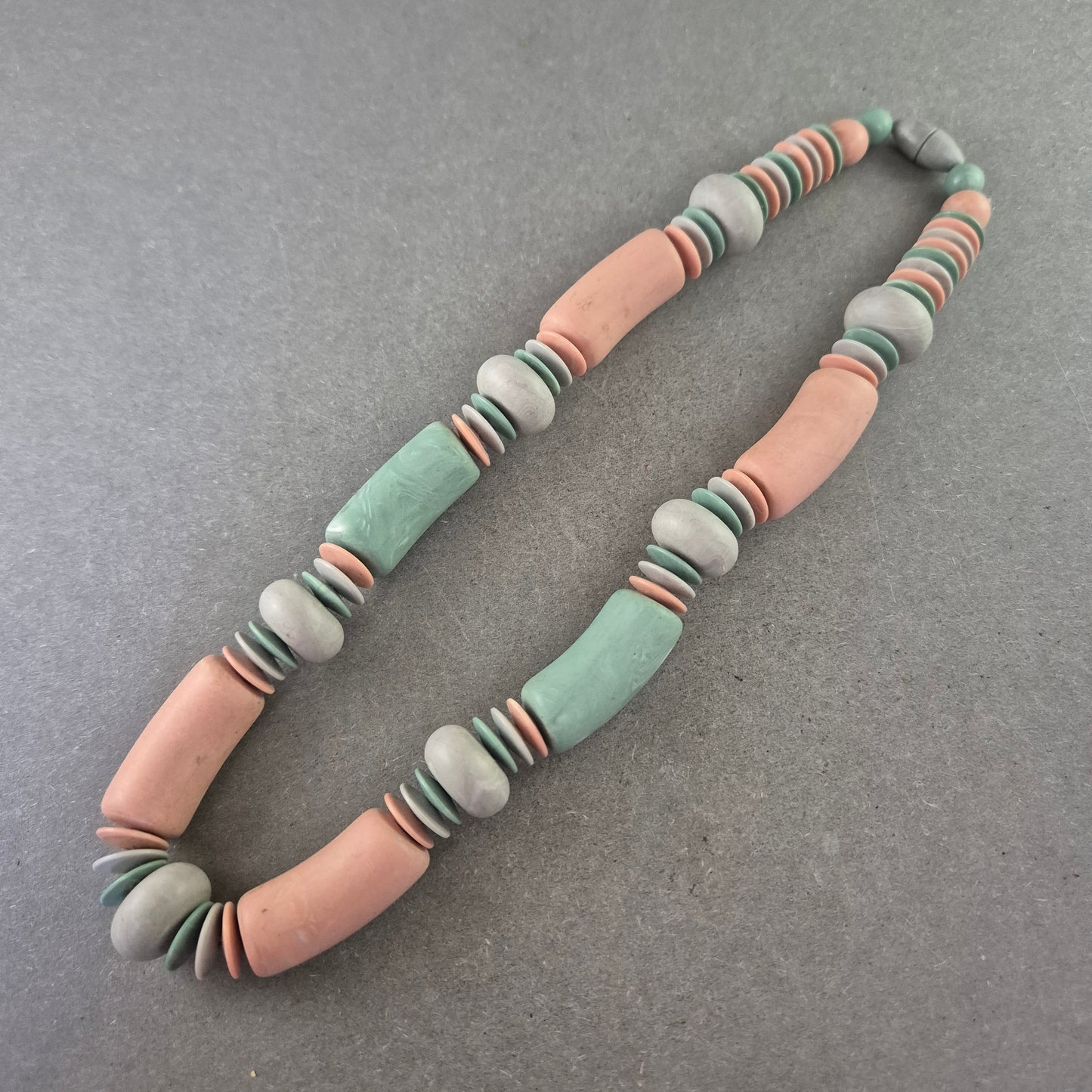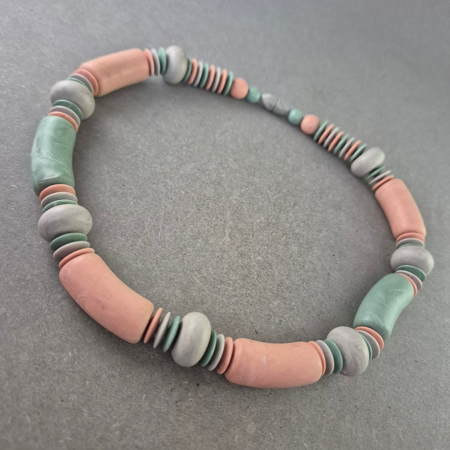 Diese auffällige Vintage-Kette besticht durch ihre handgefertigten Keramikelemente in zarten Pastelltönen wie Rosé, Mintgrün und Hellgrau. Die unterschiedlich geformten Glieder verleihen der Kette einen individuellen, kunstvollen Charakter. Ideal für Liebhaber von Boho-Schmuck und farbenfrohen Akzenten im Alltag.