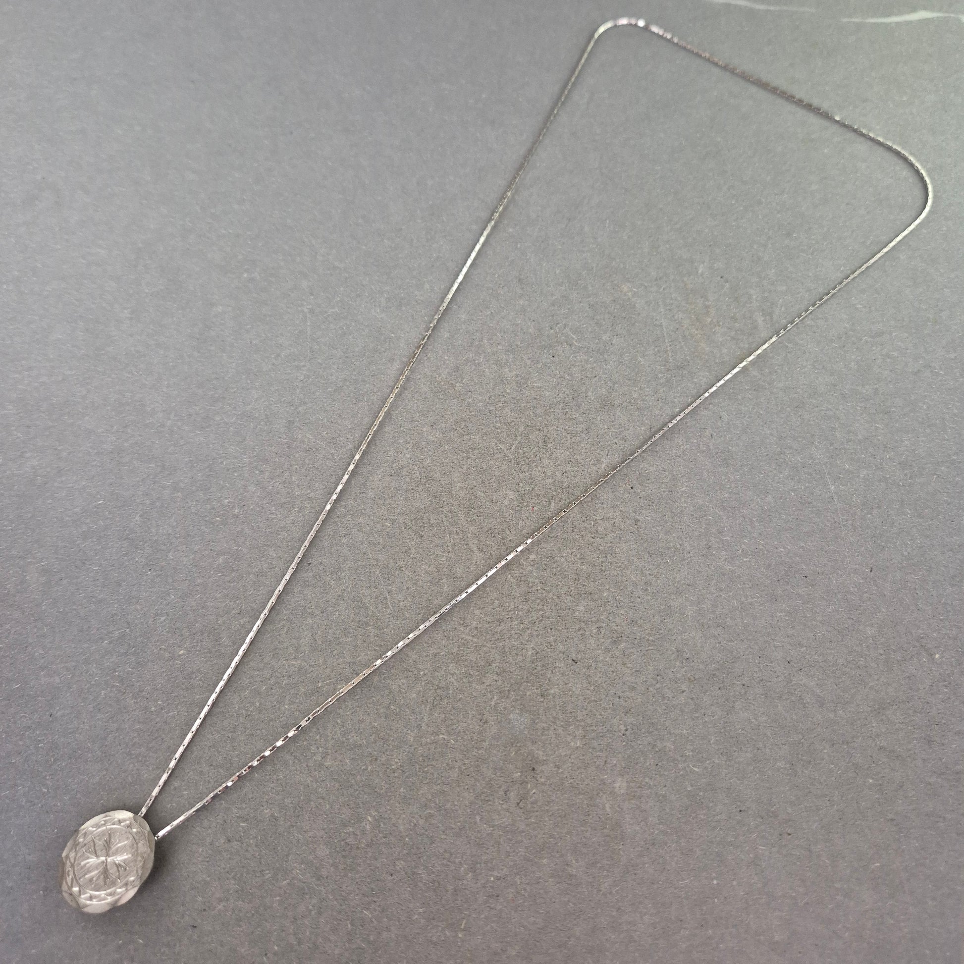 Diese Vintage Kette wird durch ihren runden Anhänger mit kunstvoll graviertem Muster zum echten Hingucker. Die dezente Kette verleiht dem Schmuckstück eine schlichte Eleganz, während der Anhänger durch sein detailreiches Design eine besondere Note erhält. Ein stilvolles Accessoire für Liebhaber klassischer Schmuckstücke.