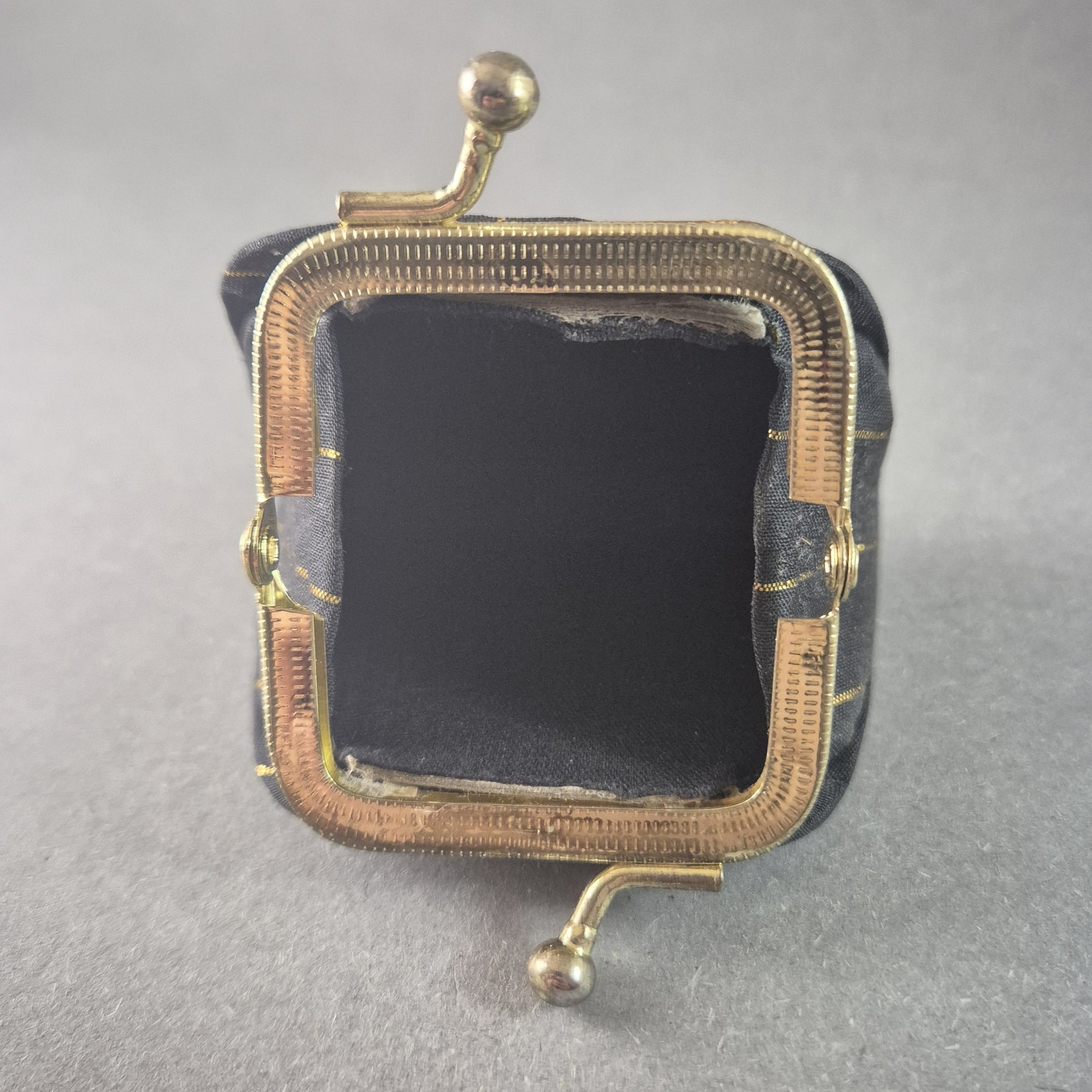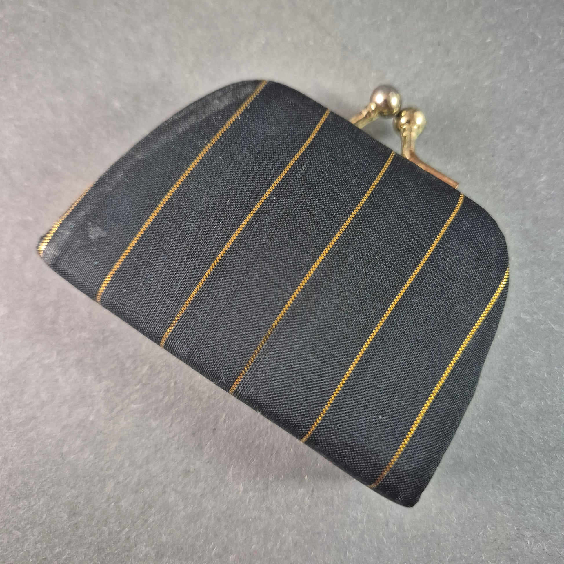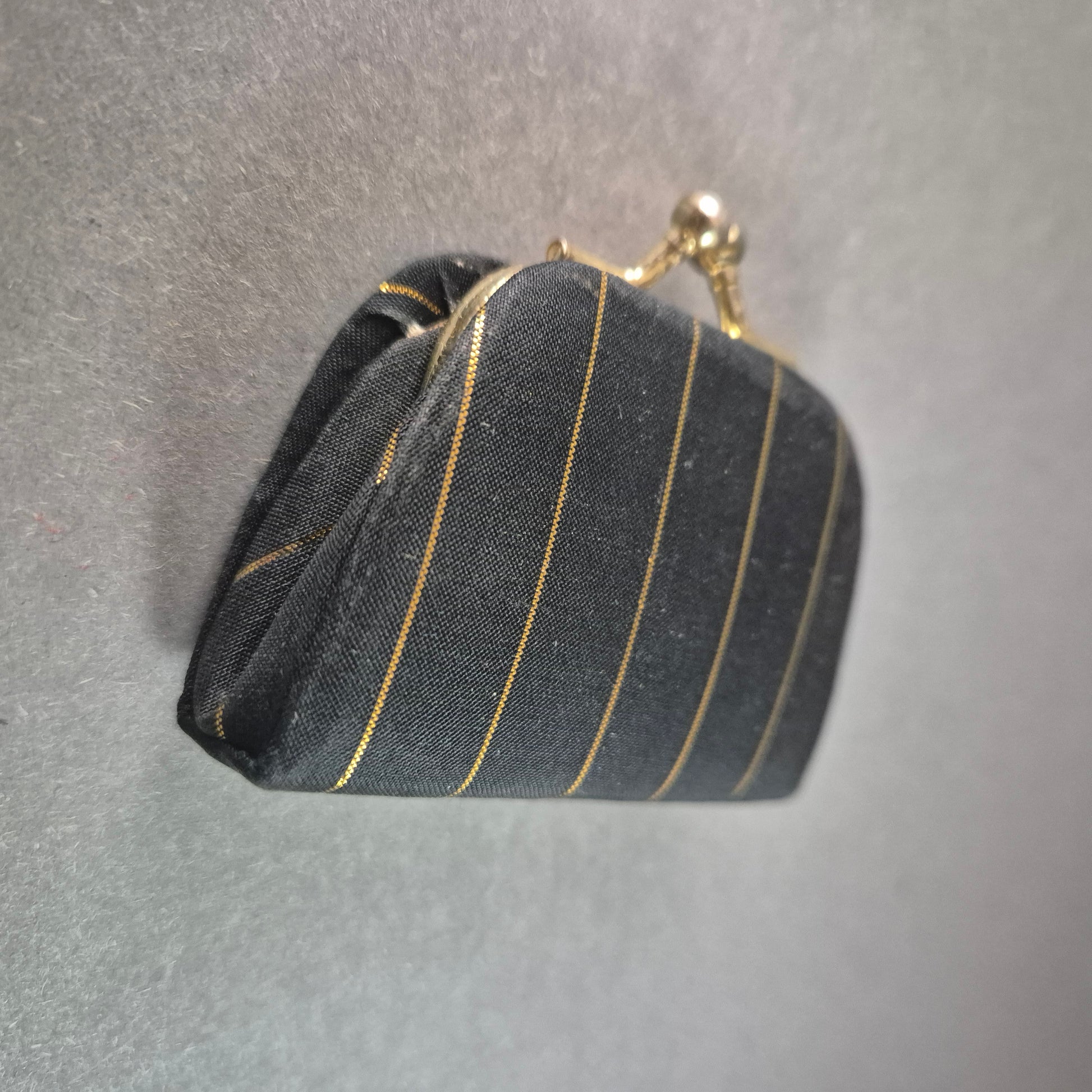 Diese elegante Vintage-Kleingeldbörse kombiniert ein klassisches Design mit einem zeitlosen Streifenmuster. Das robuste Textilmaterial mit feinen goldfarbenen Linien verleiht ihr eine edle Optik. Der traditionelle Metallrahmen mit Kugelverschluss sorgt für sicheren Halt und eine nostalgische Note. Ideal für den stilbewussten Träger oder als besonderes Sammlerstück.