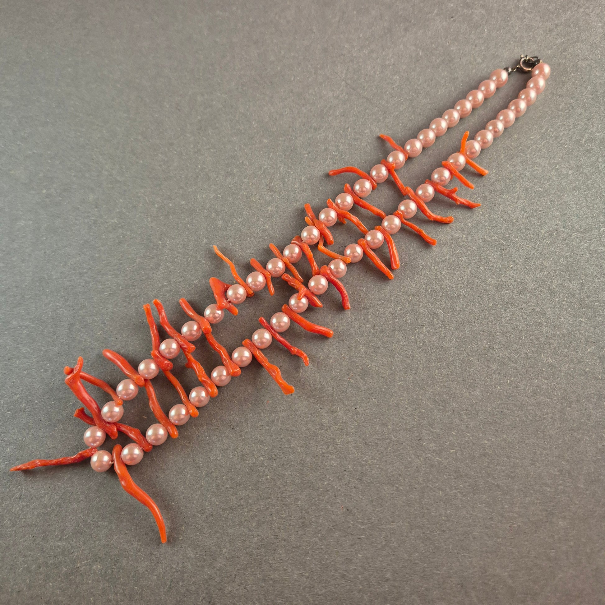 Diese außergewöhnliche Vintage-Halskette kombiniert echte rote Korallenstücke mit zarten rosafarbenen Perlen zu einem faszinierenden Schmuckstück. Die unregelmäßigen Korallenäste verleihen der Kette eine organische, maritime Ästhetik, während die gleichmäßig angeordneten Perlen für einen harmonischen Kontrast sorgen. Der klassische Federringverschluss rundet das Design ab. Perfekt für Liebhaber von Meeresinspirierter Schmuckkunst.