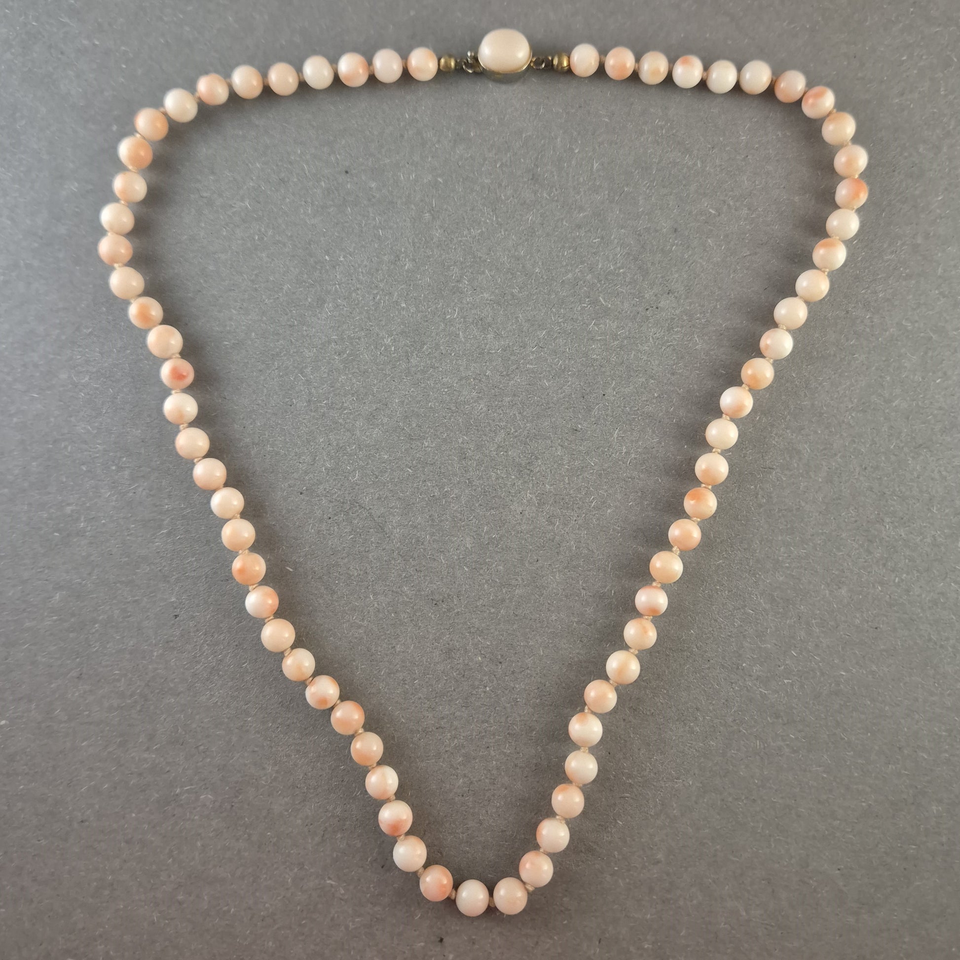 Diese elegante Vintage-Halskette besteht aus zarten, lachsfarbenen Korallenperlen, die durch ihren natürlichen Farbverlauf und sanften Glanz bestechen. Der ovale Verschluss mit passender Koralleneinlage und vergoldeten Details sorgt für einen sicheren Halt und unterstreicht das edle Design.