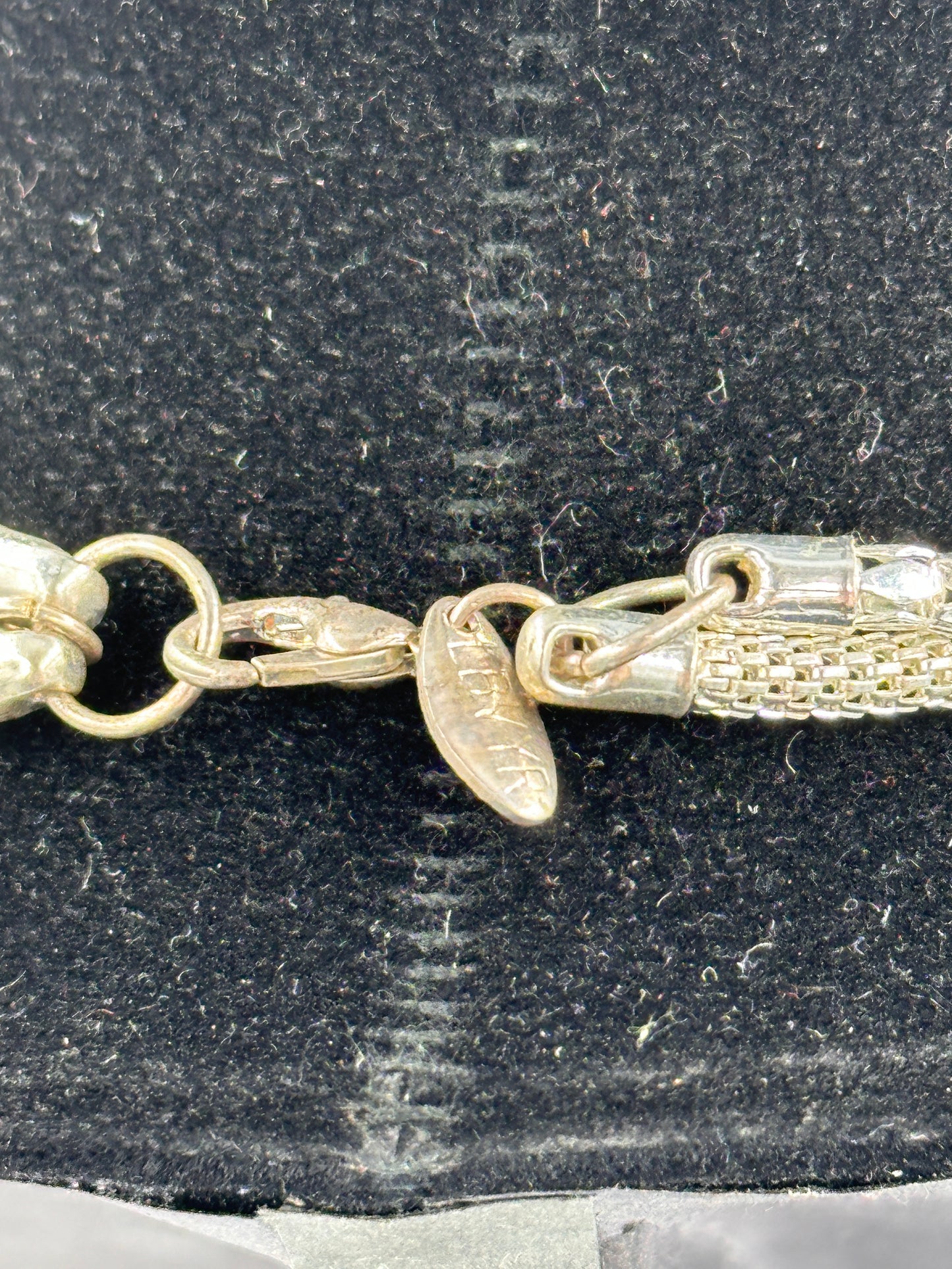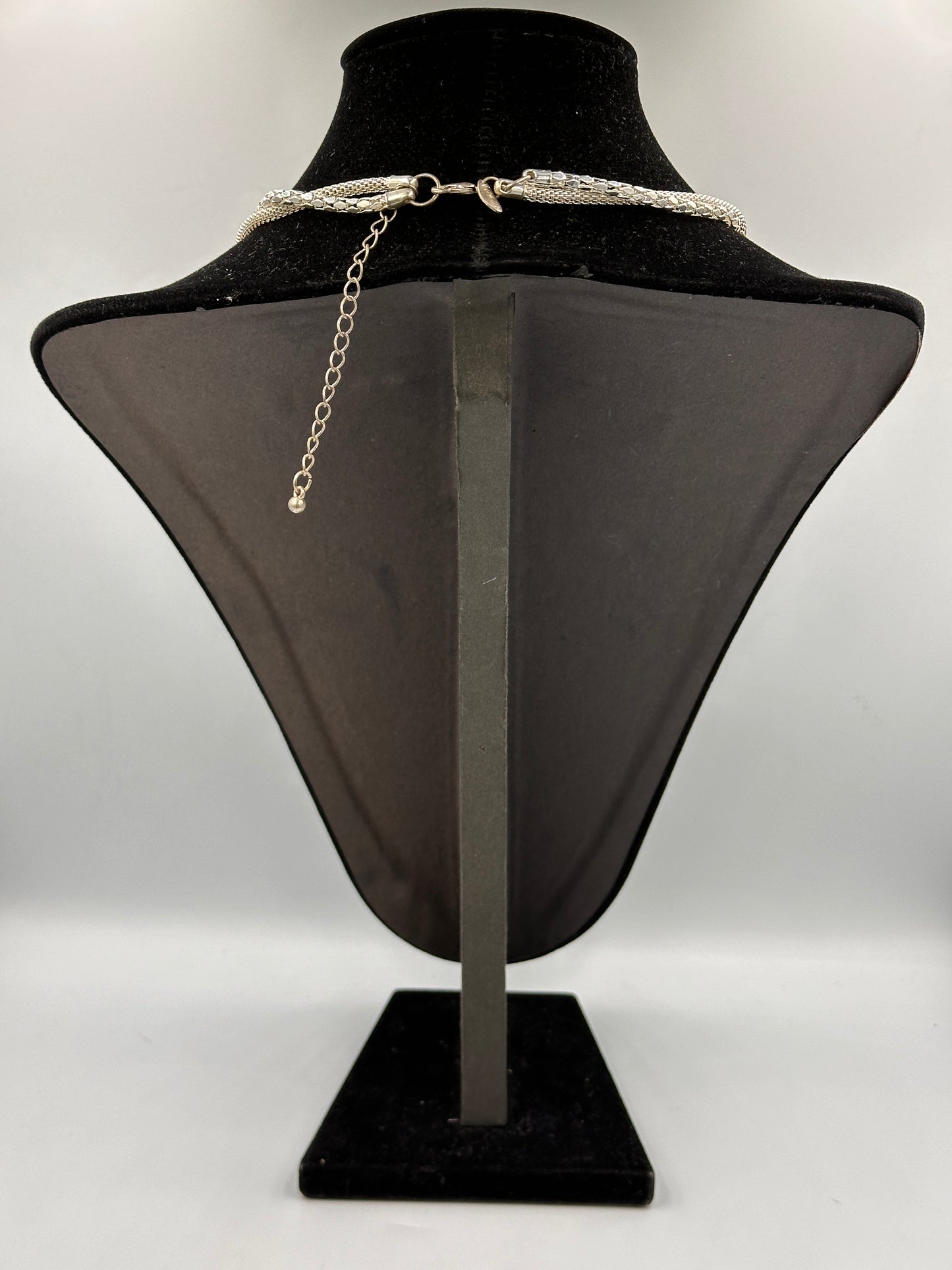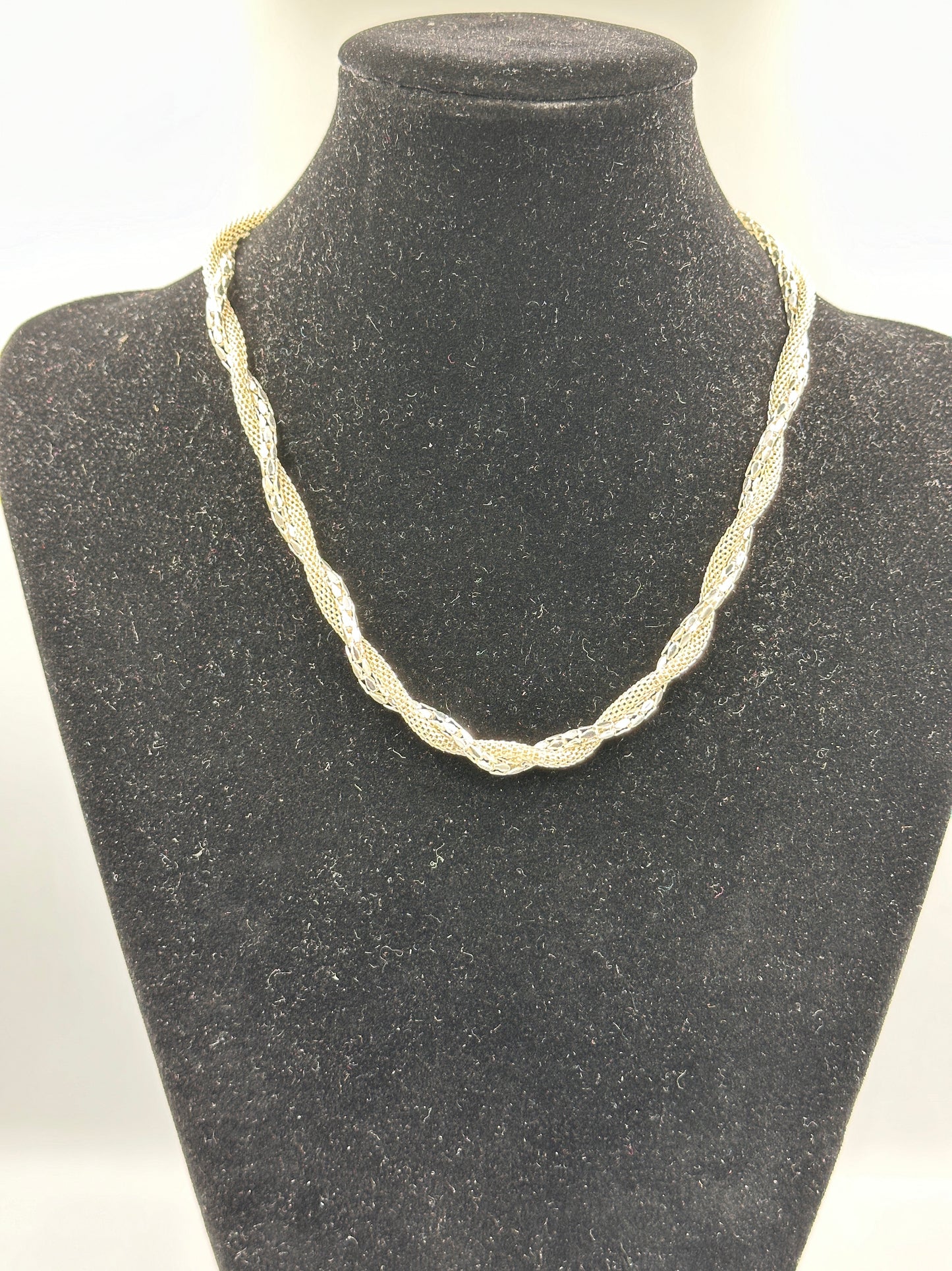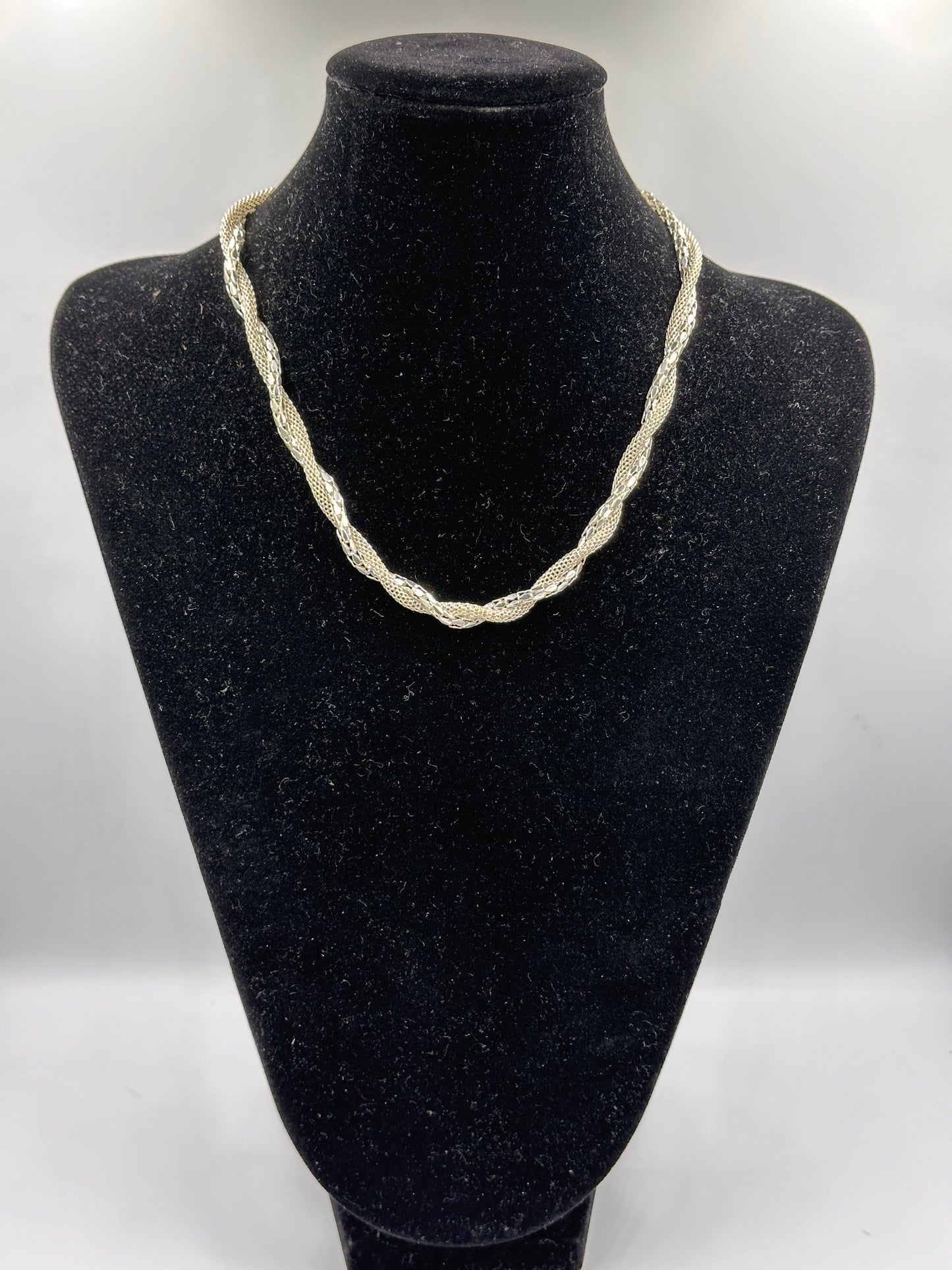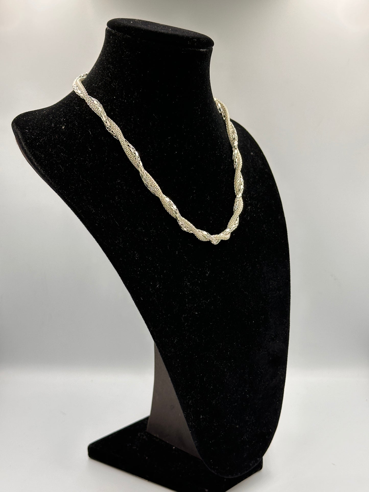 Beschreibung: Diese elegante silberfarbene Halskette von LBVYR besticht durch ihr einzigartiges verdrehtes Design, das einen Vintage-Charme ausstrahlt. Sie ist 40 cm lang und wiegt 13,76 Gramm. Trotz ihres gebrauchten Zustands befindet sie sich in ausgezeichnetem Zustand, bereit, um Ihre Kollektion zu ergänzen.