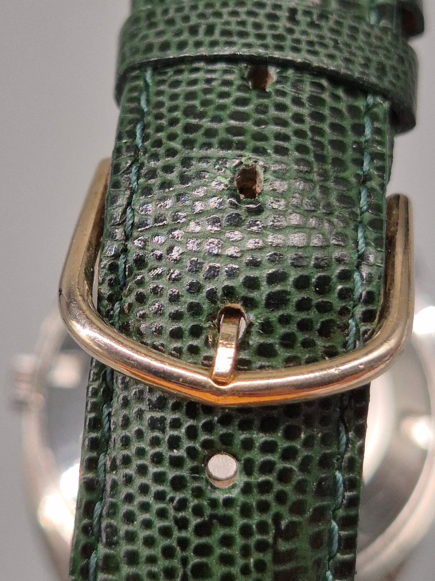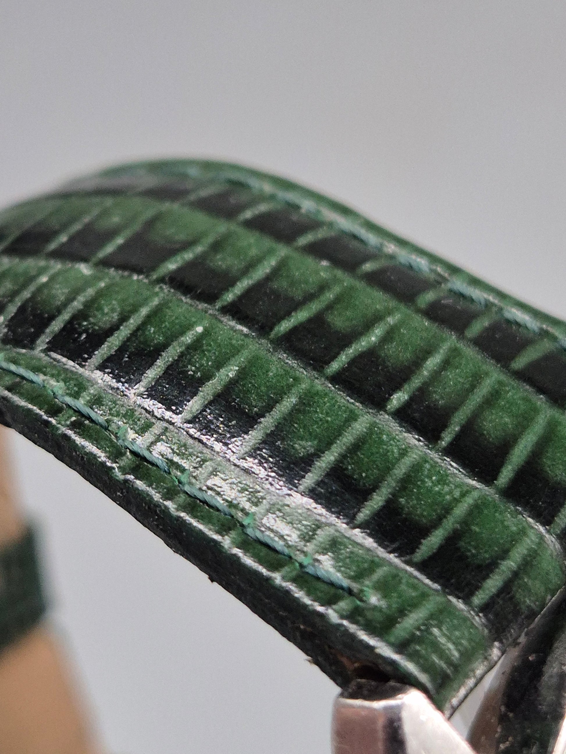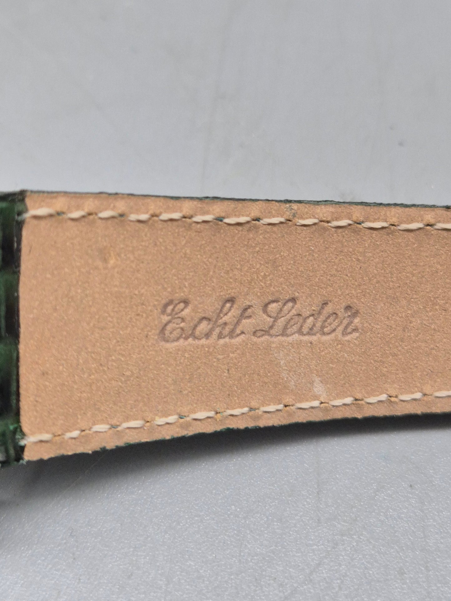 Diese klassische Longines Admiral Automatic überzeugt durch ihr zeitloses Design und solide Verarbeitung. Im silberfarbenen, sonnenstrahlgestrahlten Zifferblatt entfalten sich schlanke Indexe und elegante Zeiger, ergänzt durch ein klares Datumsfenster bei 3 Uhr. Das Edelstahlgehäuse geht harmonisch in ein dunkelgrünes Lederband über – innen mit „Echt Leder“ geprägt. Die verschraubte Krone trägt das Longines‑Logo und unterstreicht die hohe Detailverarbeitung.