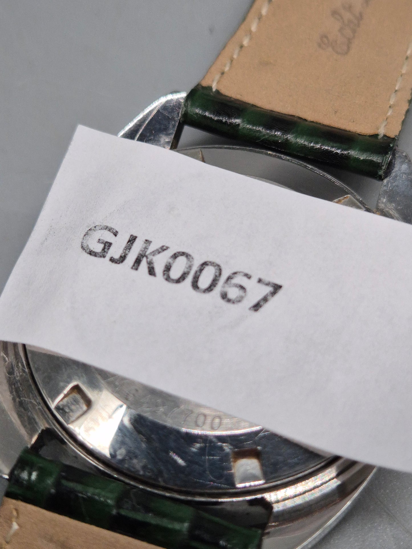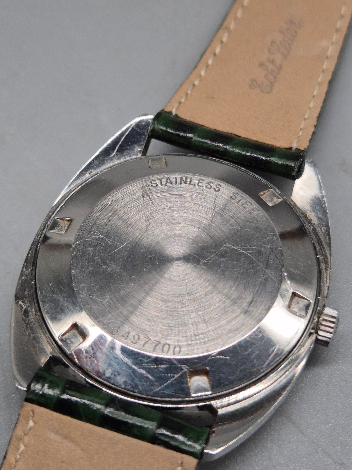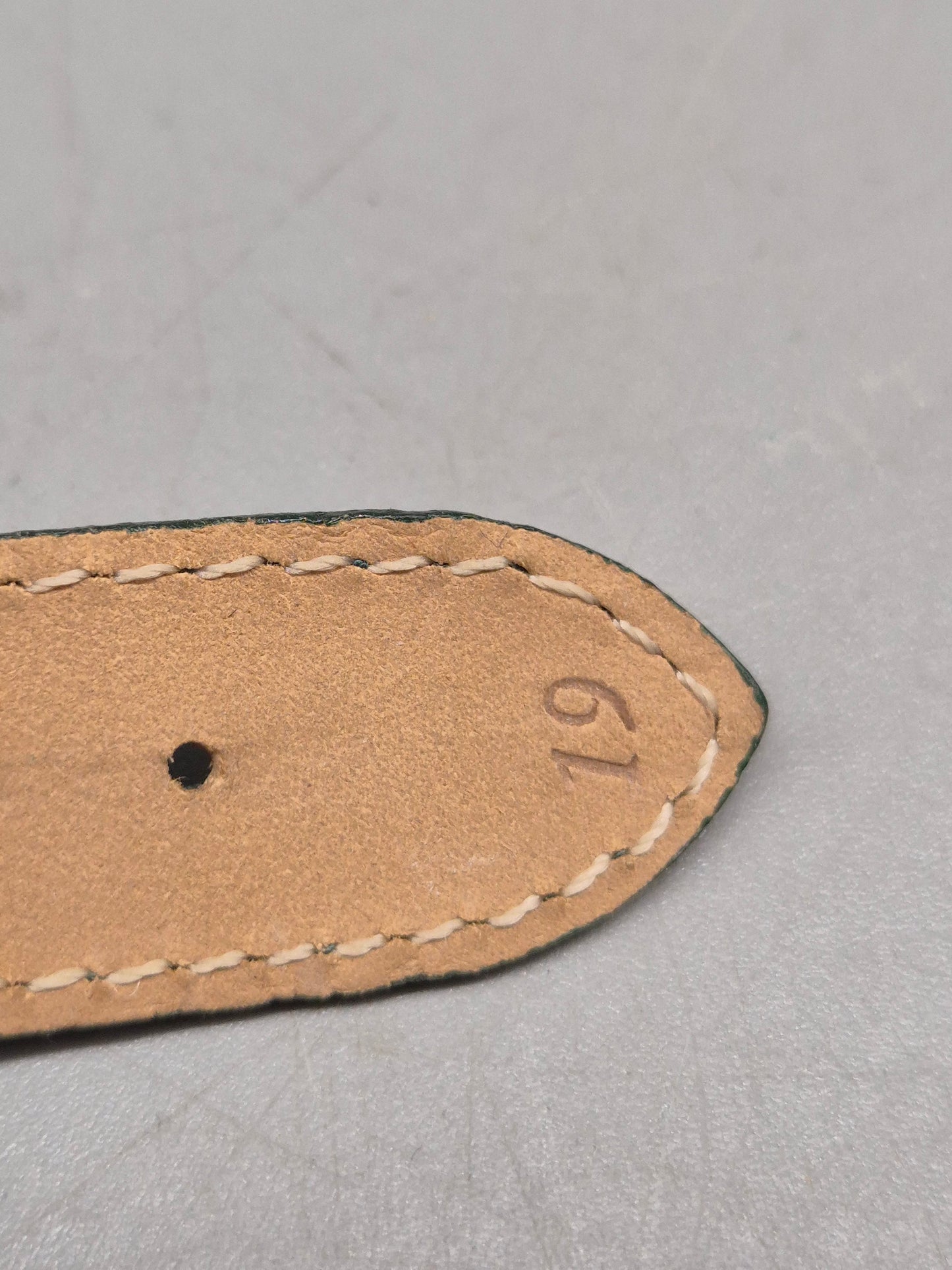 Diese klassische Longines Admiral Automatic überzeugt durch ihr zeitloses Design und solide Verarbeitung. Im silberfarbenen, sonnenstrahlgestrahlten Zifferblatt entfalten sich schlanke Indexe und elegante Zeiger, ergänzt durch ein klares Datumsfenster bei 3 Uhr. Das Edelstahlgehäuse geht harmonisch in ein dunkelgrünes Lederband über – innen mit „Echt Leder“ geprägt. Die verschraubte Krone trägt das Longines‑Logo und unterstreicht die hohe Detailverarbeitung.