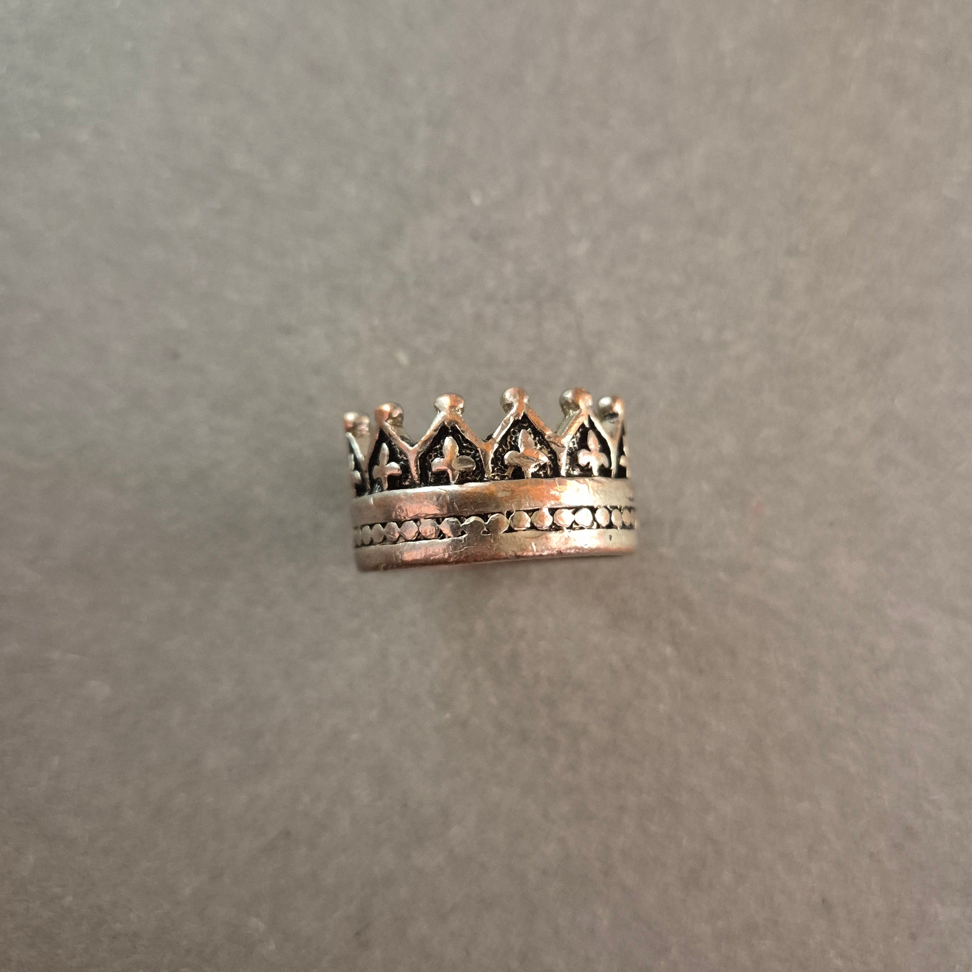 Dieser eindrucksvolle Vintage-Ring in Form einer detailreichen Krone zieht alle Blicke auf sich. Die filigranen Verzierungen, kombiniert mit der offenen, erhöhten Krönchenstruktur, machen ihn zu einem außergewöhnlichen Accessoire für modebewusste Persönlichkeiten. Hergestellt aus versilbertem Metall, bietet der Ring einen antiken Look mit leichtem Gothic- oder Mittelalter-Flair.