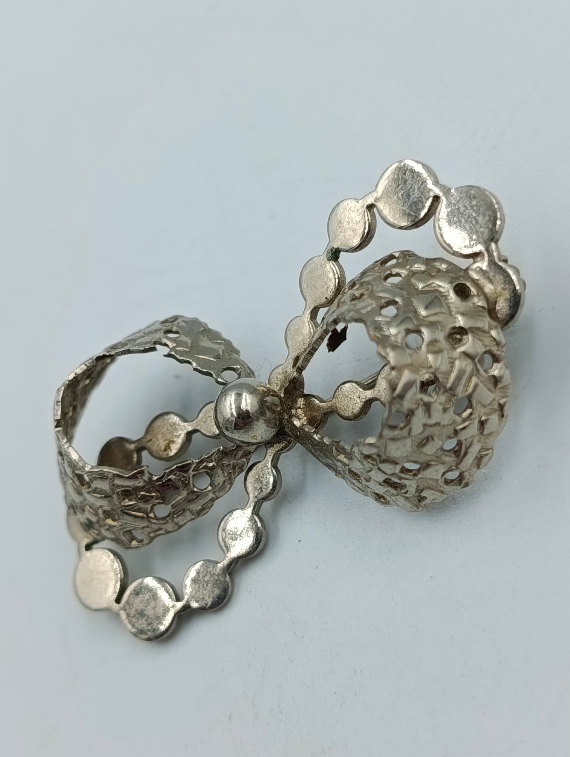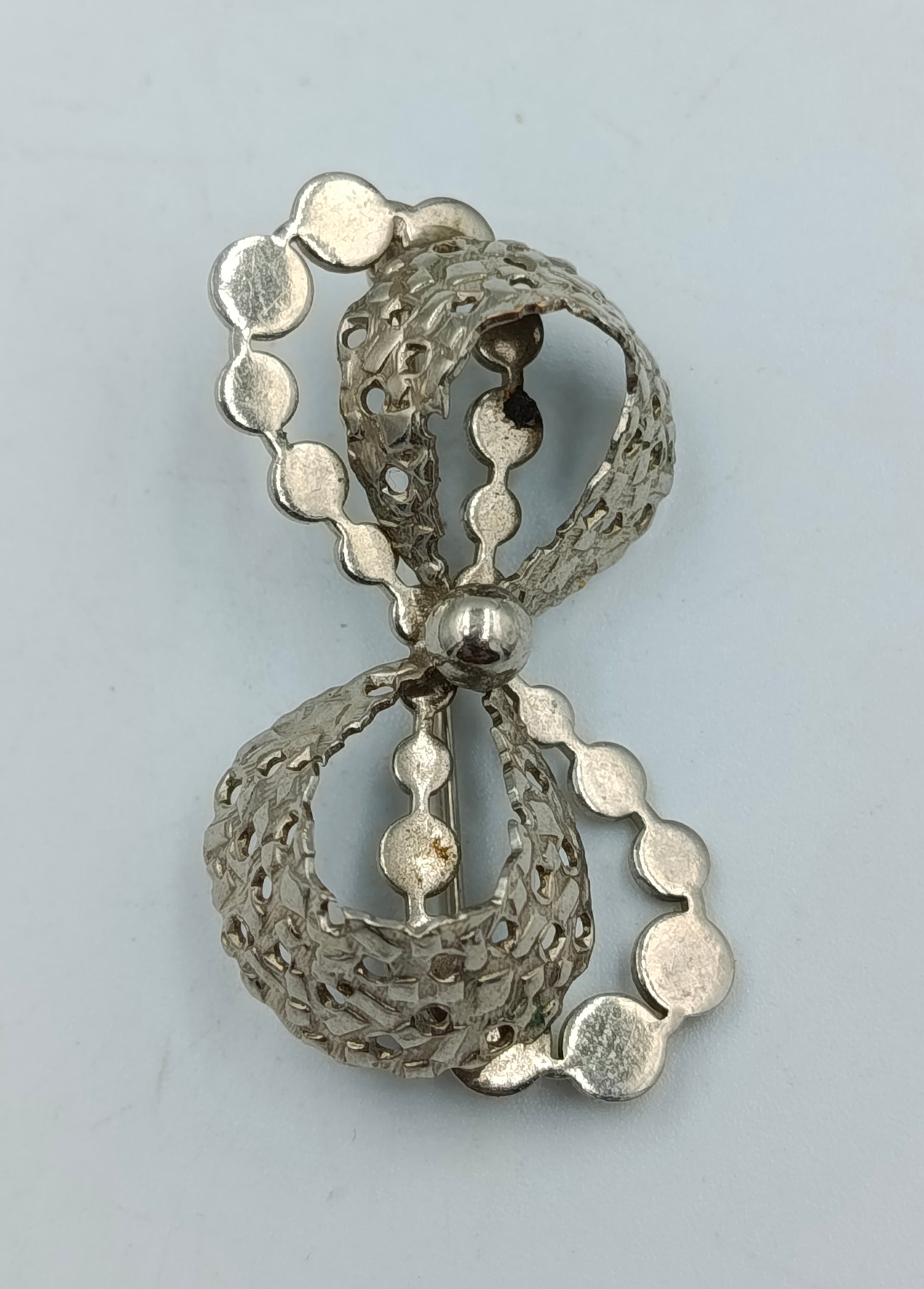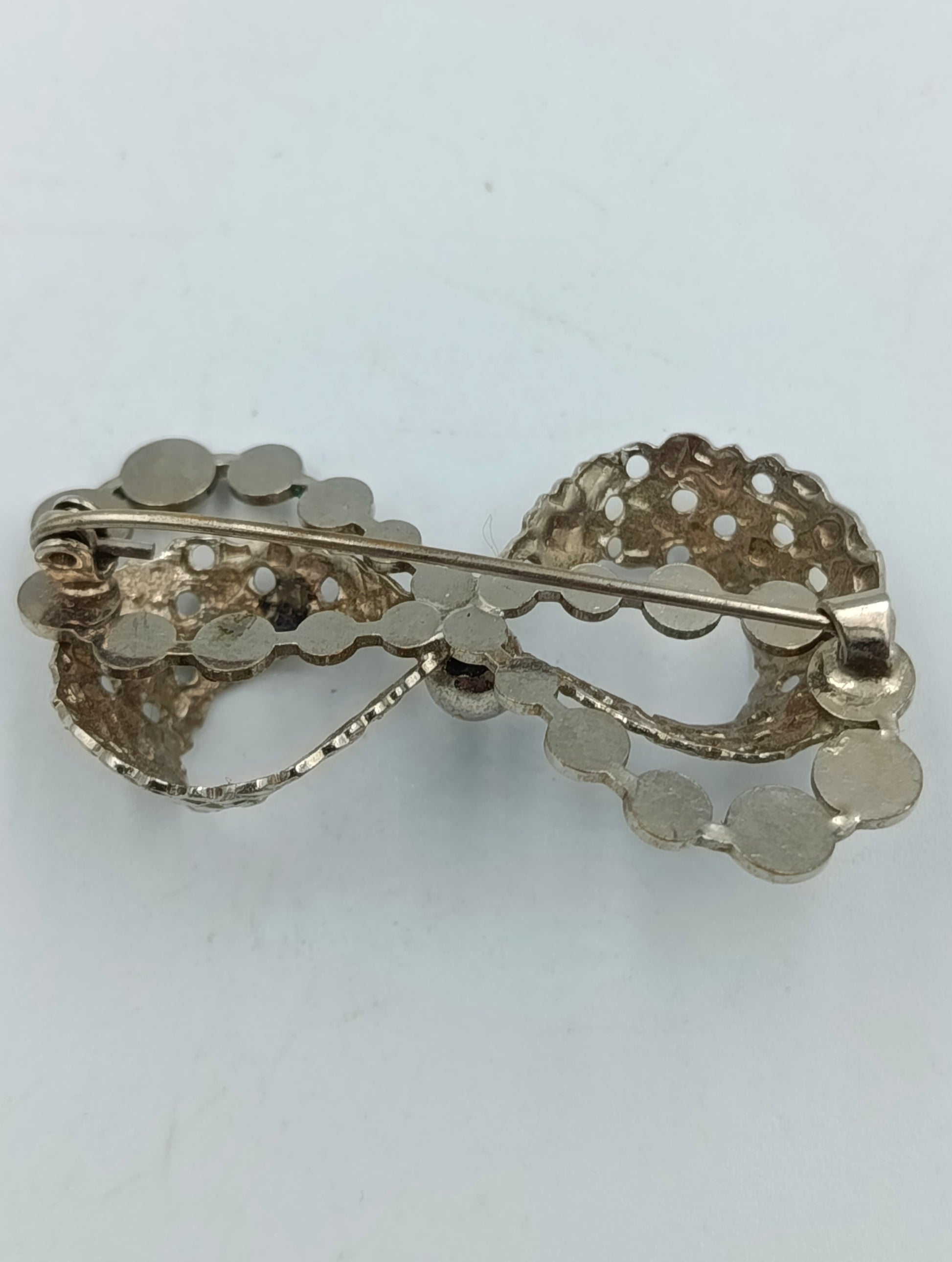 Elegante silberfarbene Brosche in Form einer filigranen Schleife. Das fein gearbeitete Design mit durchbrochenen Details und runden Elementen verleiht ihr einen klassischen Vintage-Charme. Ideal als stilvolles Accessoire für Blusen, Schals oder Jacken.