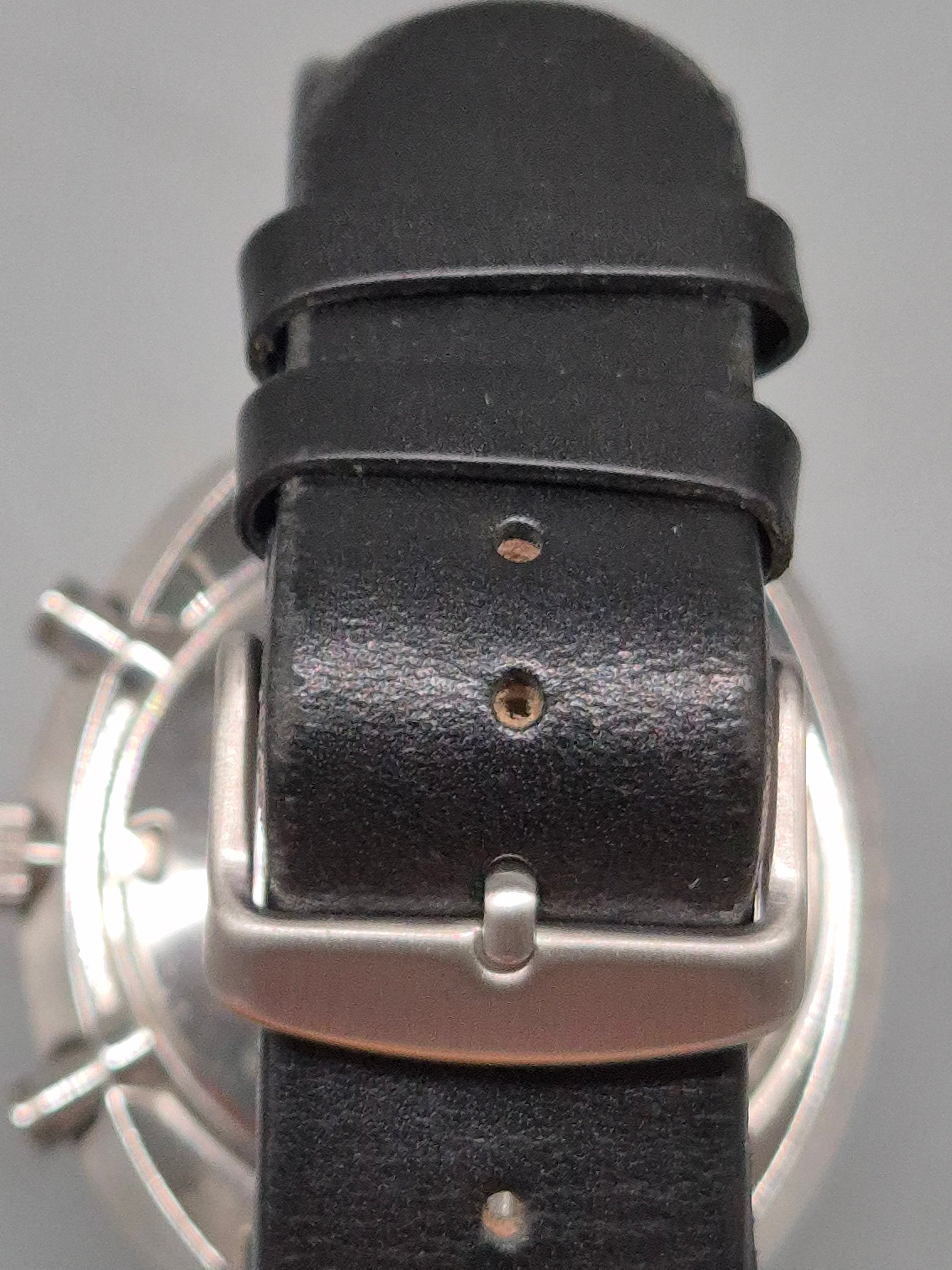 Diese klassische Seiko Herren Uhr aus den 1970er Jahren besticht durch ihr markantes, kissenförmiges Edelstahlgehäuse und den sportlichen Chronographen-Look mit Tachymeter-Skala. In ihrem schwarzen Zifferblatt brillieren zwei cremefarbene Totalisatoren und leuchtende Zeiger, während das automatische Seiko-6139-Kaliber die Tages- und Datumsanzeige zuverlässig steuert. Der beigefarbene Lederboden verweist auf ein echtes Lederband in 20 mm Breite.
