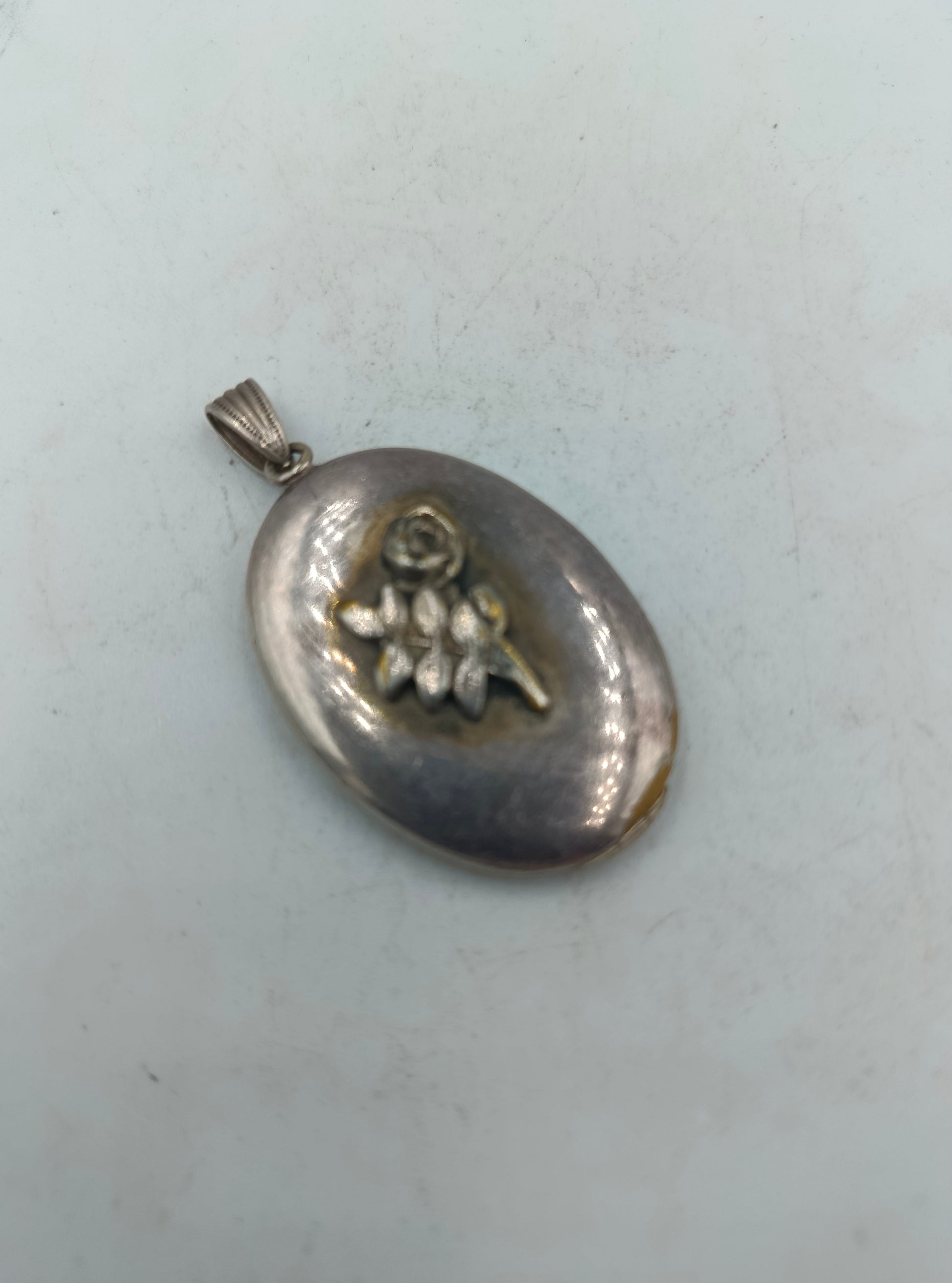 Dieses charmante, ovale Vintage-Medaillon ist aus 925er Sterlingsilber gefertigt und verfügt über ein fein gearbeitetes, plastisches Blumenmotiv auf der Vorderseite. Es lässt sich öffnen und bietet Platz für zwei kleine Fotos oder Erinnerungsstücke im Inneren. Der Anhänger zeigt altersbedingte Gebrauchsspuren, die seinen authentischen, antiken Charakter unterstreichen.