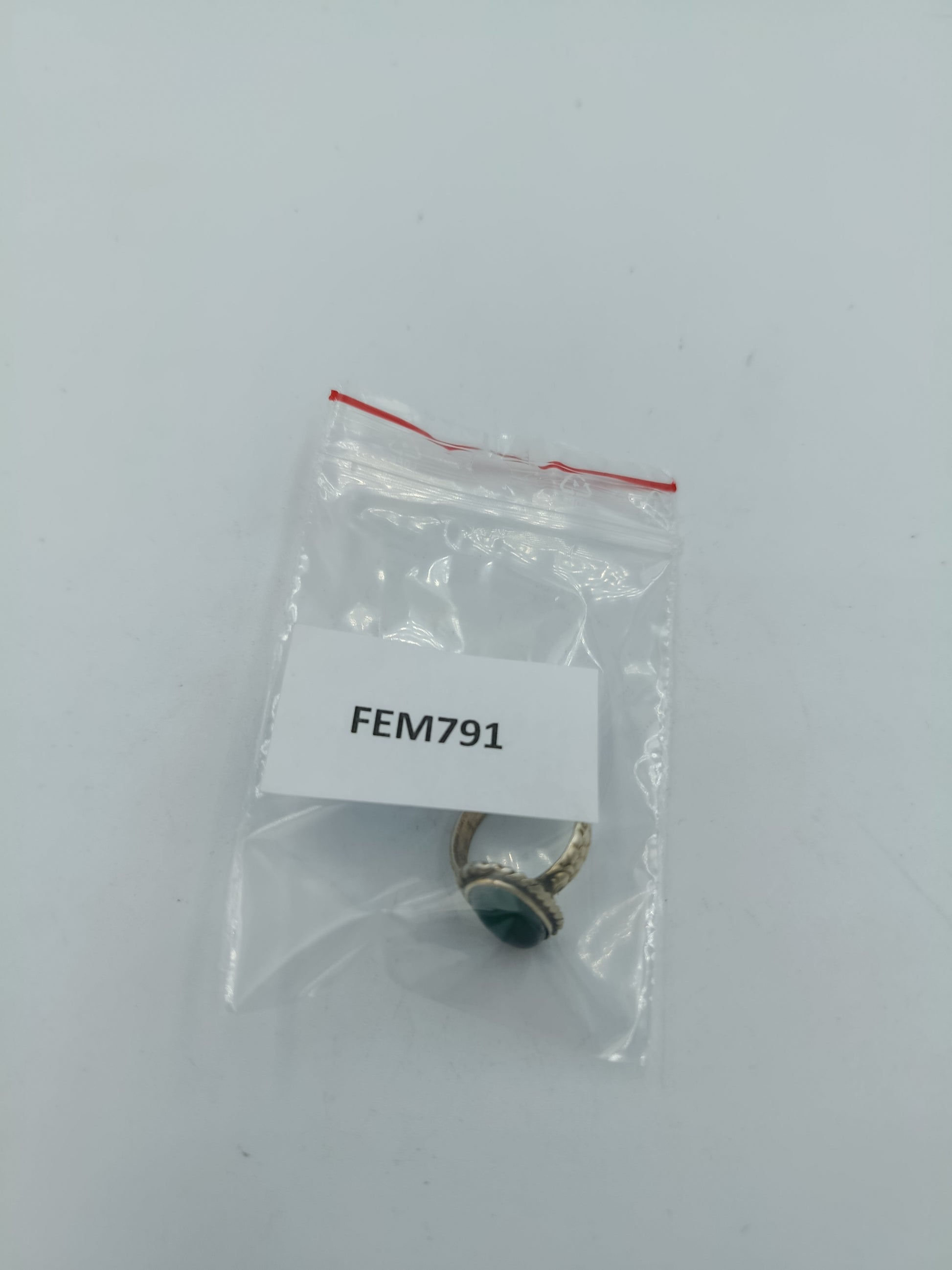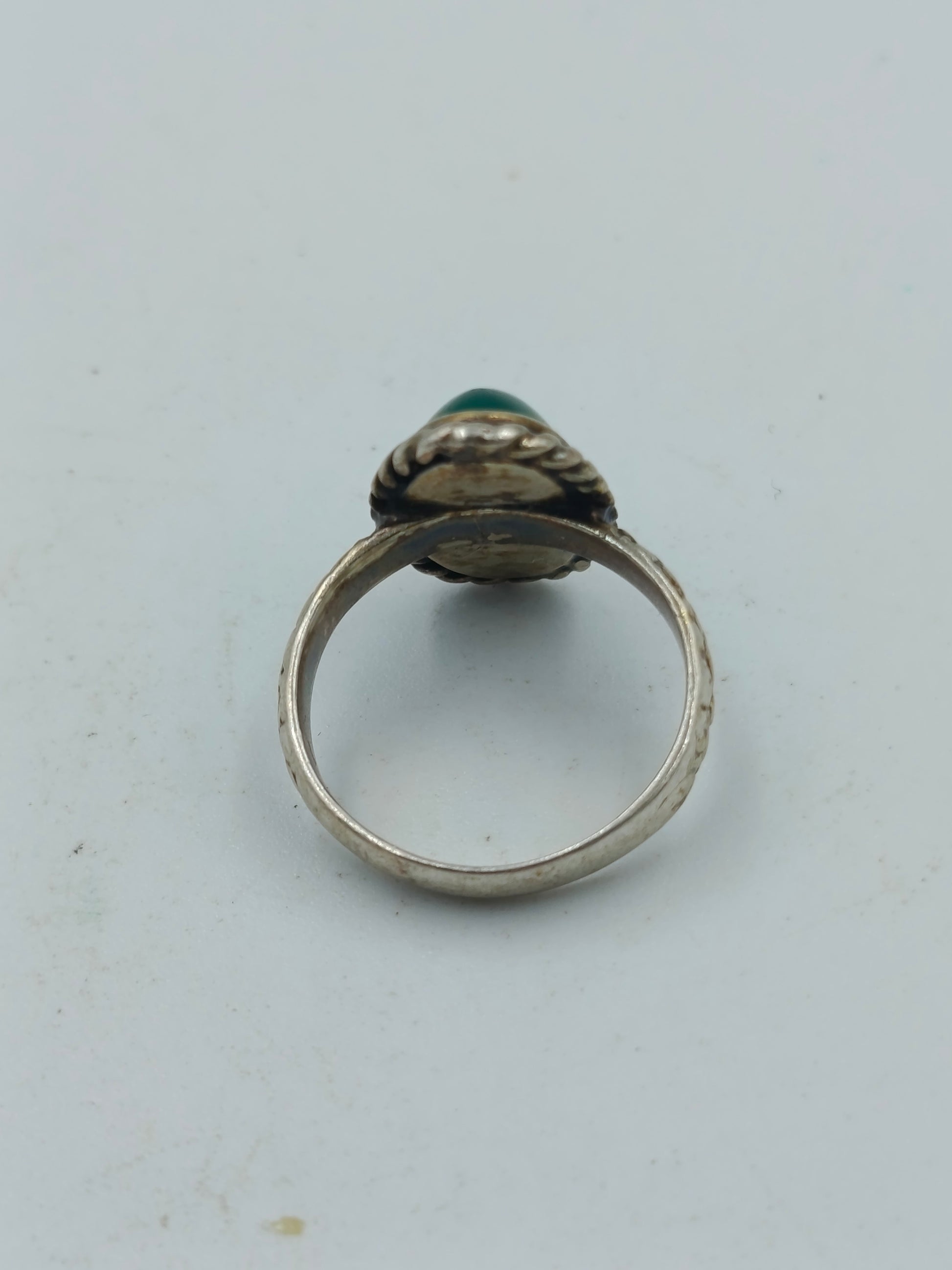 Feiner Vintage-Ring aus Silber mit einem ovalen, tiefgrünen Stein als Mittelstück. Die handgearbeitete Fassung und die dezente Musterung der Ringschiene verleihen ihm einen eleganten, zeitlosen Charakter – ein stilvolles Schmuckstück mit klassischem Charme.