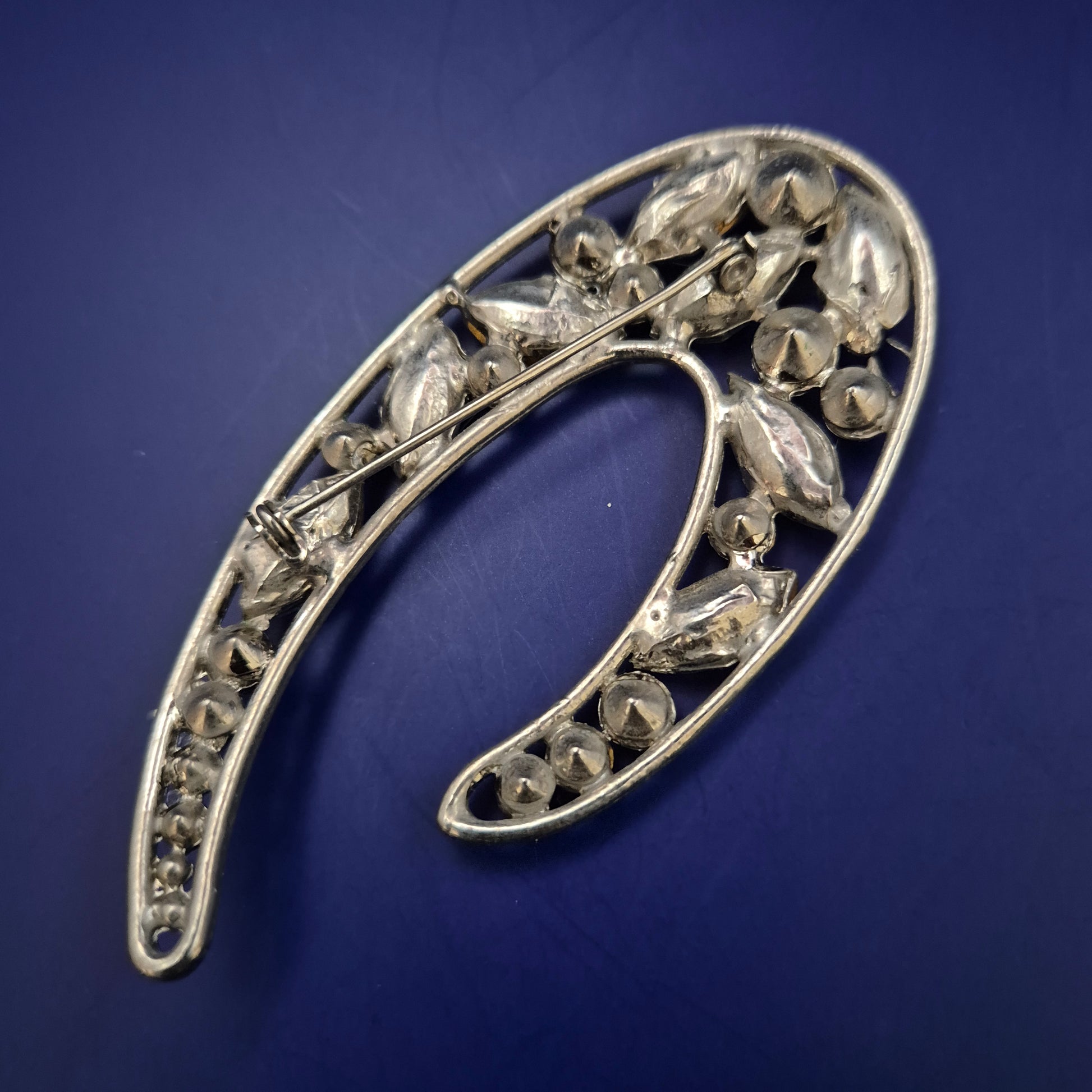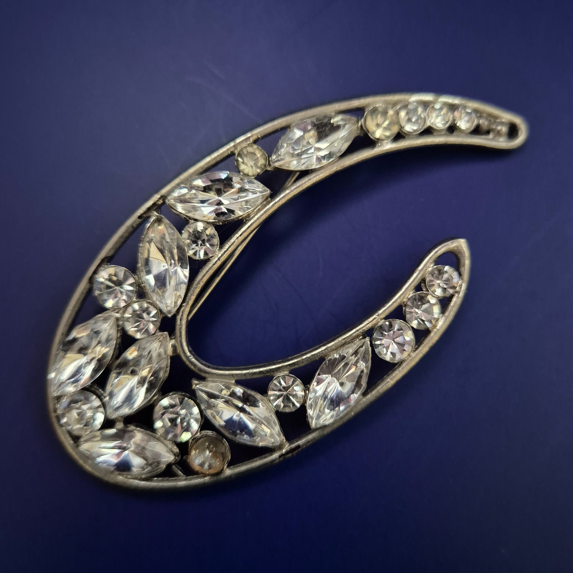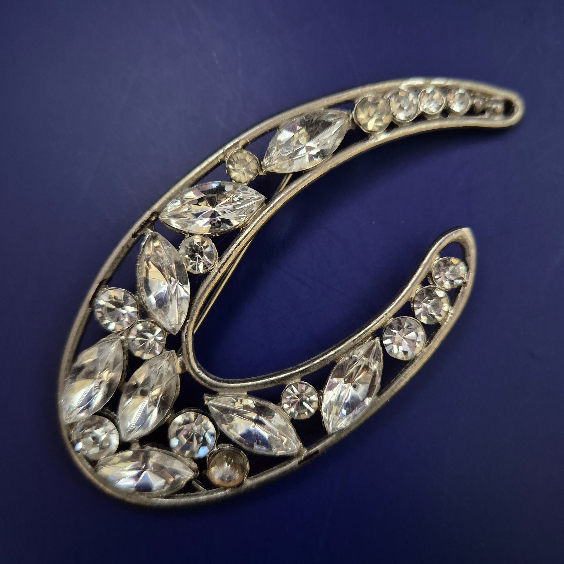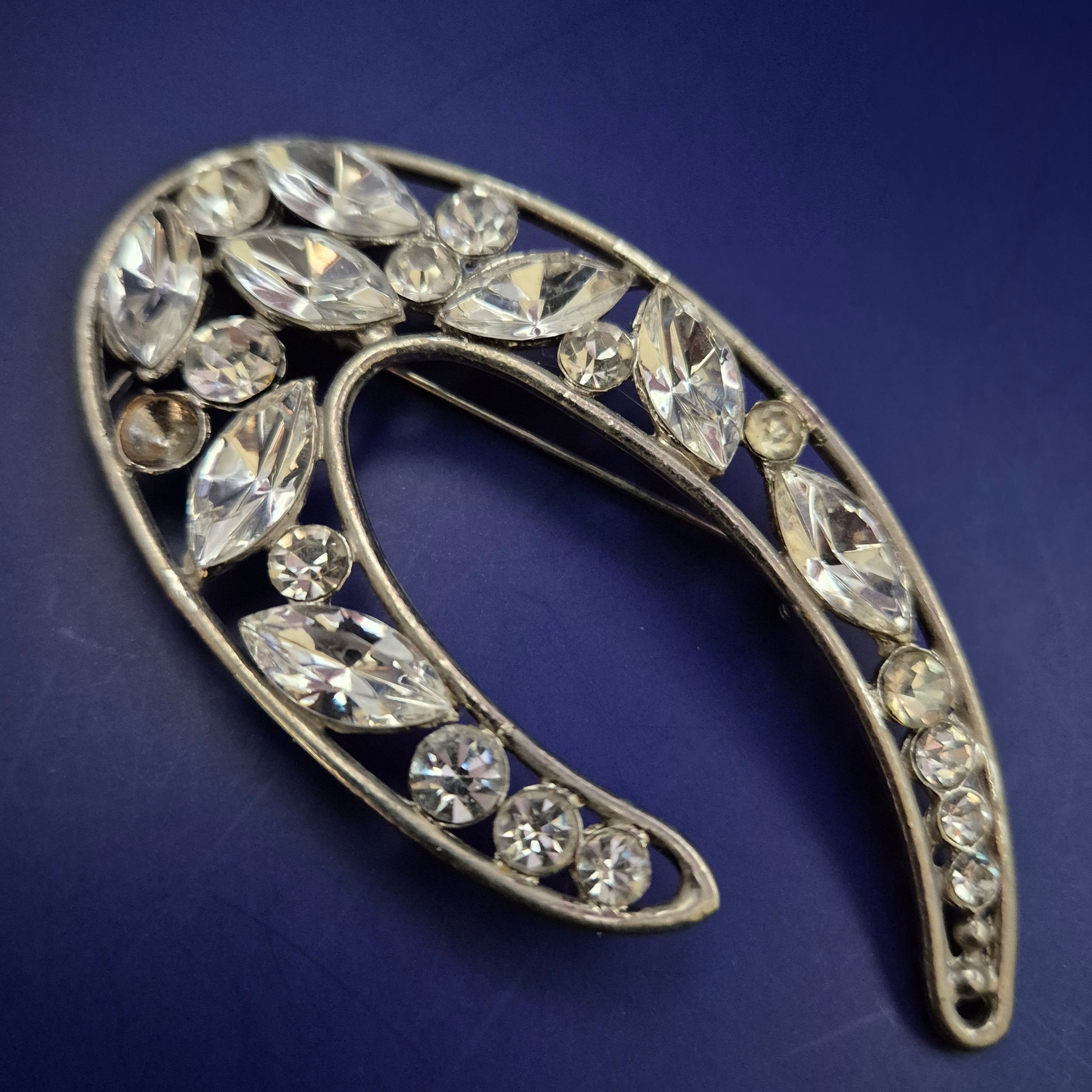 Diese elegante Vintage-Brosche in geschwungener Tropfenform ist mit zahlreichen facettierten Strasssteinen in verschiedenen Größen und Schliffen besetzt. Die klare Glitzeroptik verleiht ihr einen glamourösen Look, ideal für besondere Anlässe oder als glänzender Akzent im Alltag. Das filigrane Metallgestell rundet das Design stilvoll ab.