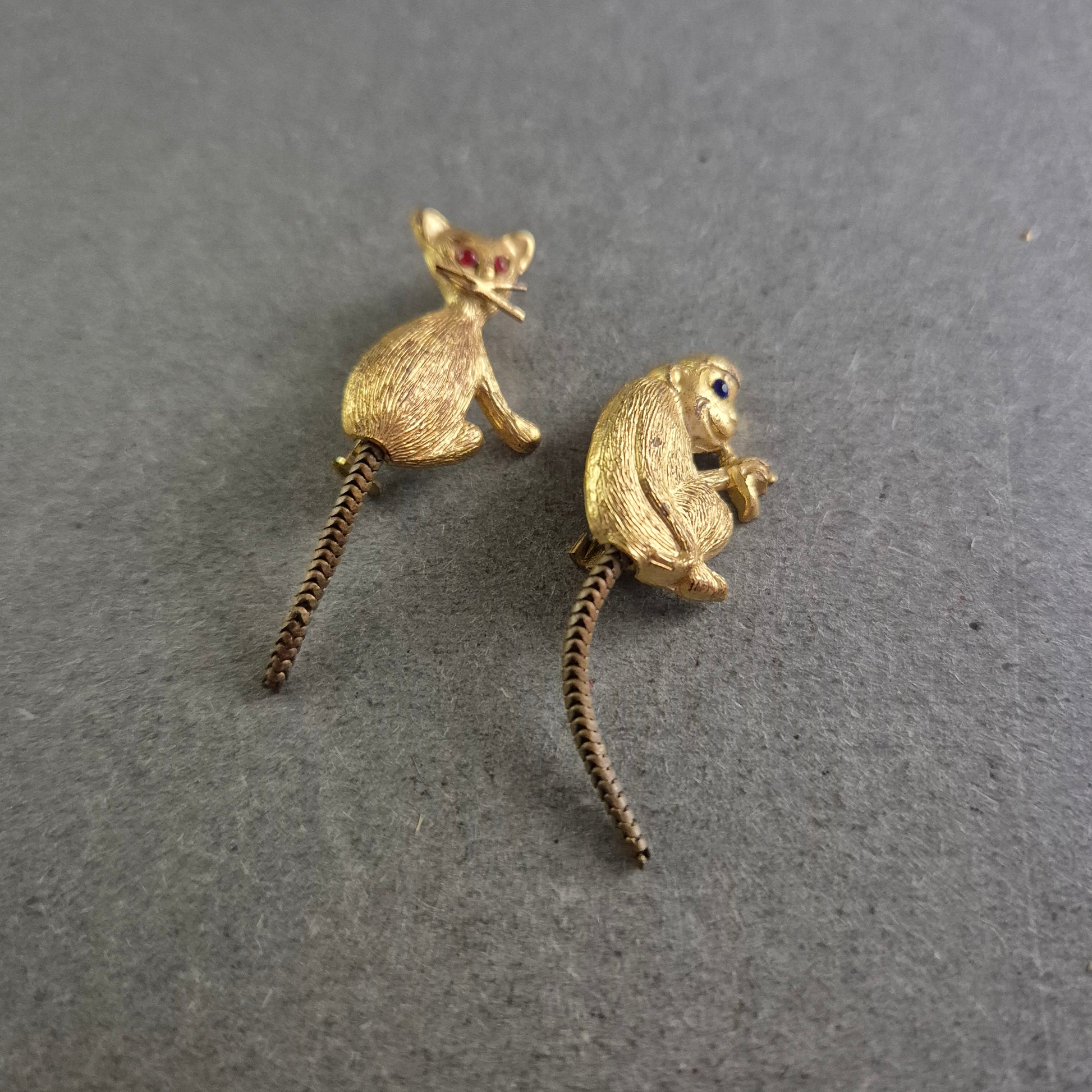 Dieses humorvolle Set aus zwei Vintage-Broschen zeigt eine Katze mit roten Augen und einen Affen mit blauen Augen – beide in goldfarbenem Look und mit beweglichen Spiralschwänzen. Die detaillierte Struktur und die funkelnden Augensteine machen diese Broschen zu originellen Hinguckern für jeden Tierliebhaber oder Sammler ausgefallener Accessoires.